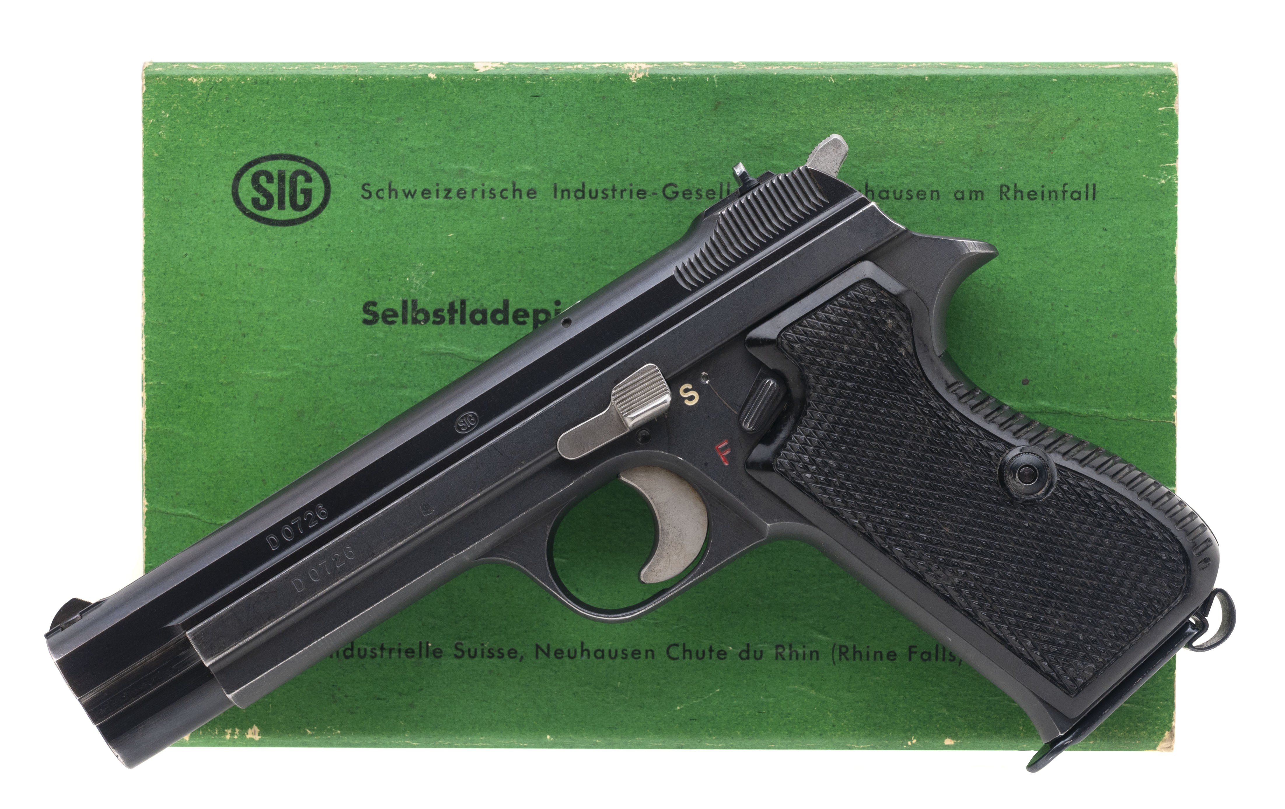 1950's production 9mm with a 4.7" barrel. Bore is excellent. Rare variation of the SIG P210 pistol made for the W. German Border Guards with a loaded chamber indicator on the top of the slide. Very good condition with 90% original finish. Comes with box, manual and cleaning kit. Consignment.