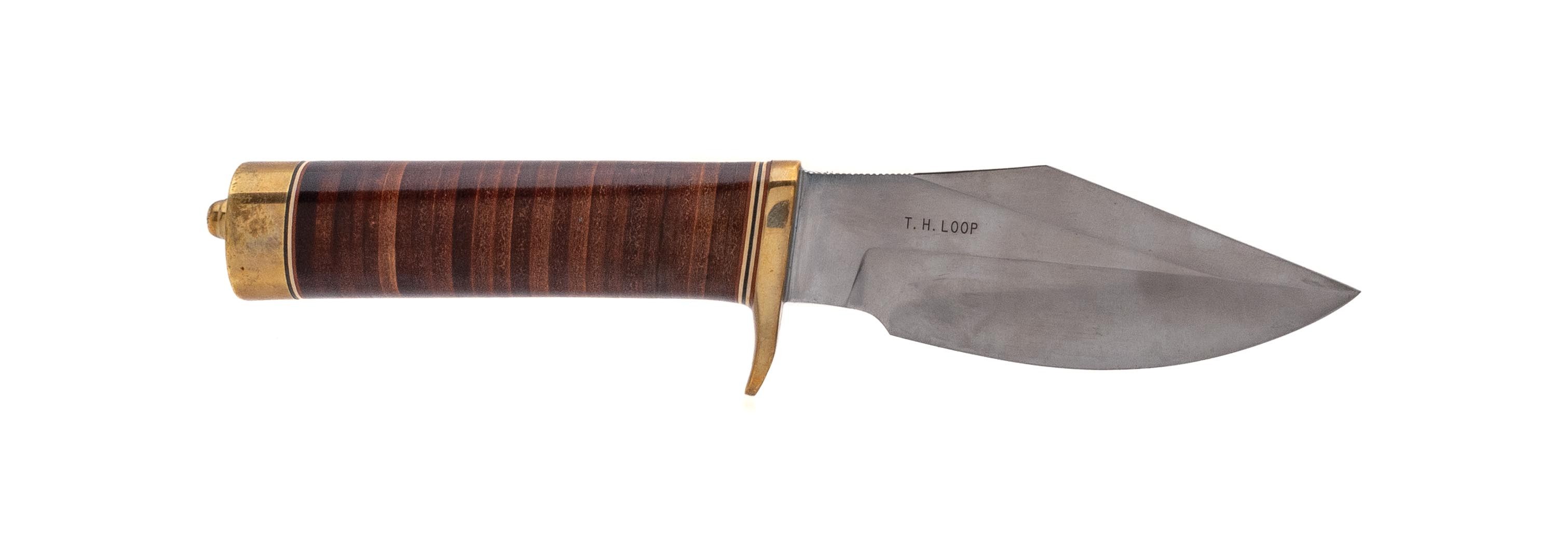 Bushmaster knife with a 4.5" blade, leather handle and brass hilt. Overall condition is excellent.