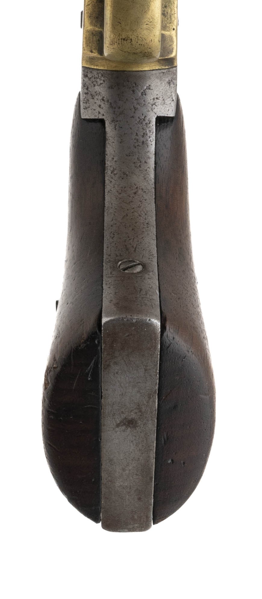 Serial number 94688. 44 caliber with a 8” barrel. Metal has a mottled gray patina. Various inspectors' markings are on the metal.