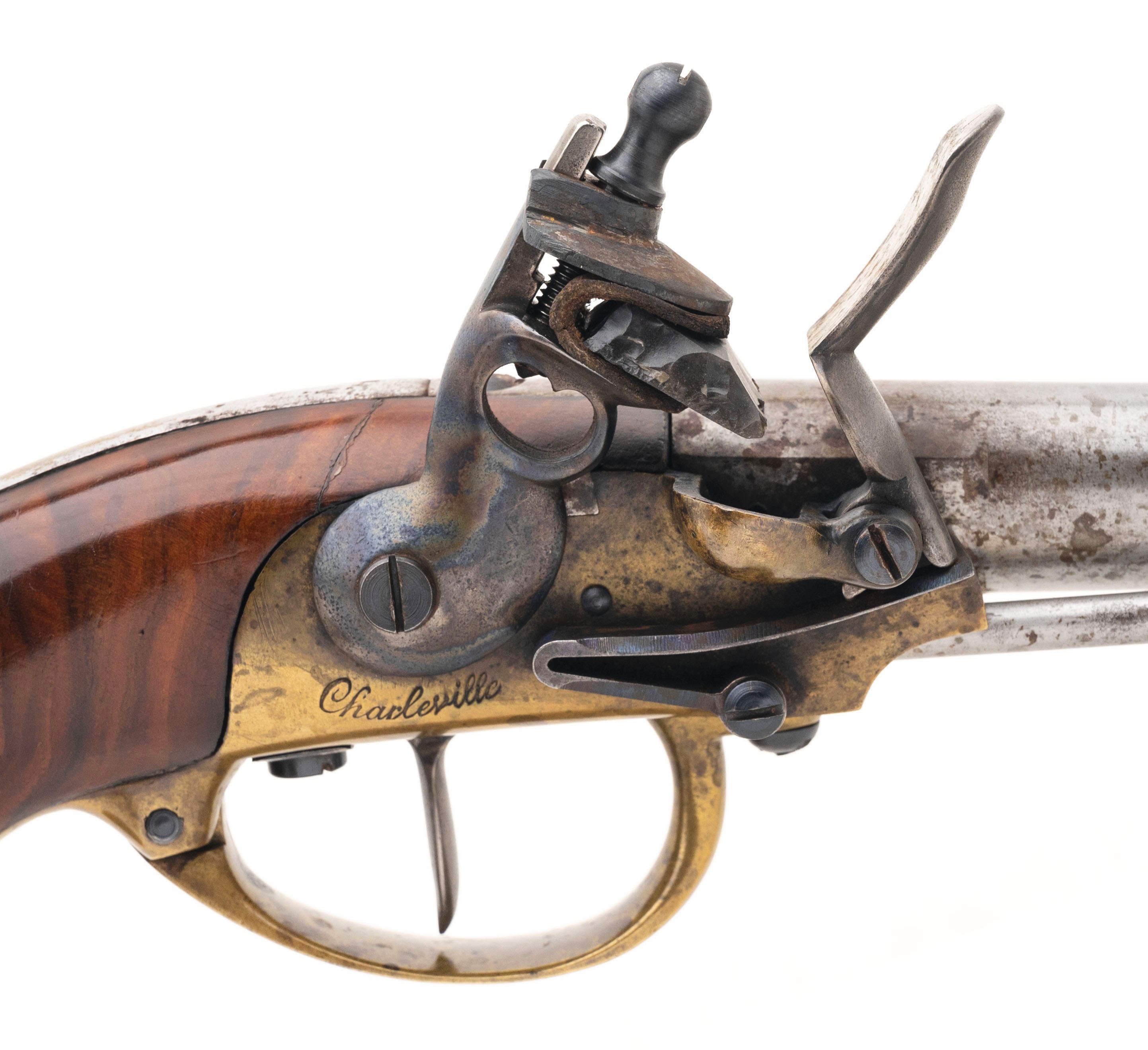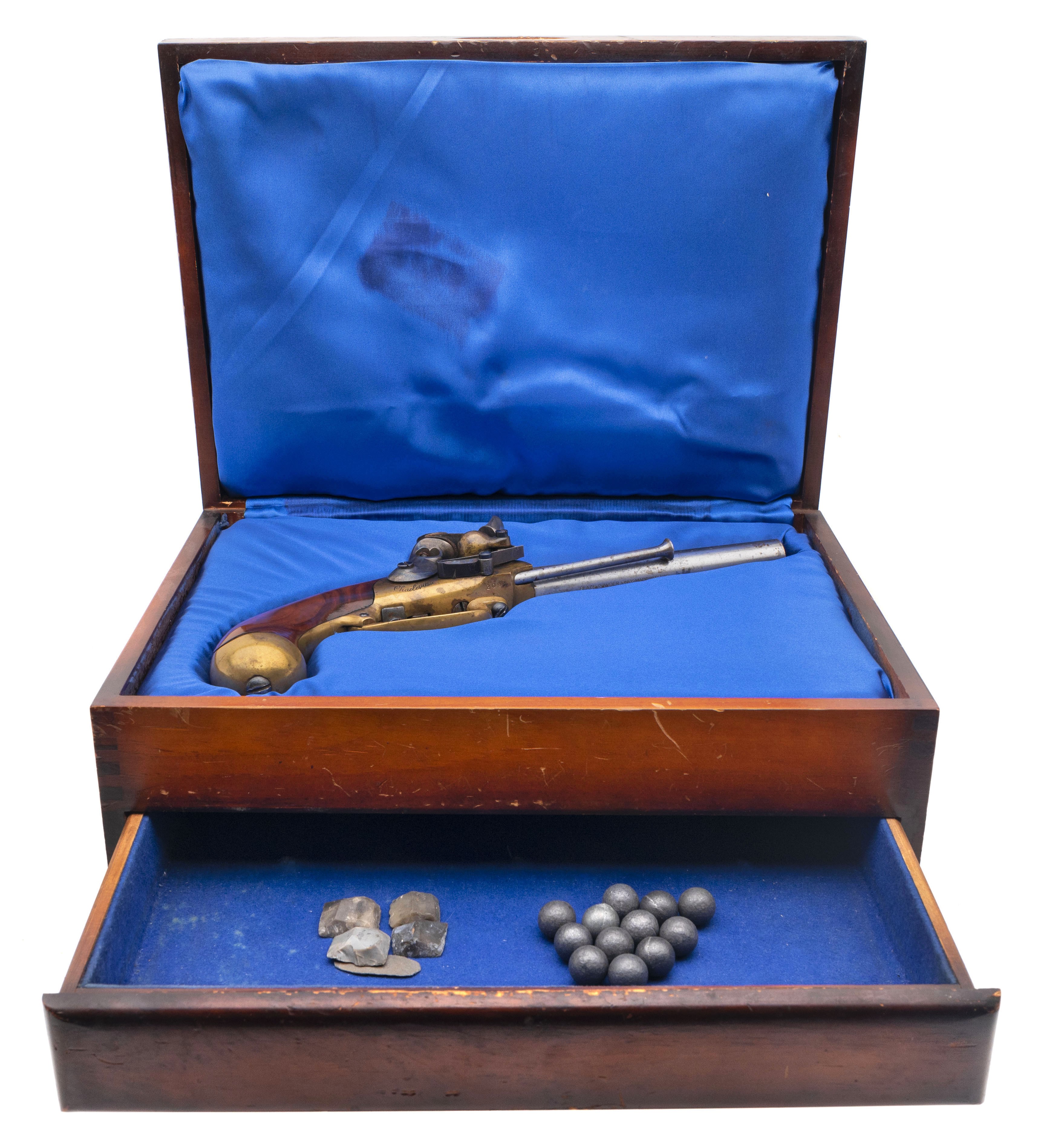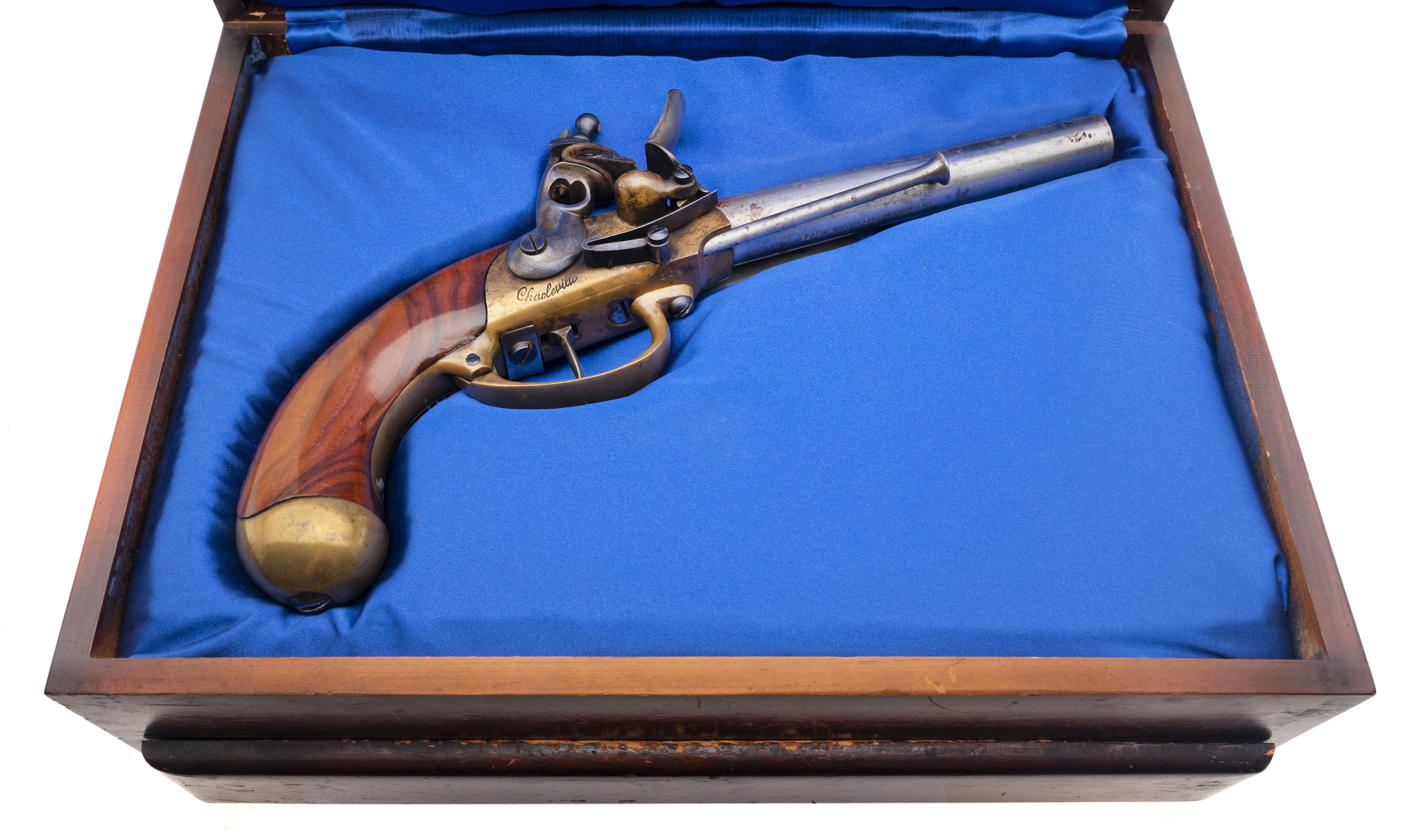Replica French Charleville flintlock black powder pistol. Comes in wooded presentation case. Good condition.