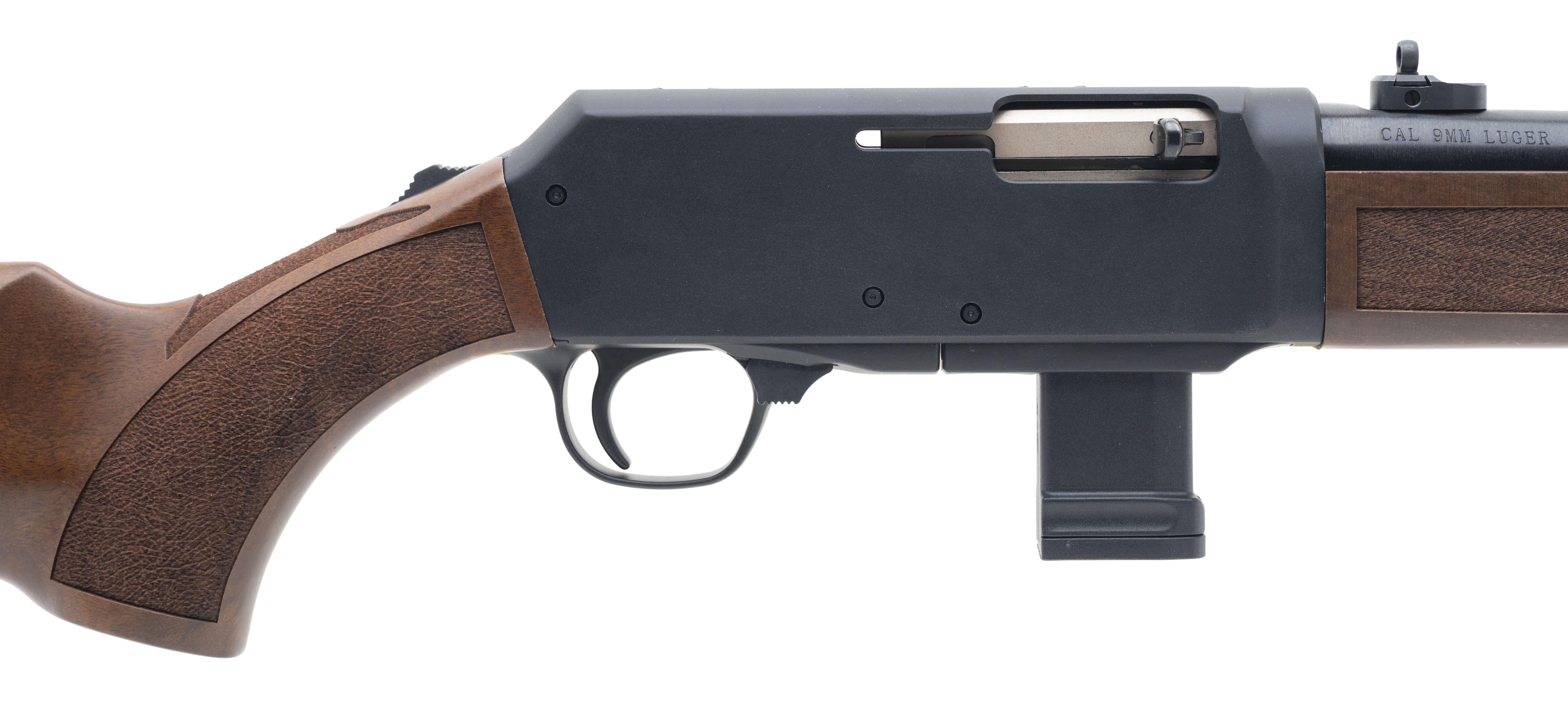 Homesteader, Semi-automatic rifle. 9mm with a 16.37" Threaded barrel, Walnut stock and Drilled and tapped for optic rail. NEW UPC: 619835020024