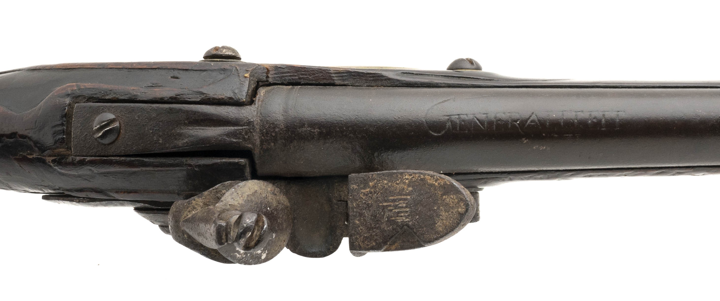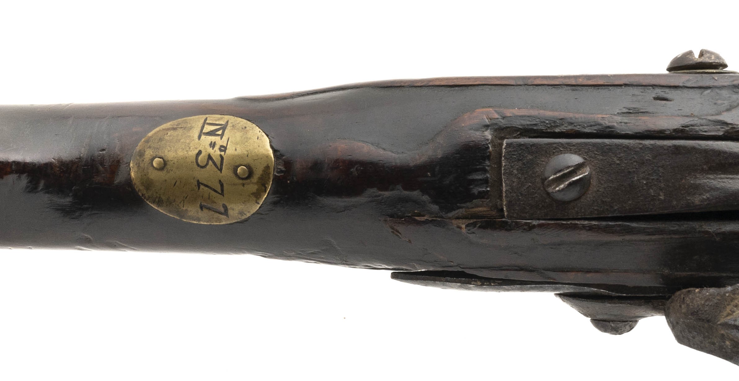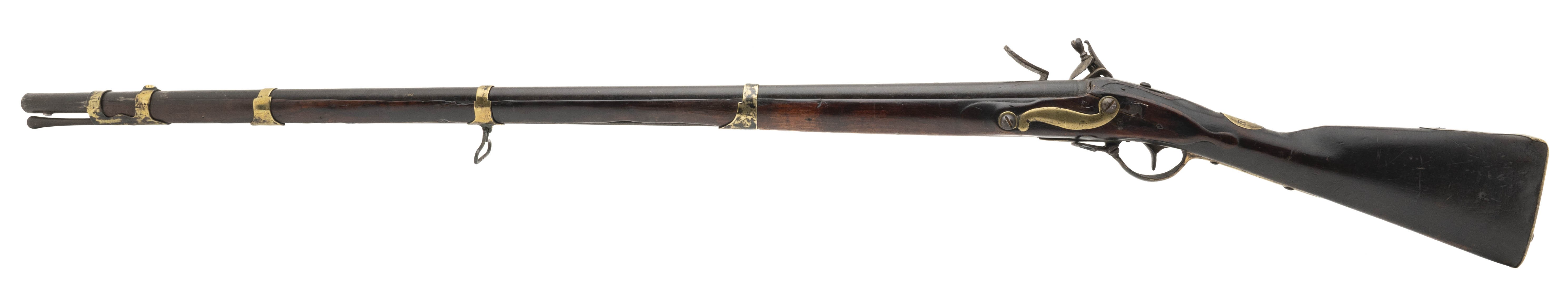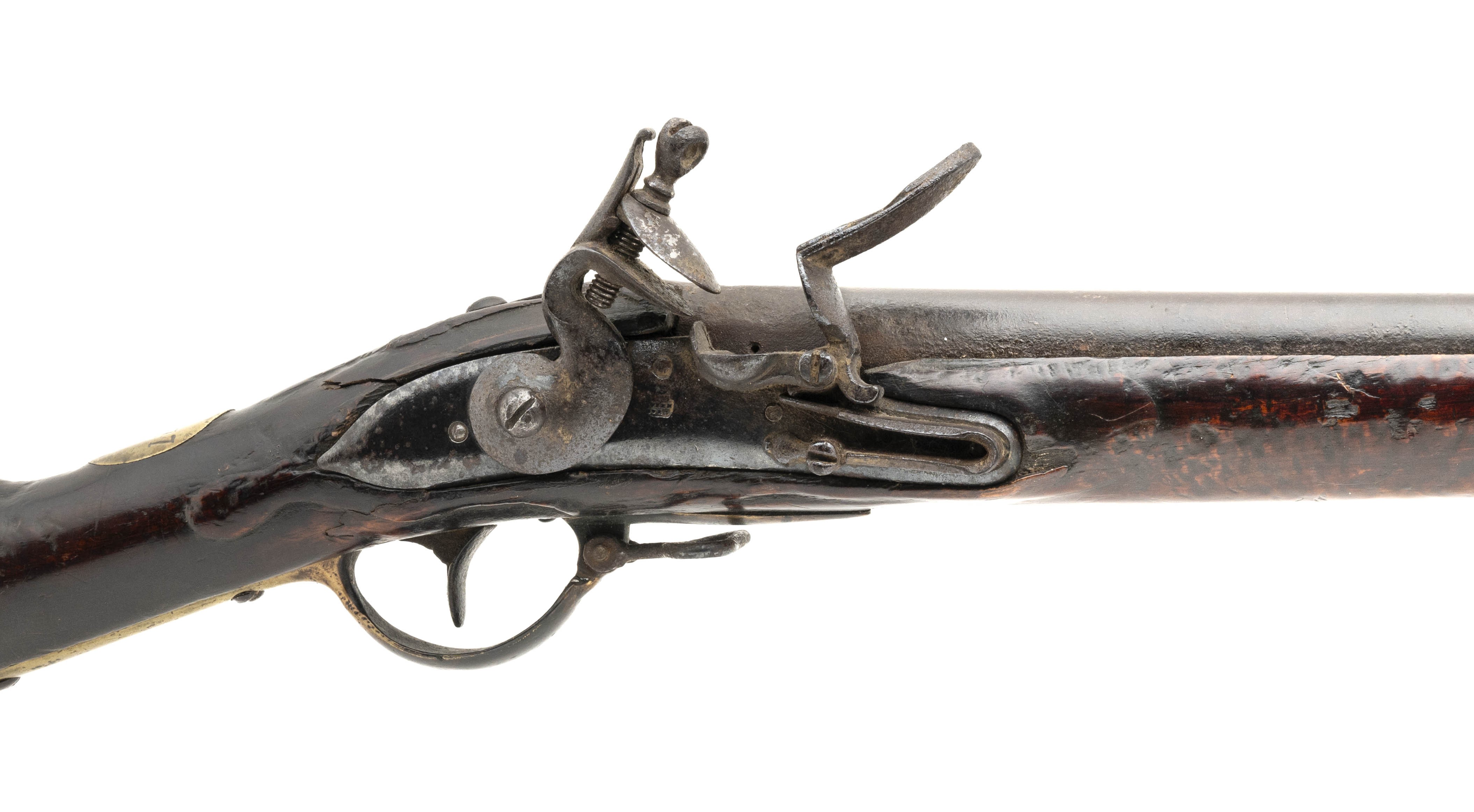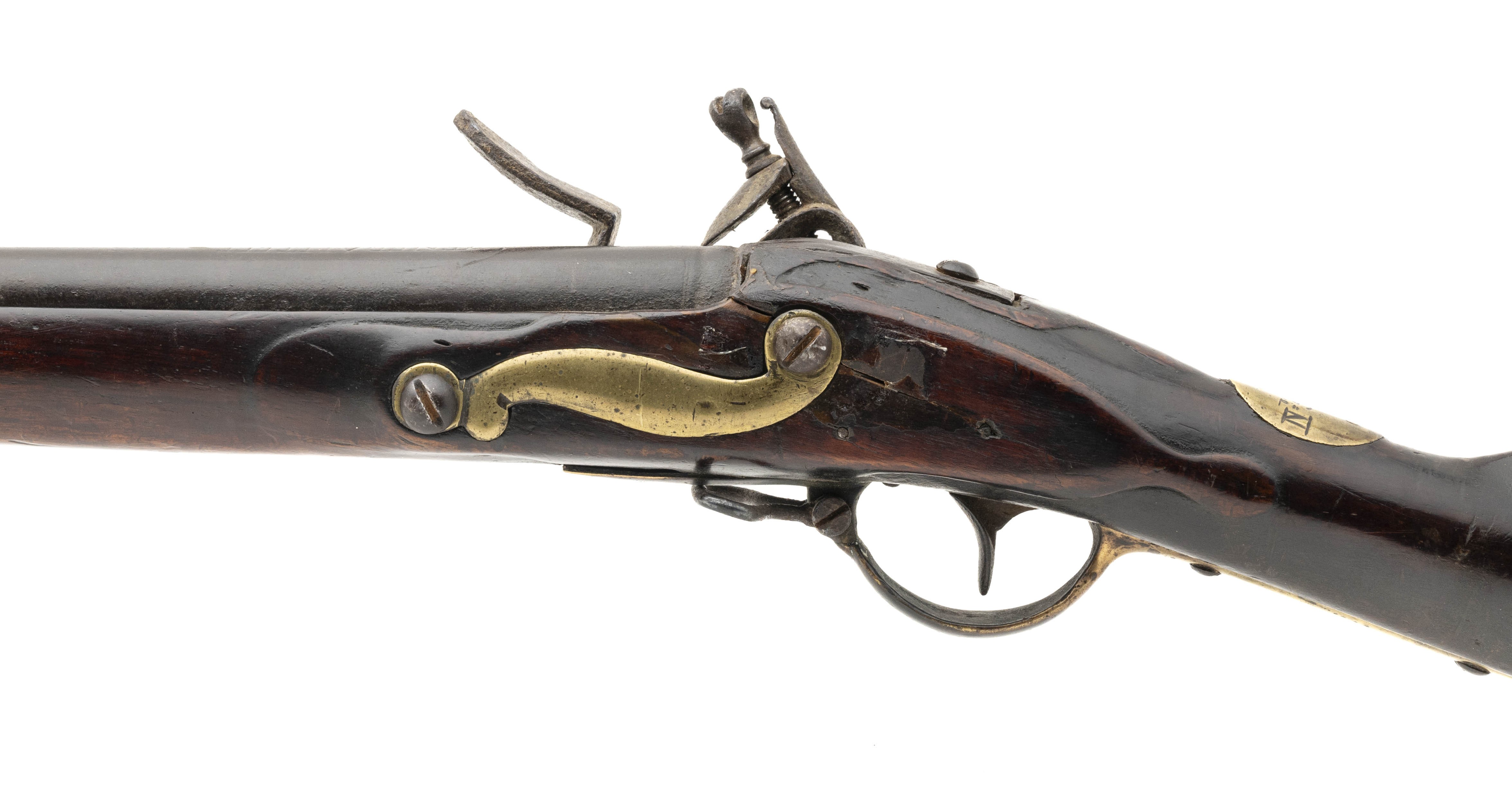 NSN, circa 1770's, 80 caliber, 43.25" round smooth bore barrel marked "GENERALITEIT". Barrel and other iron parts are dark brown patina with scattered oxidation visible. Stock has heavy usage and handling wear with 19" being replaced on the right side, a piece . Butt stock is stamped with "UNITED/STATES", this is indicative of a repair Arsenal in Albany, New York. Escutcheon is marked "No377". Upper side plate screw does not engage and can fall out. Action does function correctly, holding at half and full cock.
