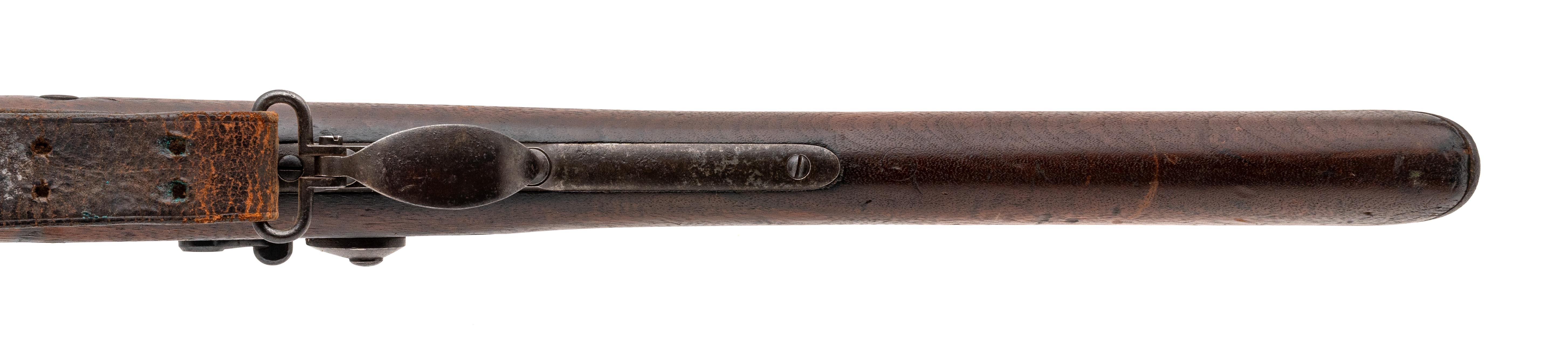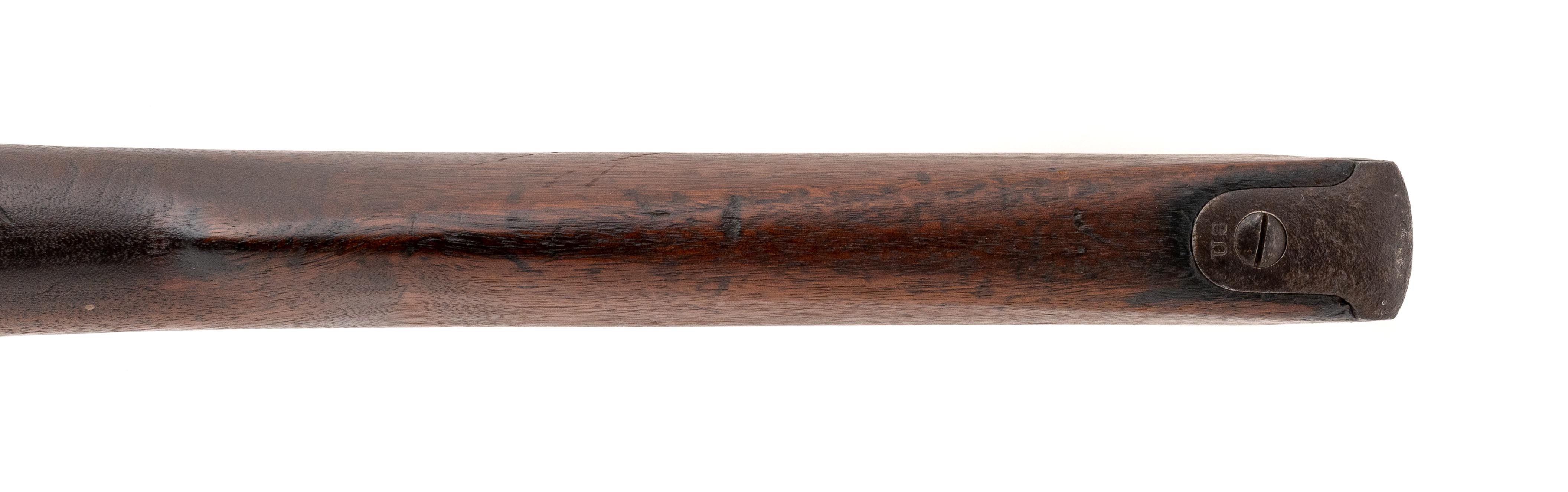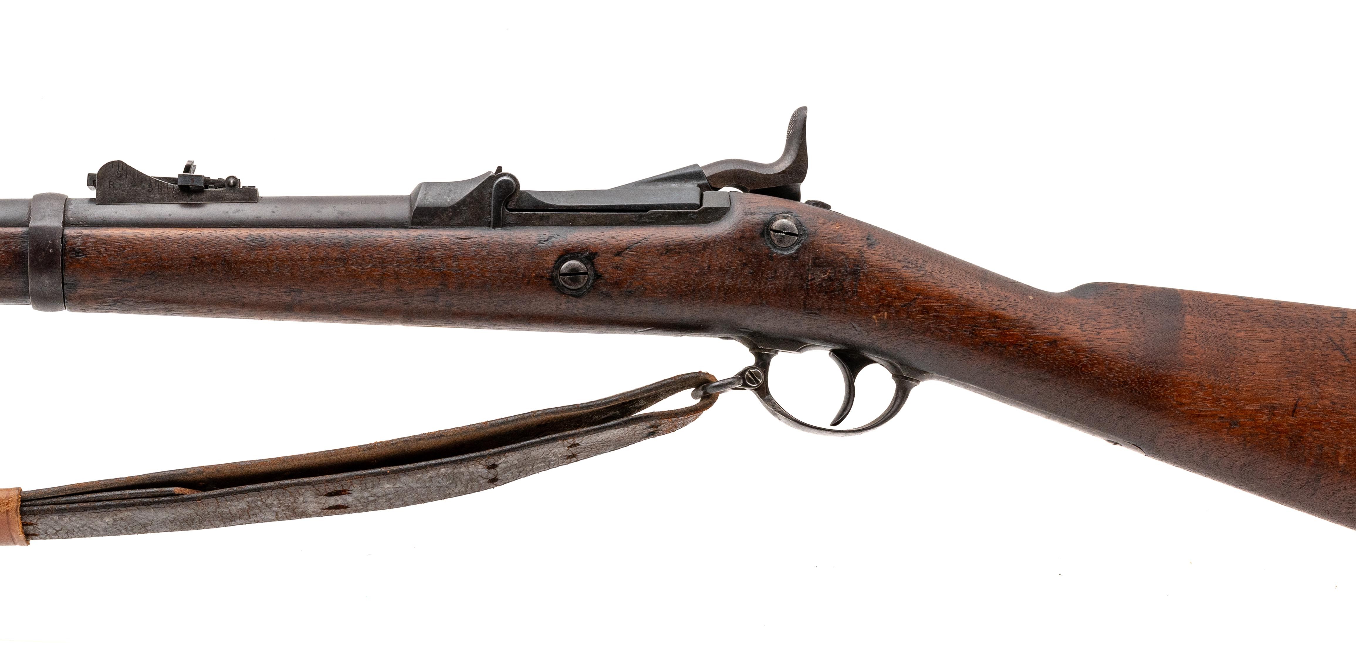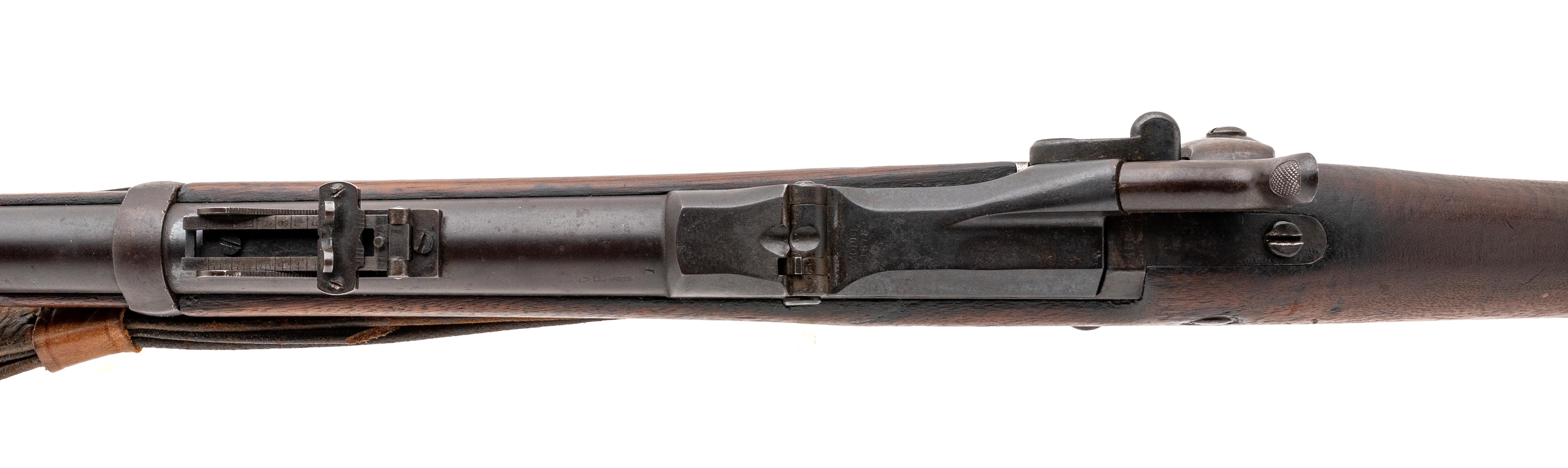 Serial No. 456531, made in 1889, .45-70, 32 5/8" round proofed barrel. Barrel is a plum patina, Lock plate consist of brown/grey patina. Bore is good with frosting and pitting visible in the grooves. rifling remains strong. Stock has expected nicks and dings with faint cartouche noted. Rear sight is a model 1879 "Buckhorn" and probably replaced the Buffington rear sight in the field. Consignment