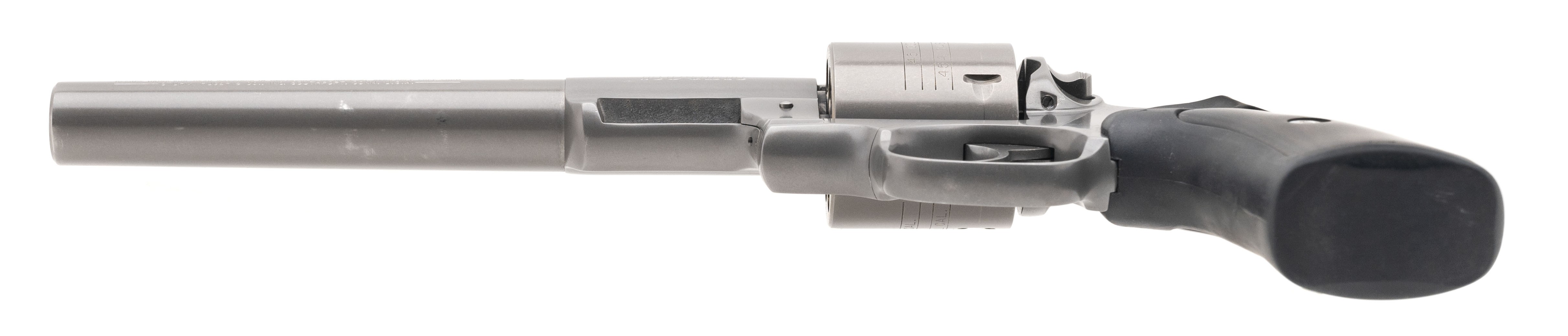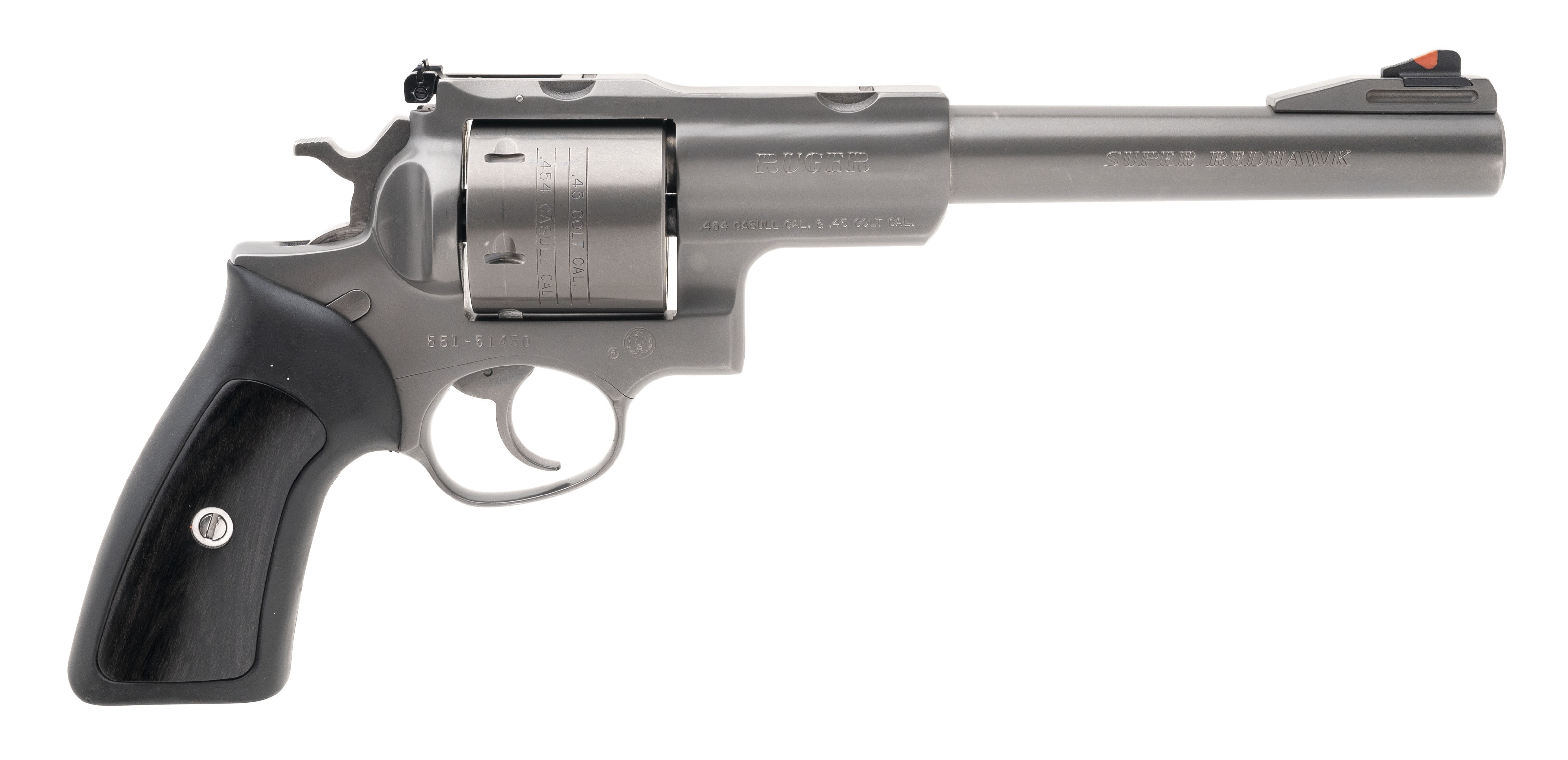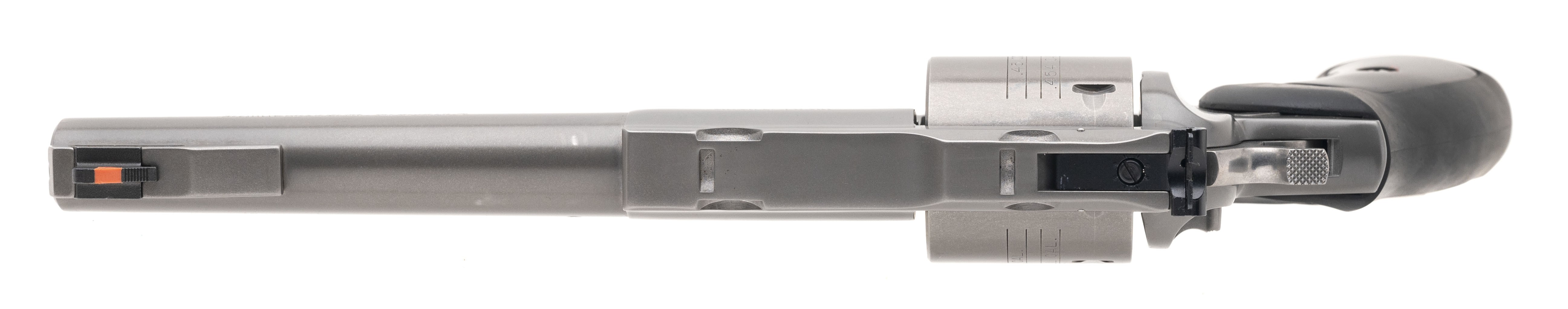 SN:551-51450. Made in 1999 .45 colt/.454 Cassull with a 7.5" barrel. Full sized stainless steel revolver. Metal has dull target grey finish. Rubber/wood grips in excellent condition. Target sights. Factory machine integral mounts. Overall condition is excellent.