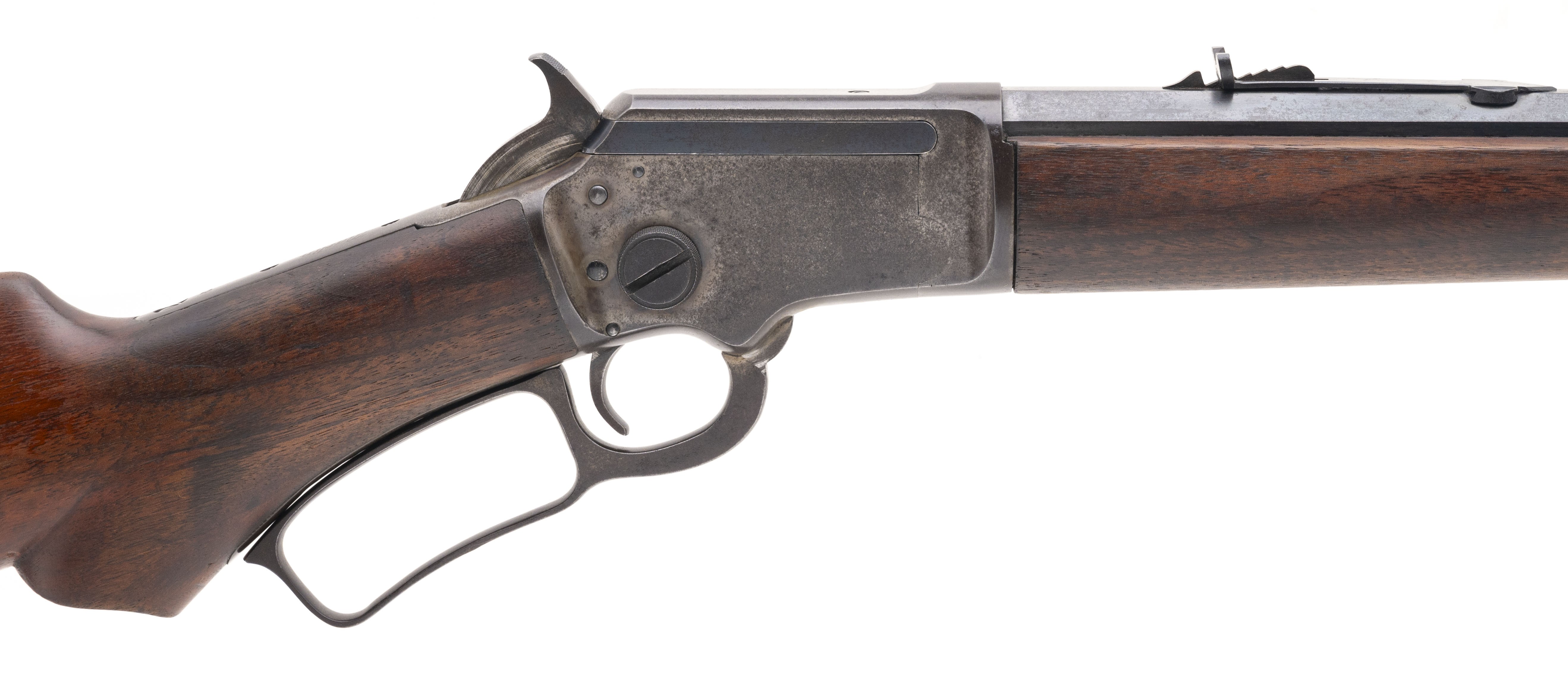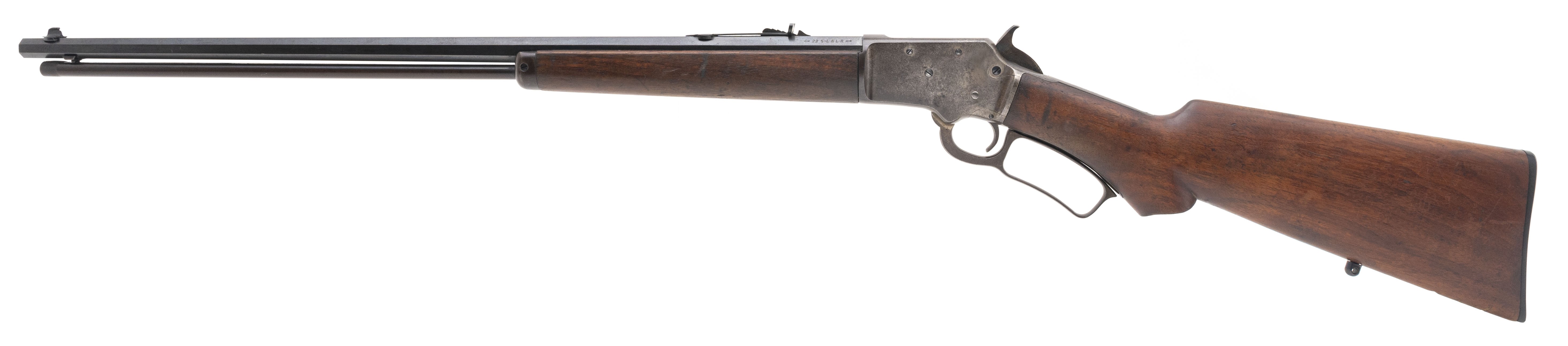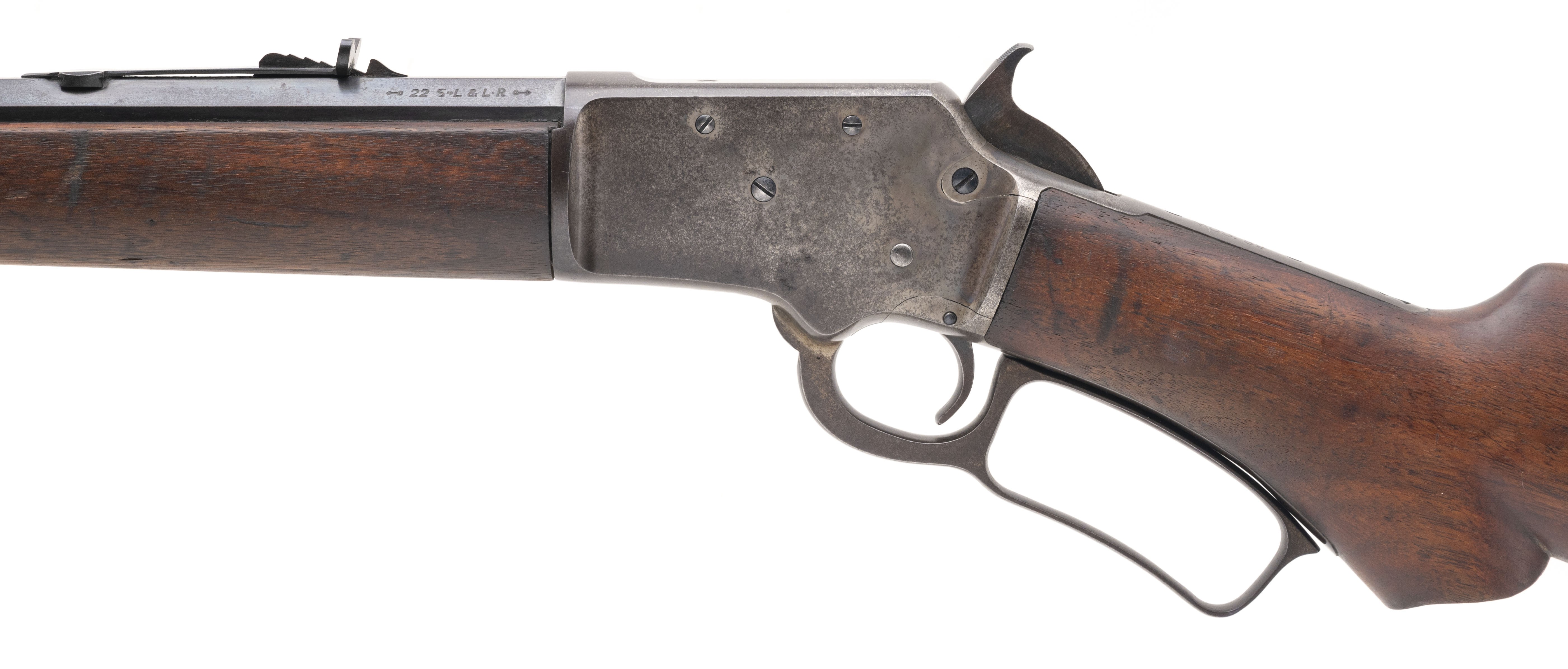 SN: S7885. Made in the 1920's. .22LR with a 24" octagon barrel. Bore is excellent with strong rifling. Early model .22 lever action rifle with "S" prefix and star marking on the tang. The barrel has about 85% factory blue mixed with brown, and the mag tube is mostly brown. The receiver has gray patina with traces of case colors. The stock is good with marks and wear. Overall condition is very good. A desirable Marlin lever action rifle.