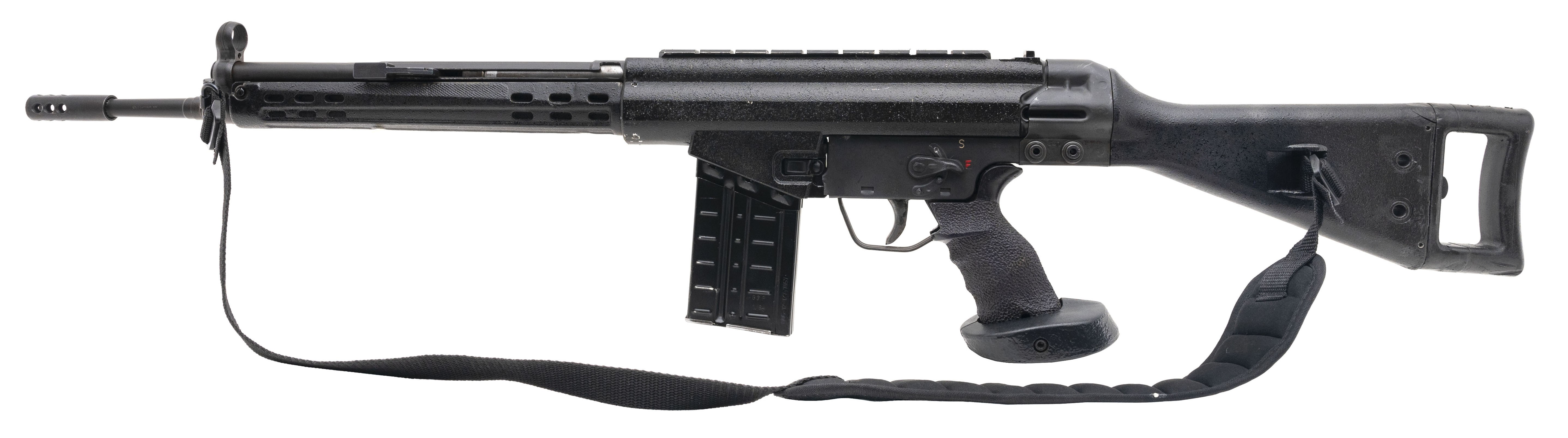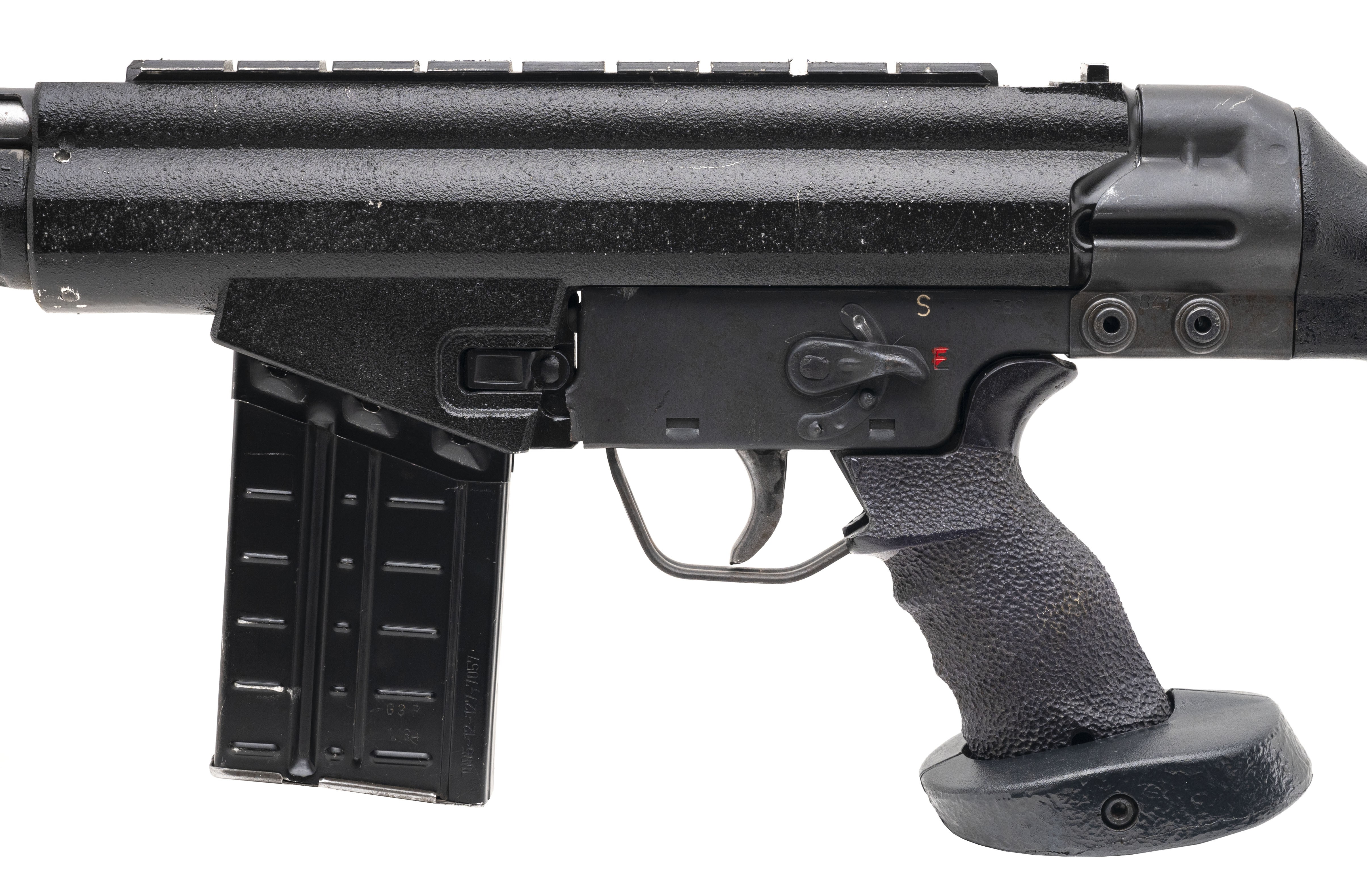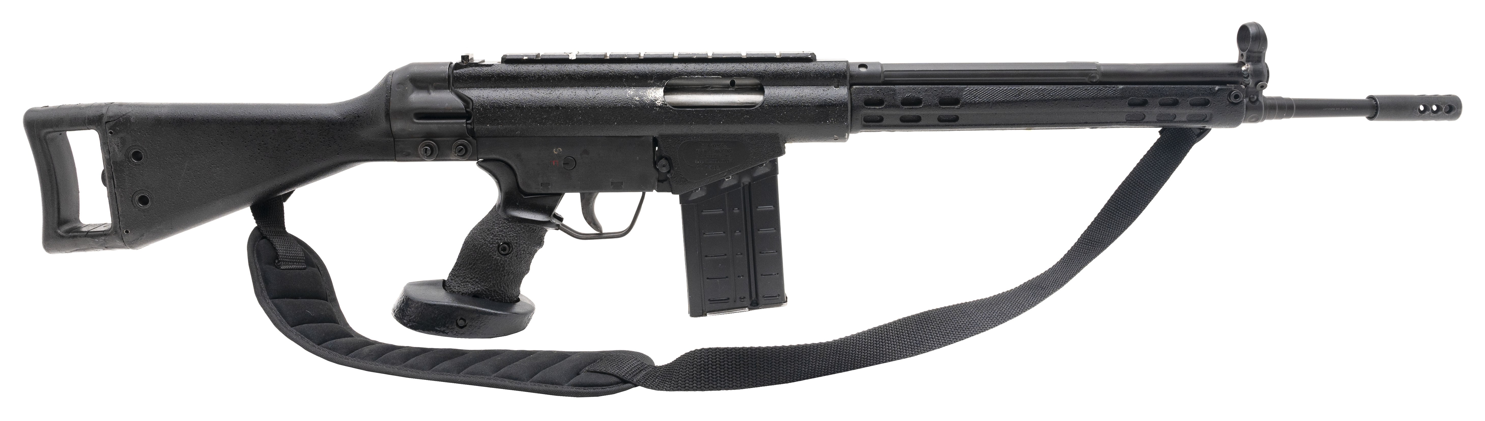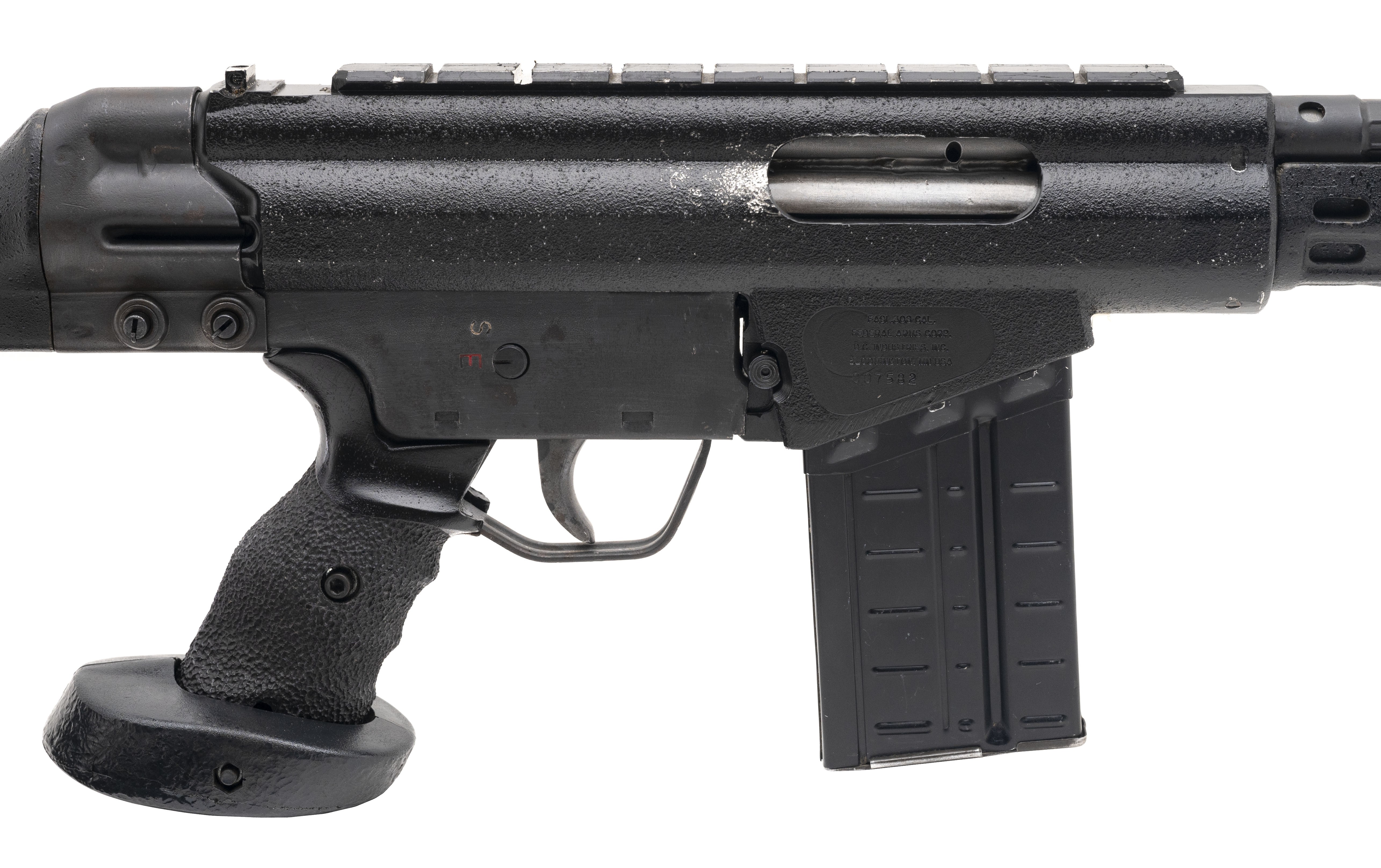SN: 007582. Modern production .308 with 16" barrel. Bore is excellent. HK 91 clone fitted with PSG-1 style grip, picatinny rail, buttstock extension and sling. Has handling wear and some surface rust on the receiver. Has a small cosmetic crack on the back of the buttstock. Overall good condition.