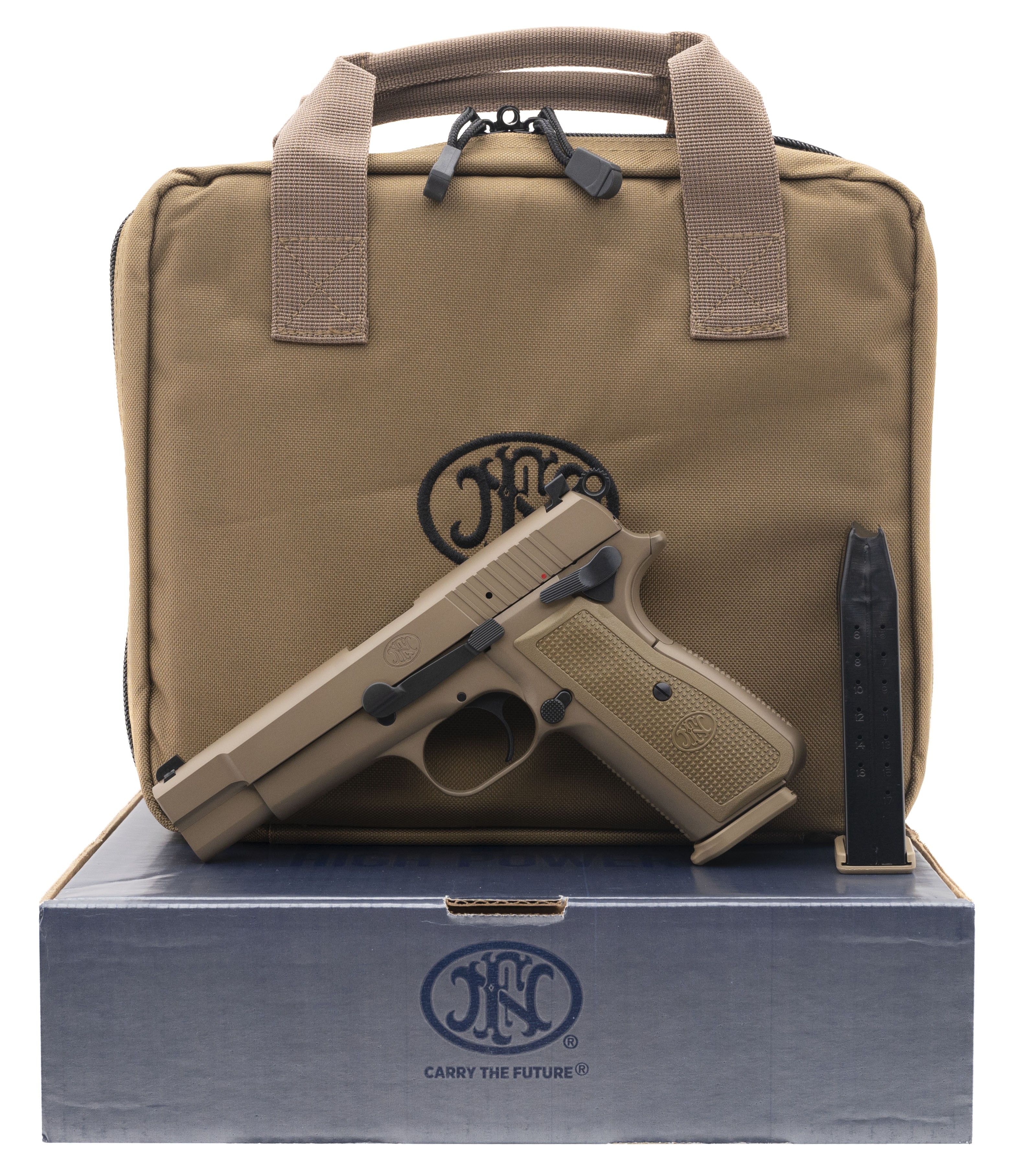 Semi-automatic FDE 4.7 target-crowned hammer forged barrel with a PVD finish and 2 polymer grip pairs, 17RD capacity, & includes a zippered ballistic range bag. NEW. UPC: 845737013608.