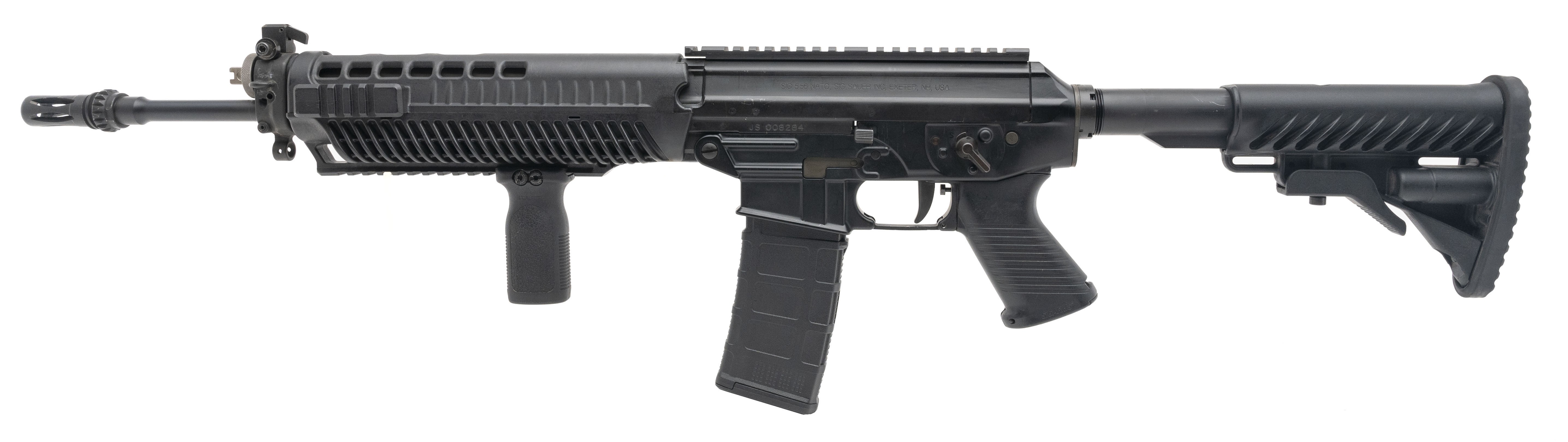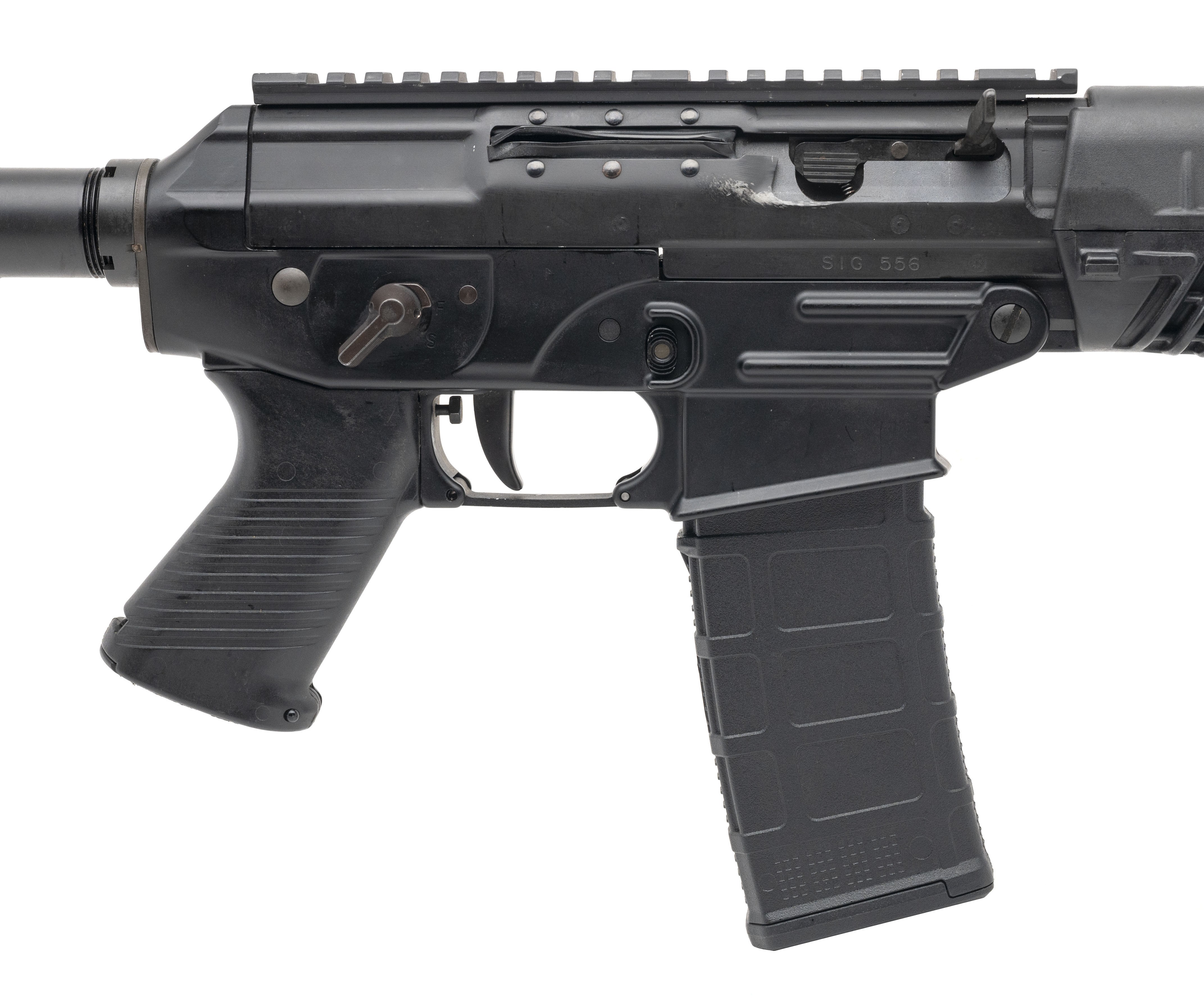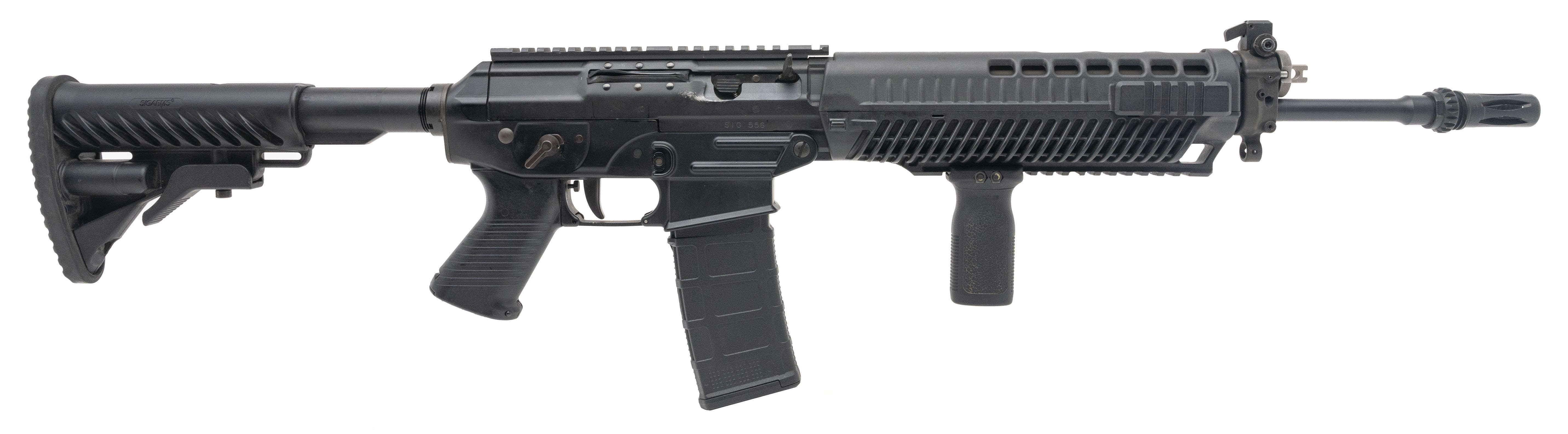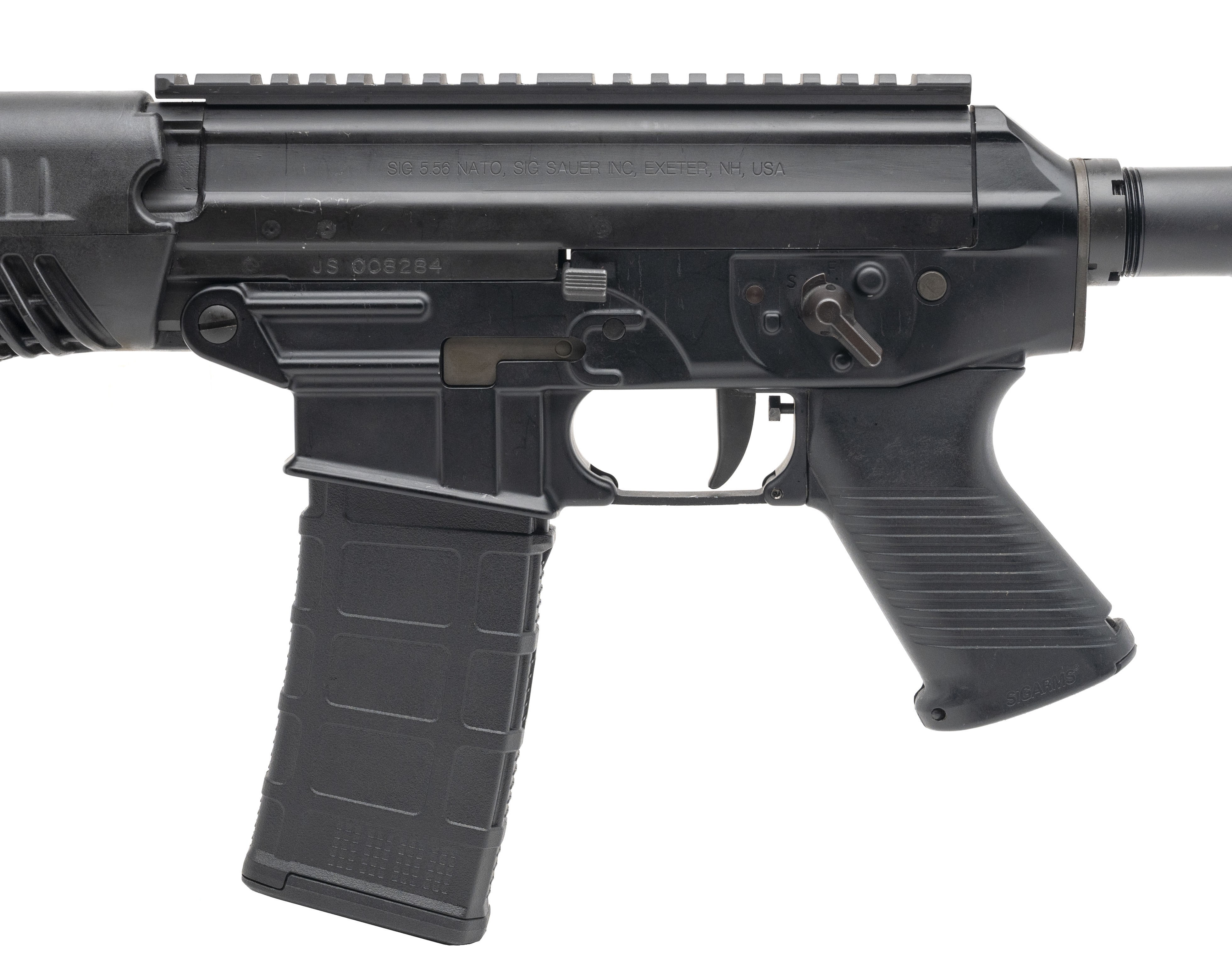 SN: JS008284. Modern production. Semi-automatic rifle based on the SG-550 made by Sig. 16" barrel chambered for 5.56 NATO. Great condition overall with some finish wear at the sling stud and the ejection port, plus light handling marks. Features flip-up front sight blade and accessory rails molded into the handguard. Comes with Sig rotary diopter rear sight (not shown,) Magpul vertical foregrip and original Sig furniture.