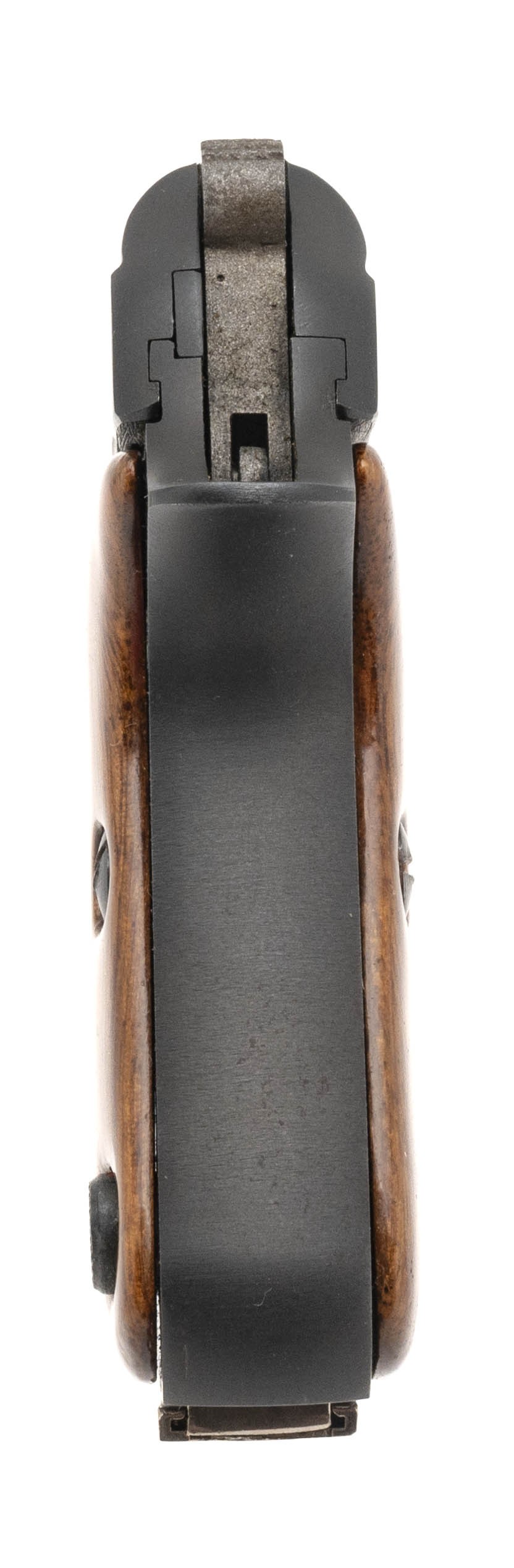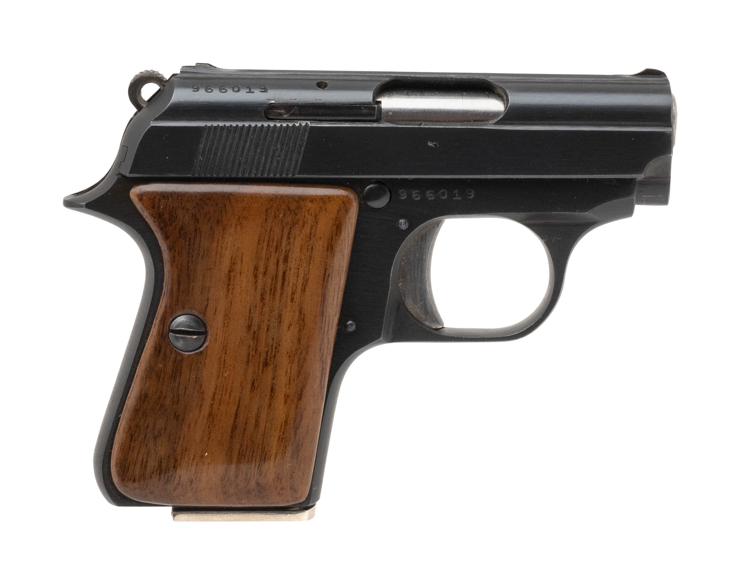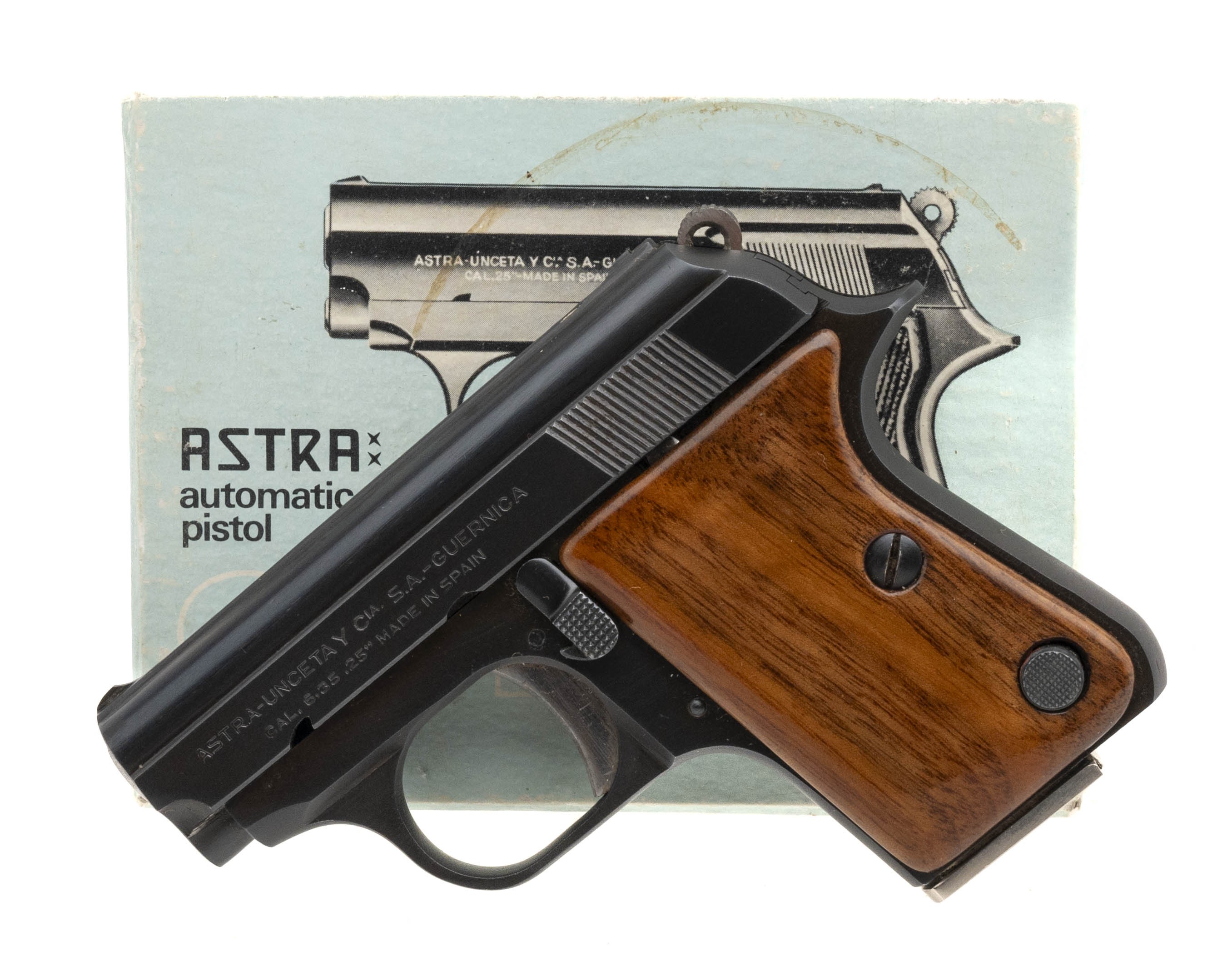 SN: 966109. Semi-automatic pocket pistol made by Astra of Spain in the 1960s. 2.25" barrel chambered for .25 ACP. Blowback action with detachable six round magazine. Excellent condition. Wood grip panels a replacement. Bore is excellent. Action functions correctly. Comes with box and manual.
