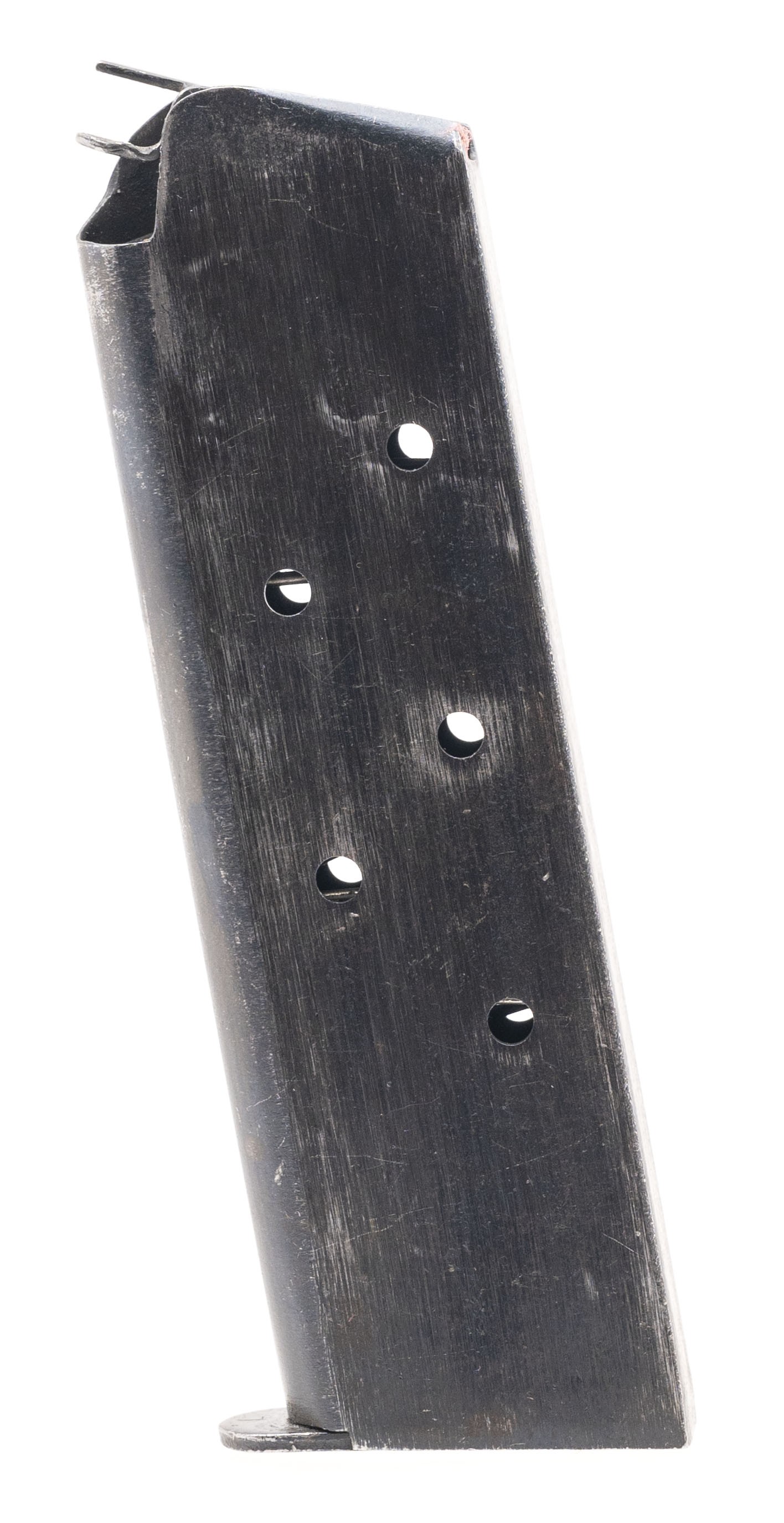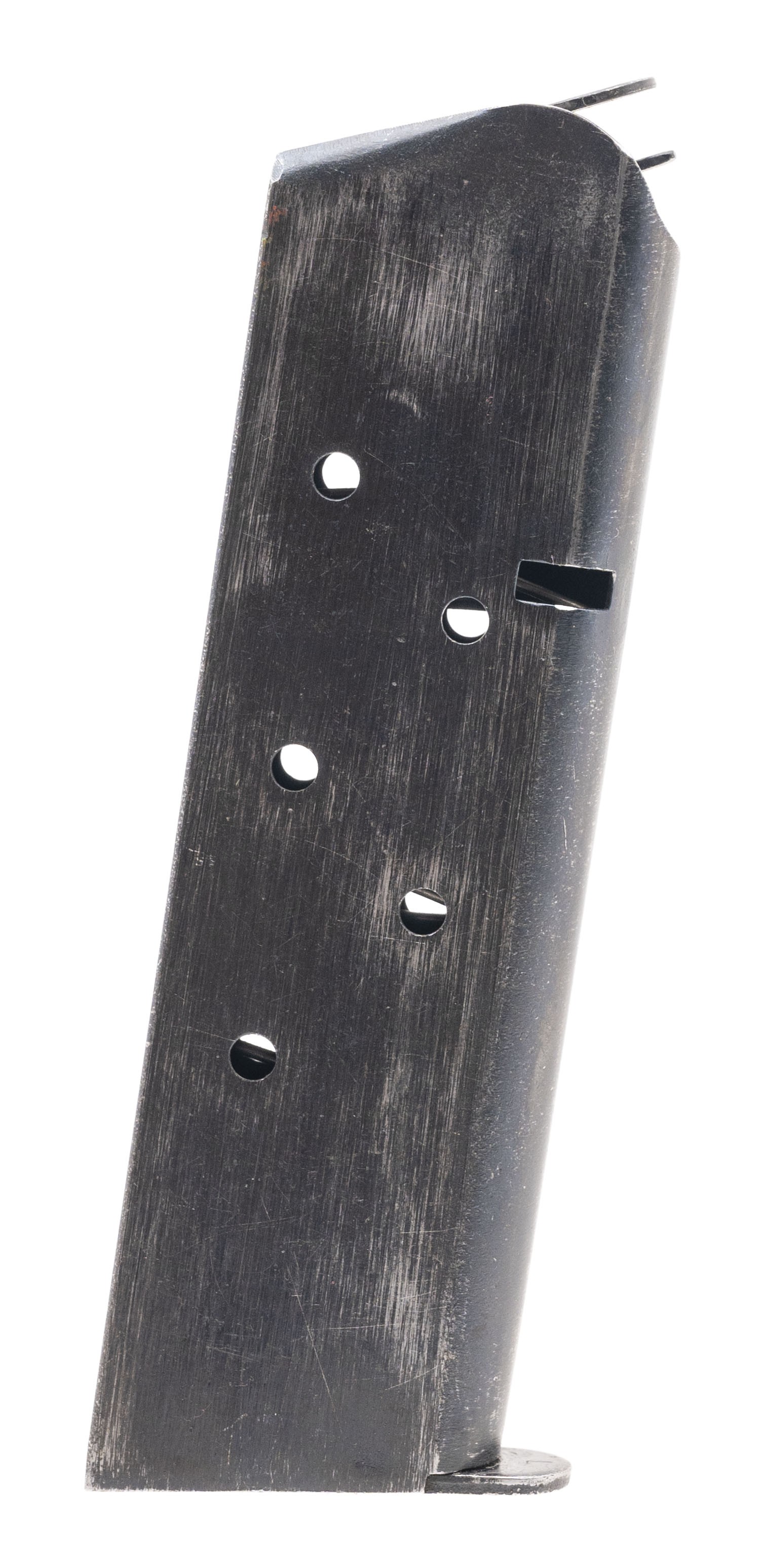 World War II-era USGI M1911A1 7-round magazine made for Remington, Ithaca & US&S by M.S. Little, Co. of Hartford, Connecticut with a spot welded baseplate & an "L" marked on the top of the lip. Overall excellent condition.