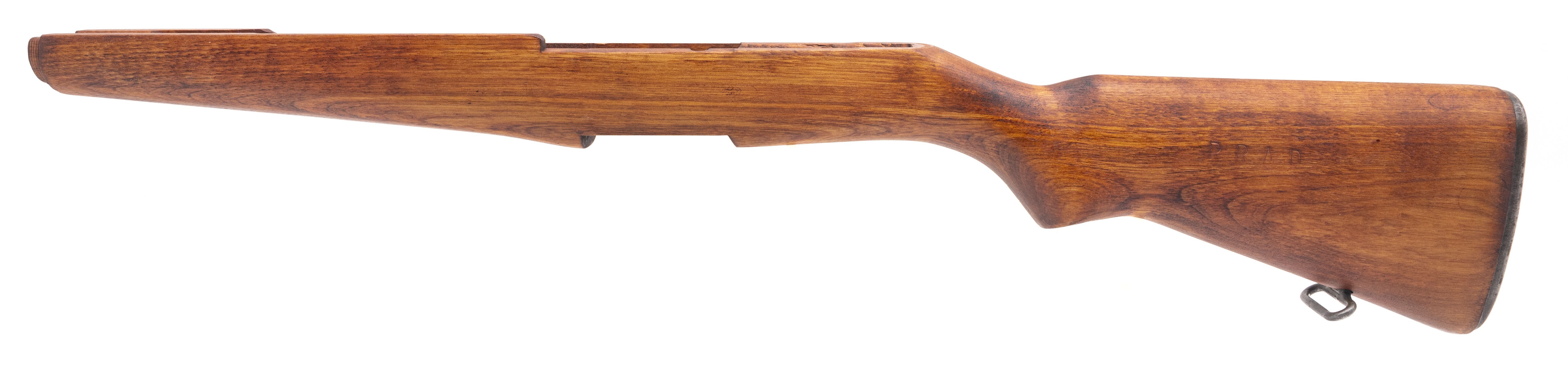 Korean War-era USGI IHC M1 Garand Stock made by S.E. Overton Company that has an "RRAD" ("Red River Army Depot") cartouche on left side. Also has a square sans serif "P" on the pistol grip.