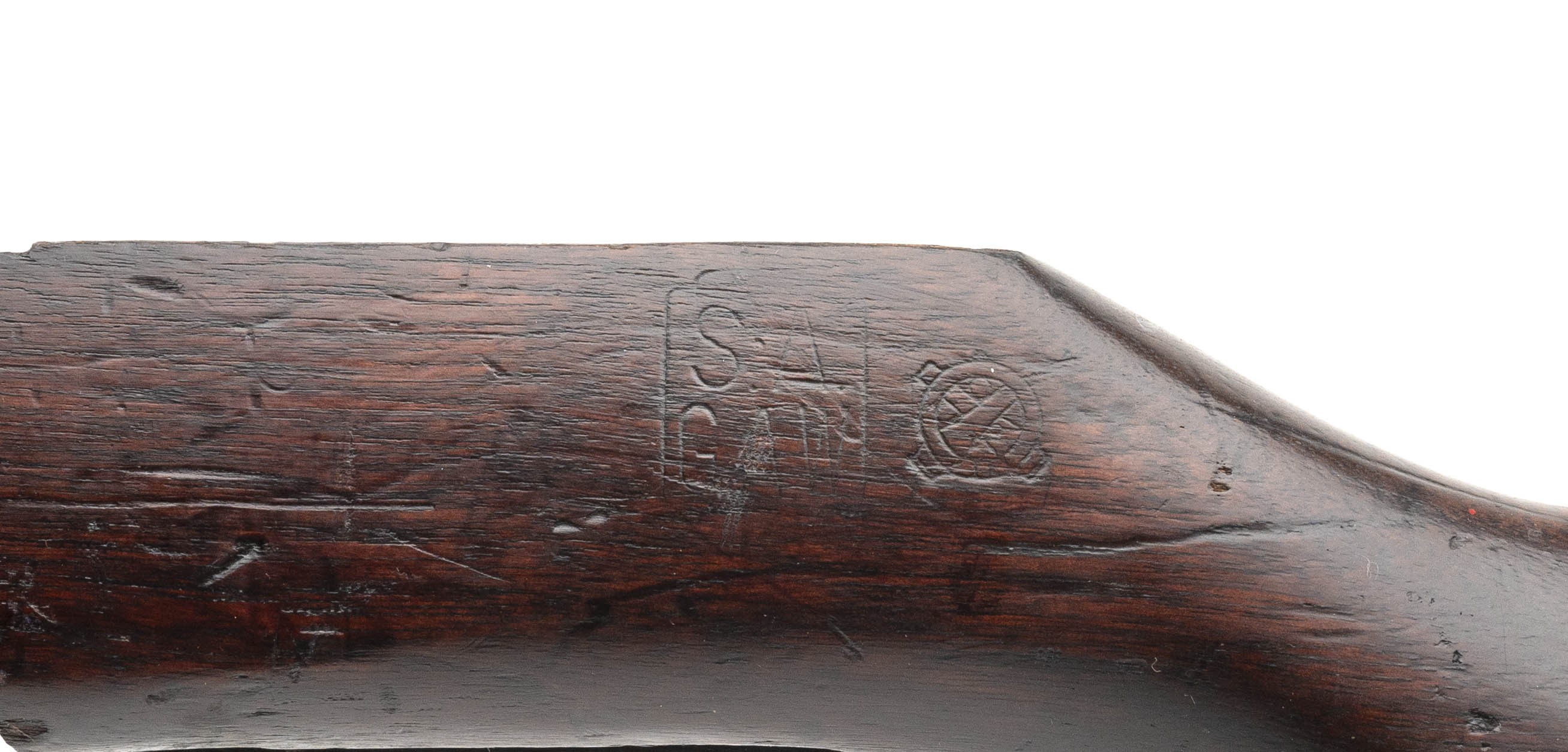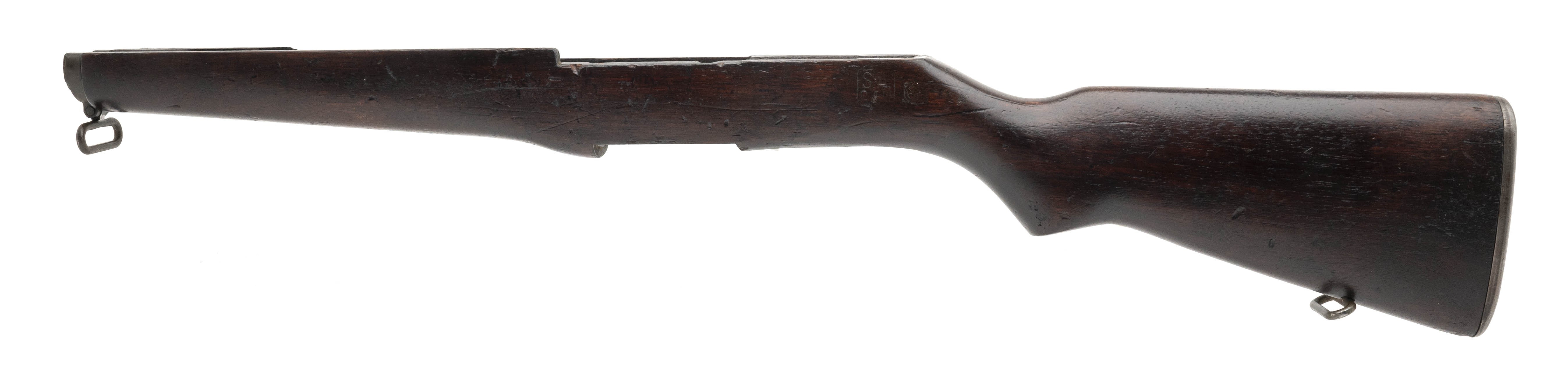 Springfield Armory M1 Garand stock with "G.A.W." cartouche next to ordnance escutcheon, circle serif "P" inside the pistol grip & tapered checkering SA buttplate. Stock has dings & dents but is in overall very good condition.