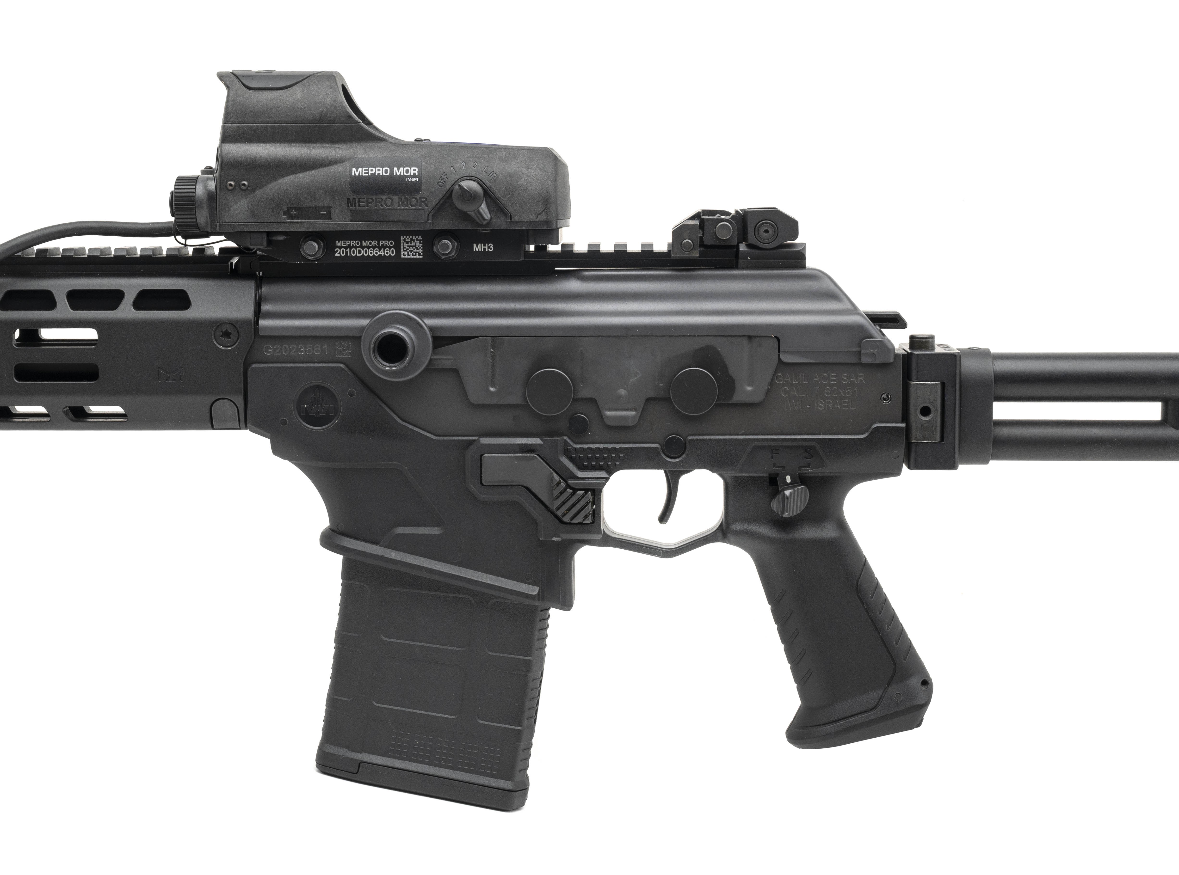 SN: G2023561. Modern production. 7.62x51 with a 16" barrel. Bore is excellent. Israeli Semi-automatic rifle with. Finish is in excellent condition. Folding stock is in excellent condition. Rifle comes with Mepro MOR optic. Overall excellent condition.