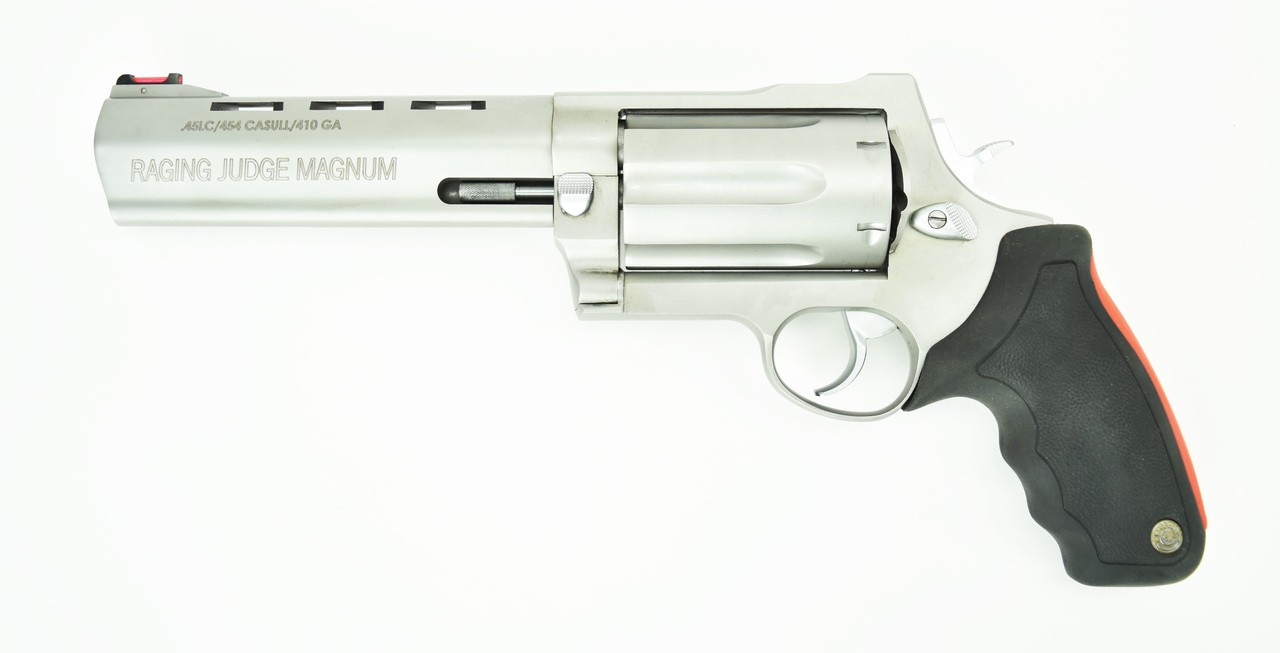 Taurus Raging Judge Magnum .45 LC/454/410 Gauge caliber revolver. Stainless steel Raging Judge Magnum with 6 ½” barrel in excellent condition.