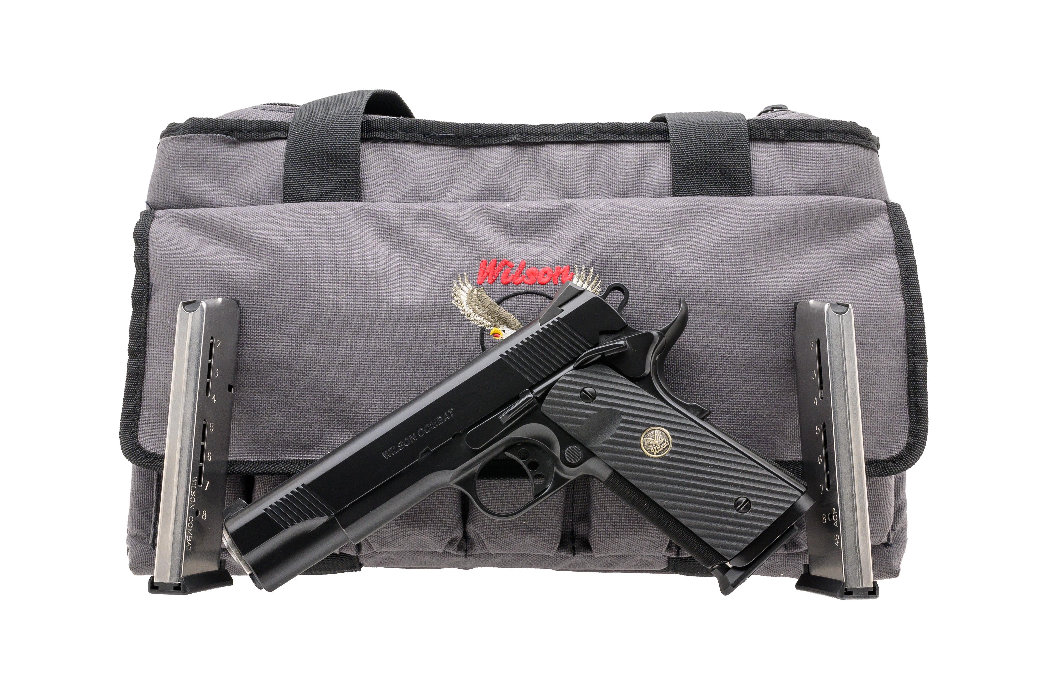 SN: WCT14648. Modern production. .45 with a 5" barrel. Bore is very good. Steel frame 1911. Finish and grips are in excellent condition. Pistol comes with Wilson Combat range bag, Wilson Combat DVD, and 2 extra magazines. Overall very good condition.