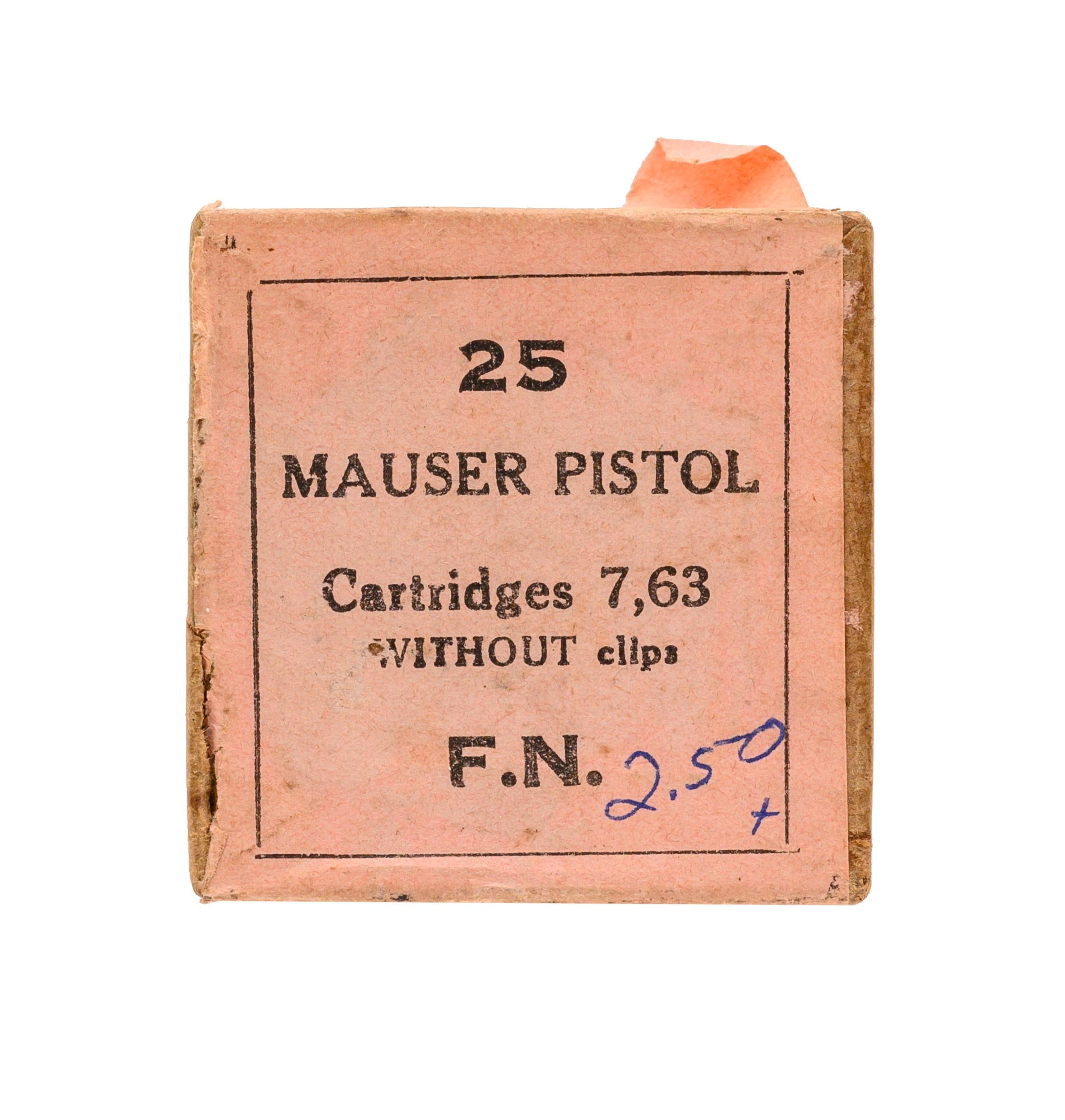 Box of 25rds of FN 7.63 Mauser ammunition. Box is complete and in very good condition.