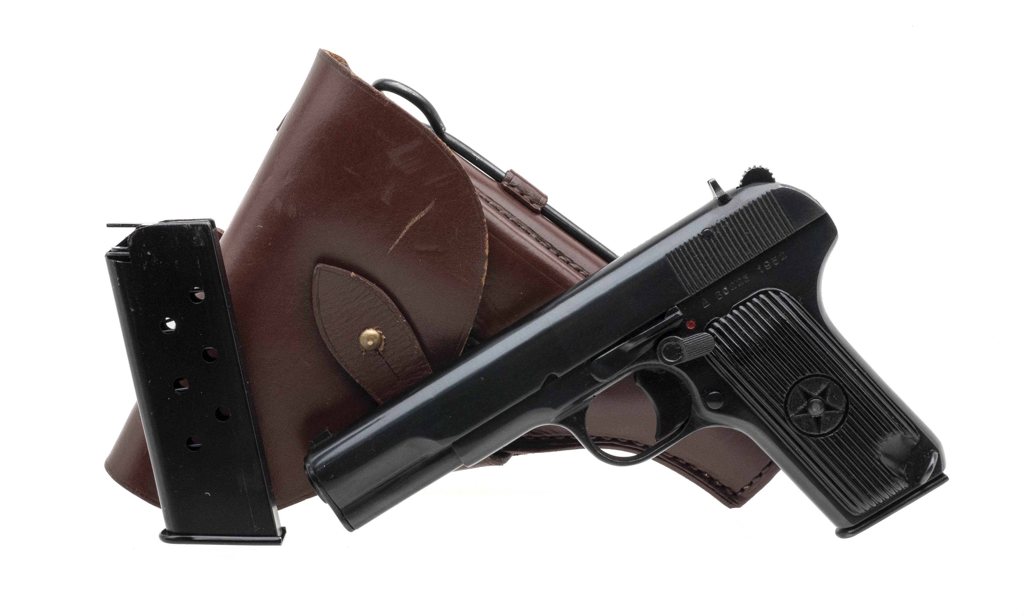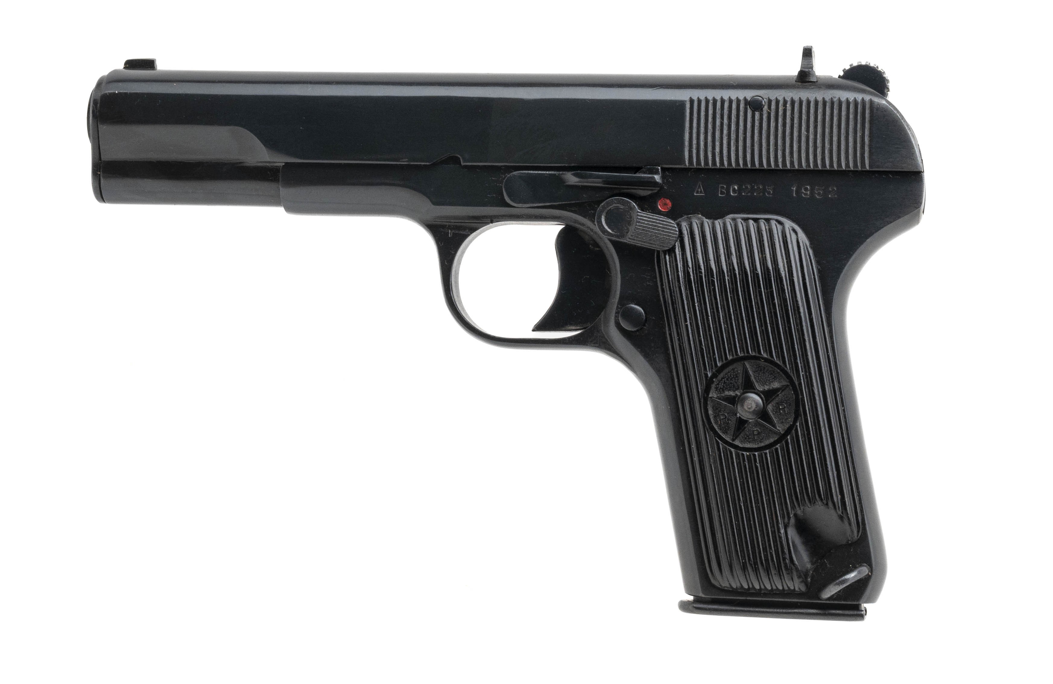 SN: BC223. Made in 1952. 7.62x25 with a 4.5" barrel. Bore is bright with strong rifling. Romanian service pistol made by Cugir arsenal. Finish is in very good condition, note pistol has been reblued. Grips show minimal handling wear. Pistol comes with reproduction holster and extra magazine. Overall very good condition.