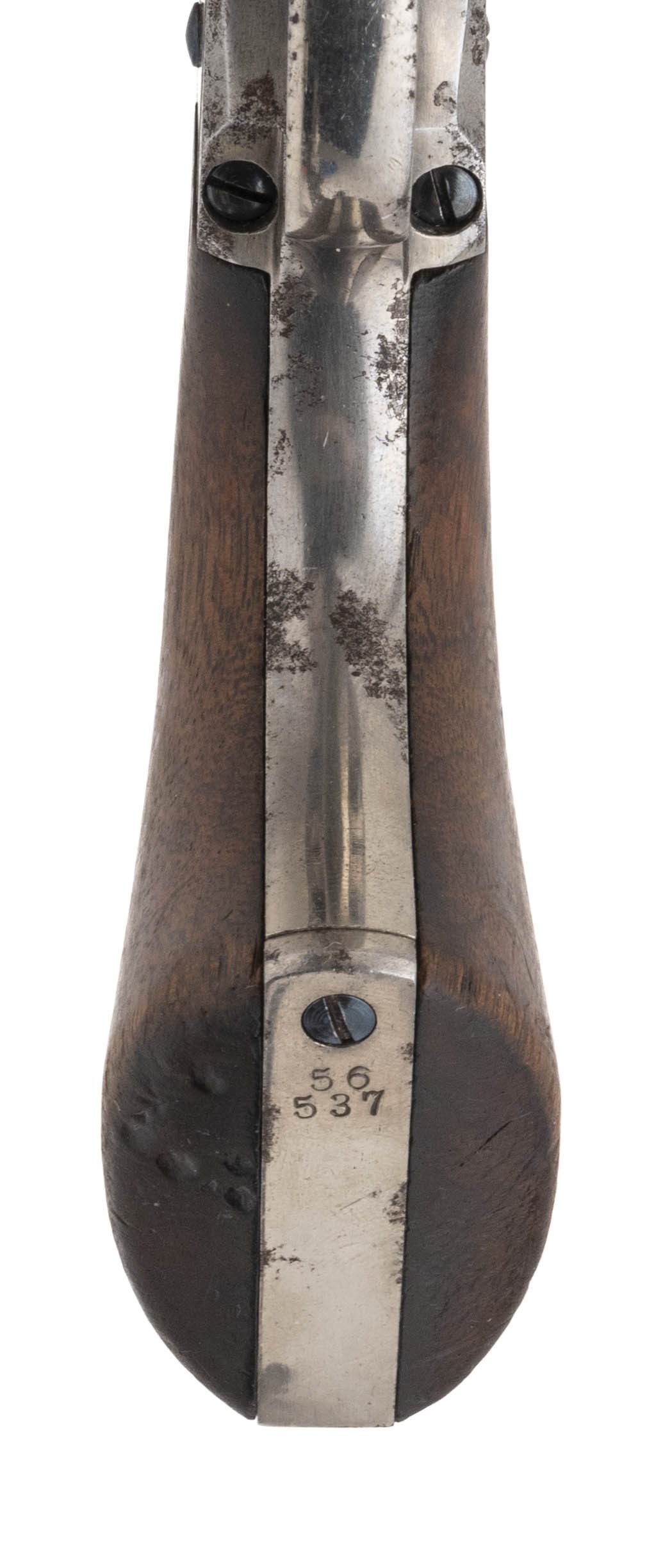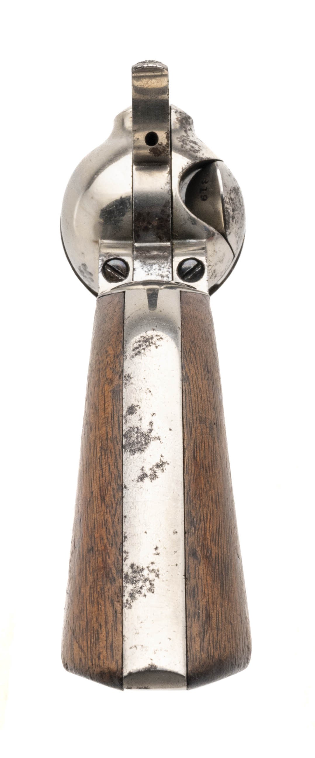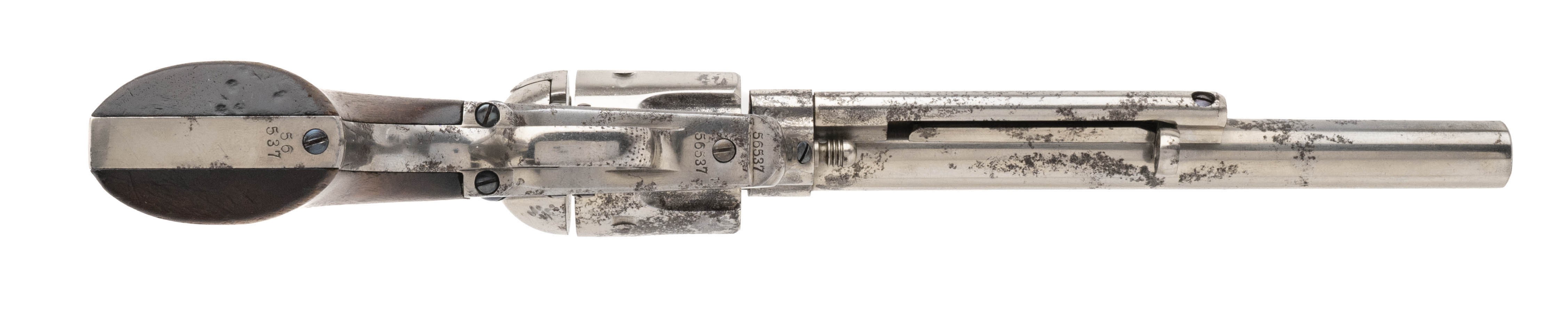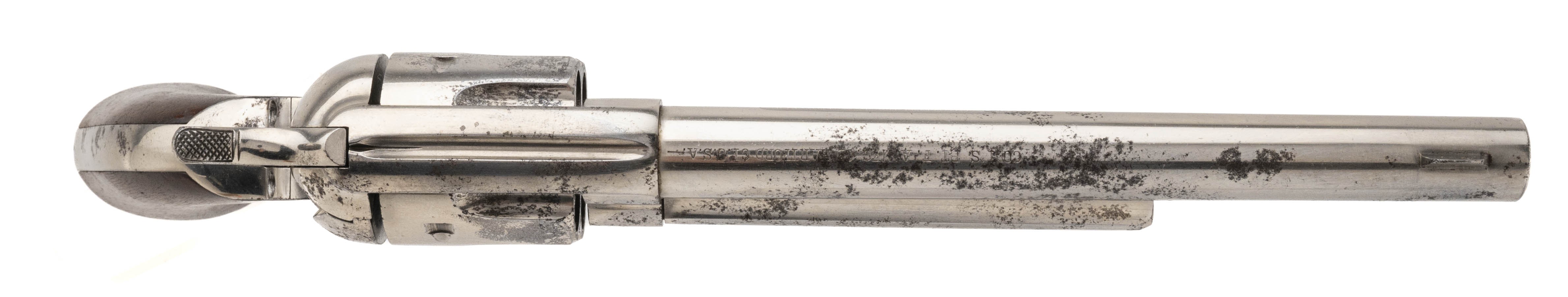 Serial number 56537. Made in 1880. 44-40 caliber with a 7 ½” barrel. This gun is in excellent condition with 0785% of the original factory nickel. The etched paned is perfect and readable. The grips have been cleaned and the original varnish removed. The screws still have some of the original fire blue. Action works perfectly. This gun comes with a factory letter to Hibbard, Spencer & company in Chicago in a shipment of 5 guns. (DALLAS LOCATION)