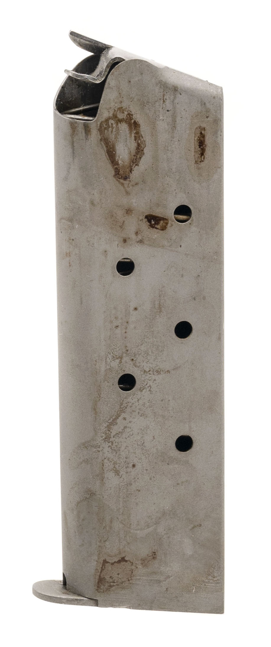 VEGA marked 7-round M1911A1 .45 ACP magazine in used but good condition with some discoloration on the sides but otherwise in serviceable condition.