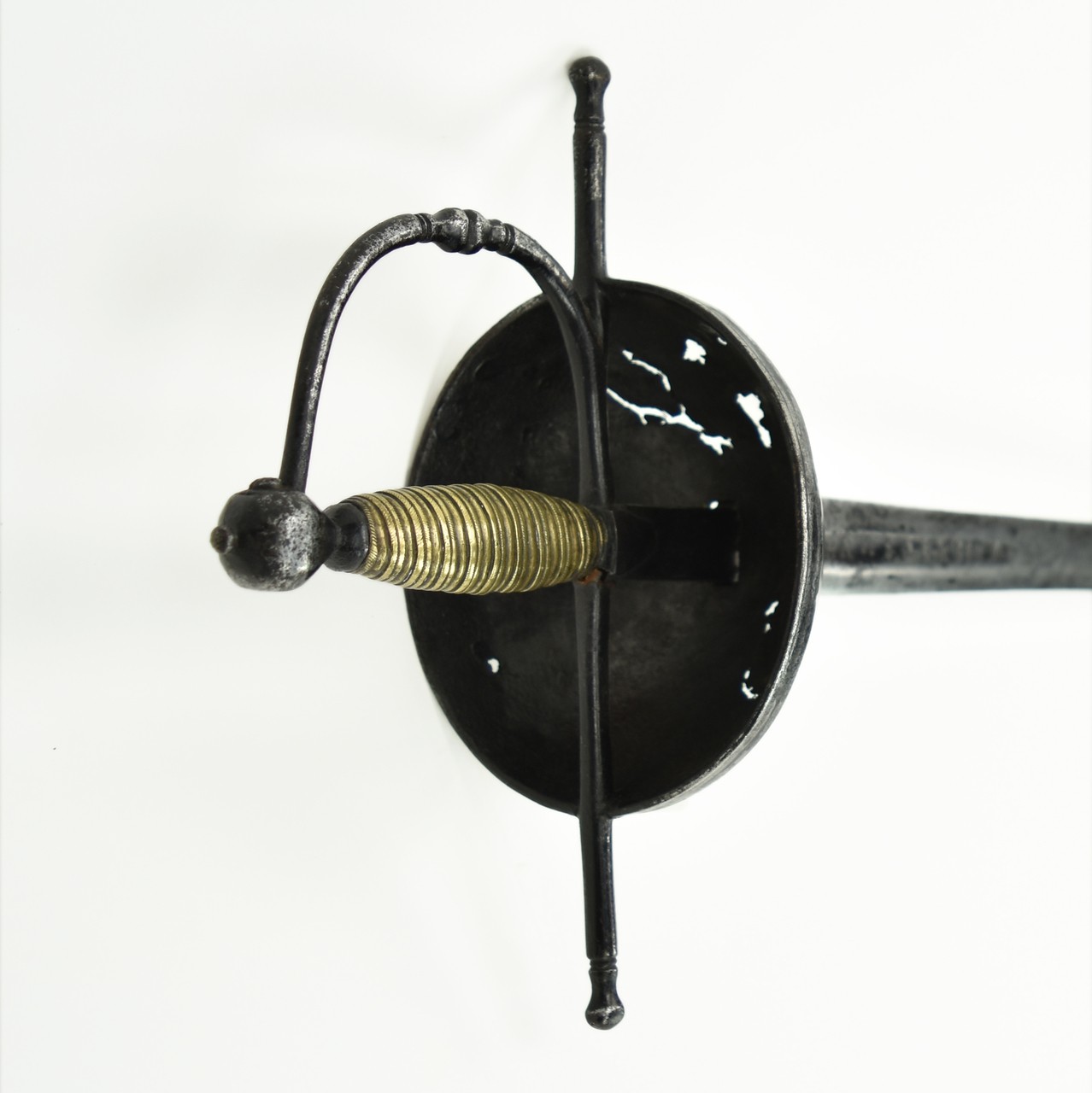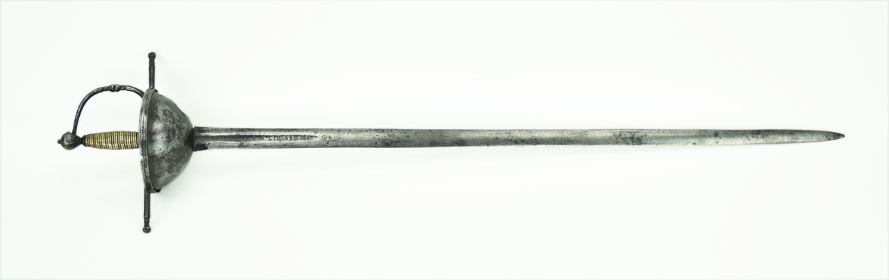 Portuguese Cup Hilt Rapier Cavalry Sword. Circa 1700. Blade: 37.4” long, marked IHN SOLINGEN with an orb. Iron guard. Cast brass grip.