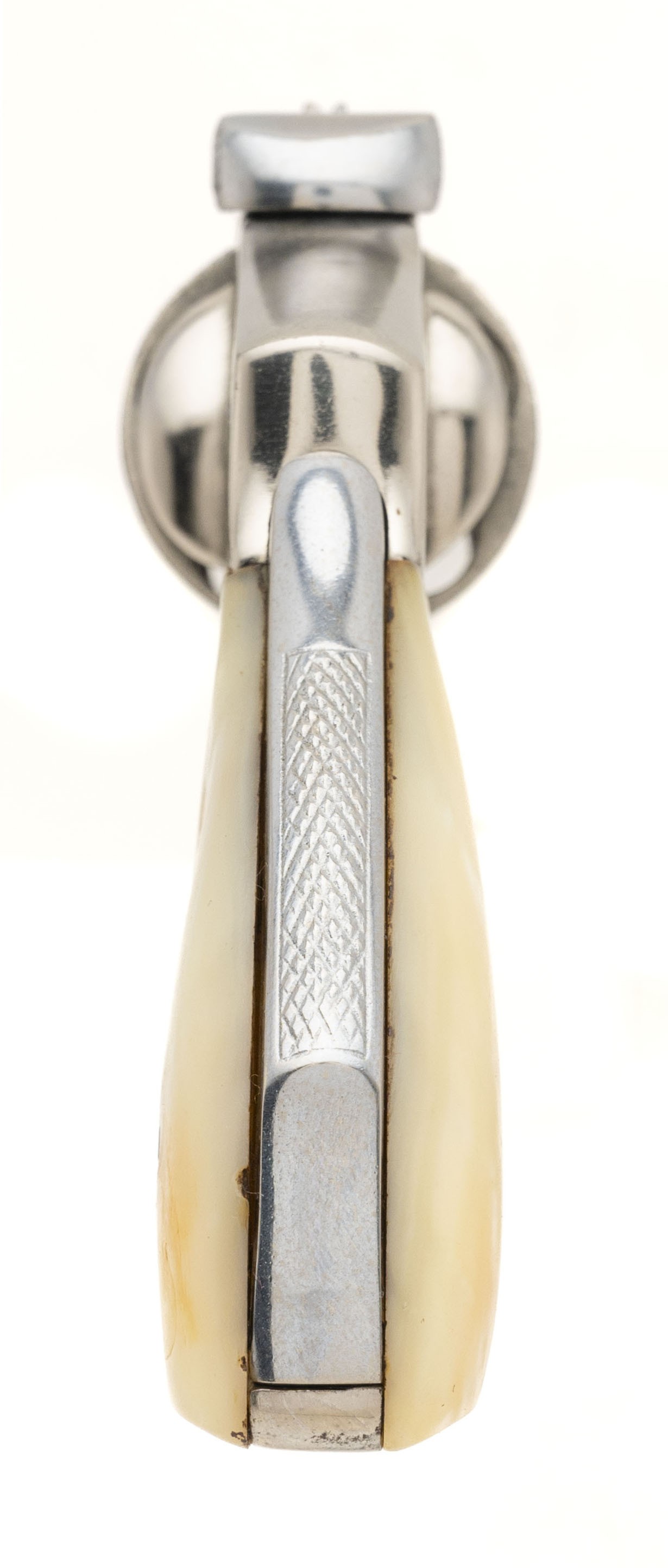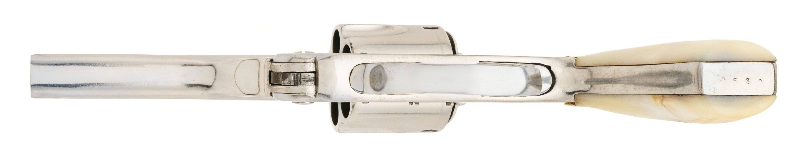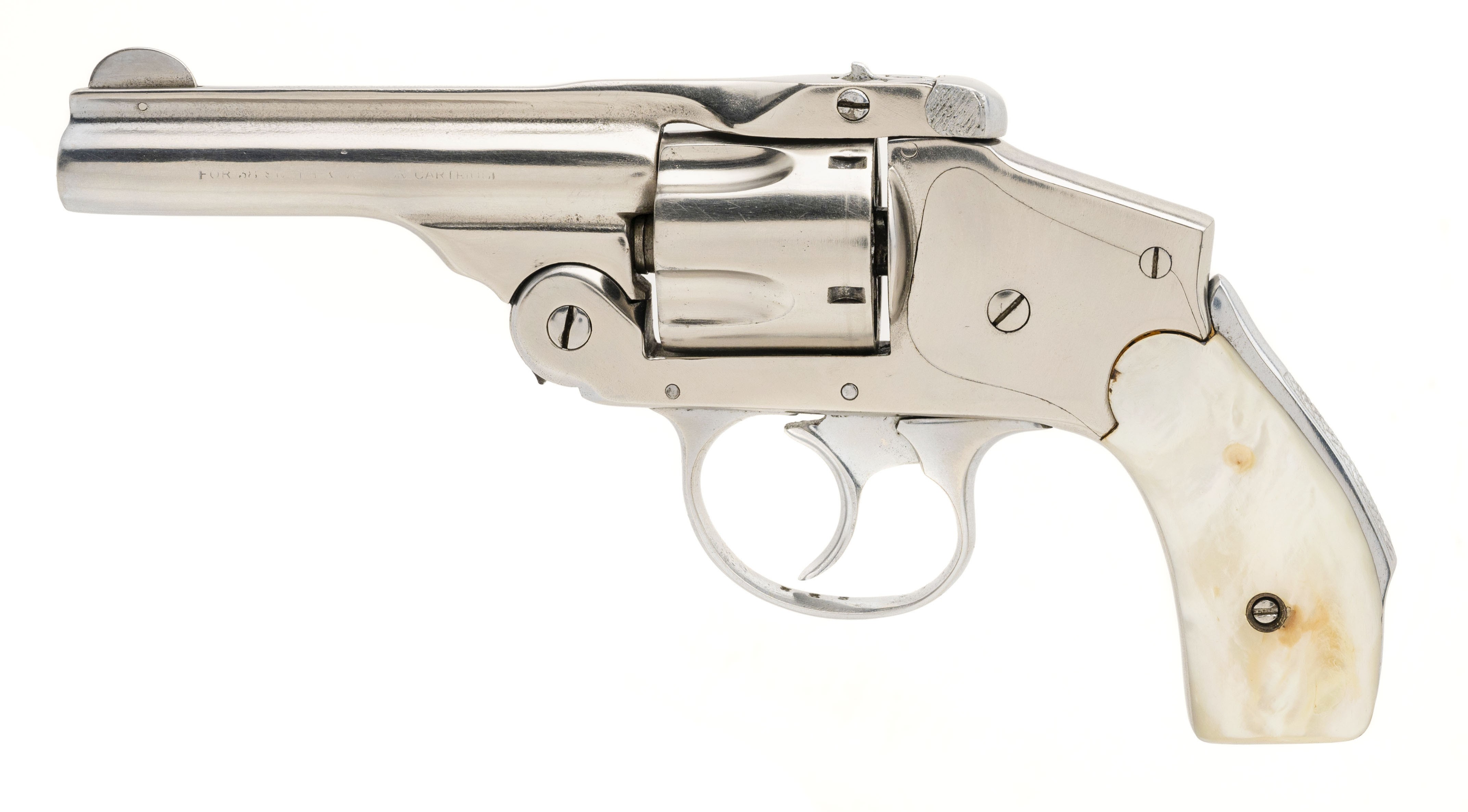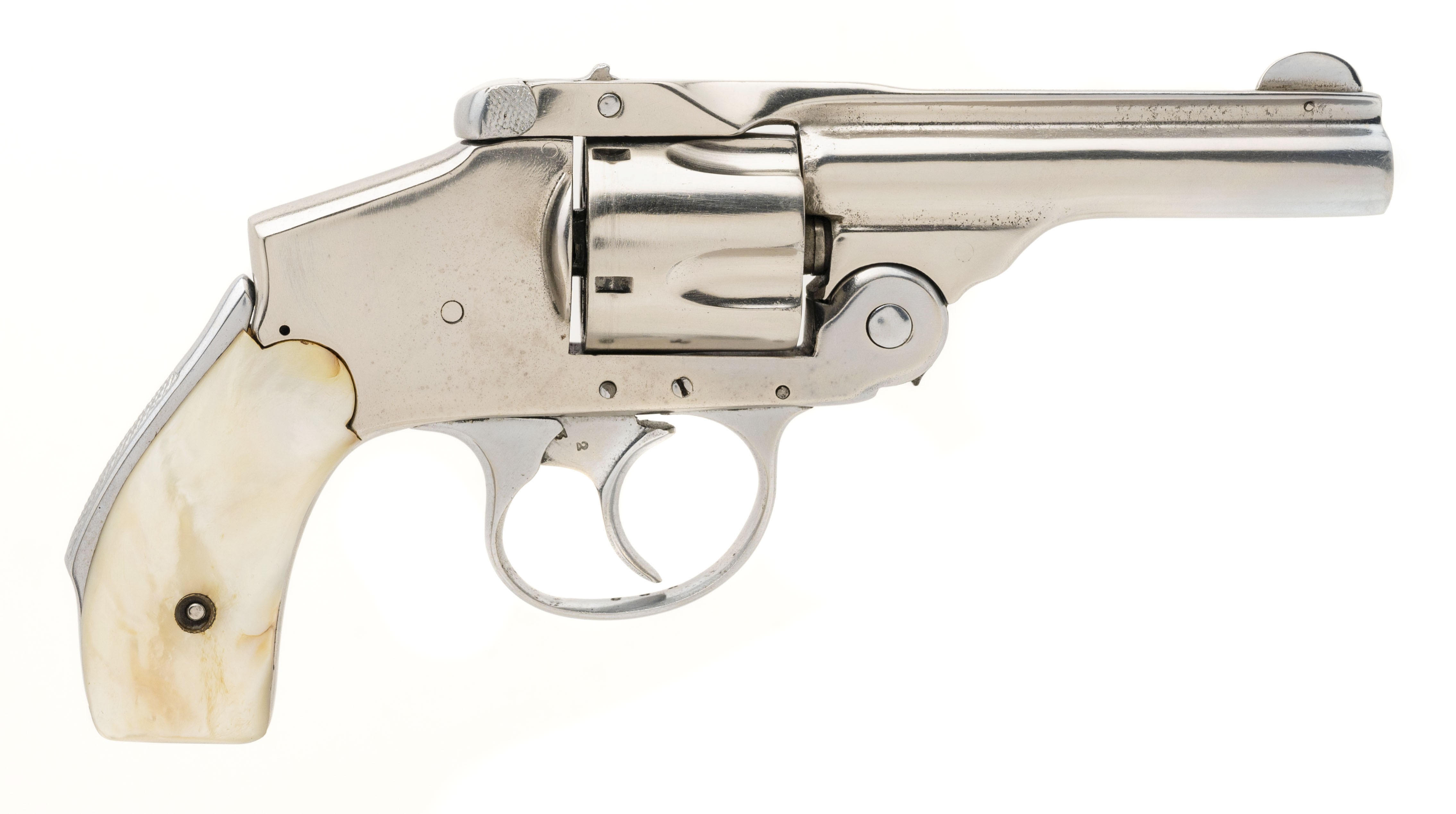 SN: 0530. Early 1900's .38 S&W with a 3.5" barrel. The bore is fair, pitted but with visible rifling. Spanish made copy of a S&W Lemon Squeezer. Has been chrome plated and has pearl grips. Looks great, overall good condition.