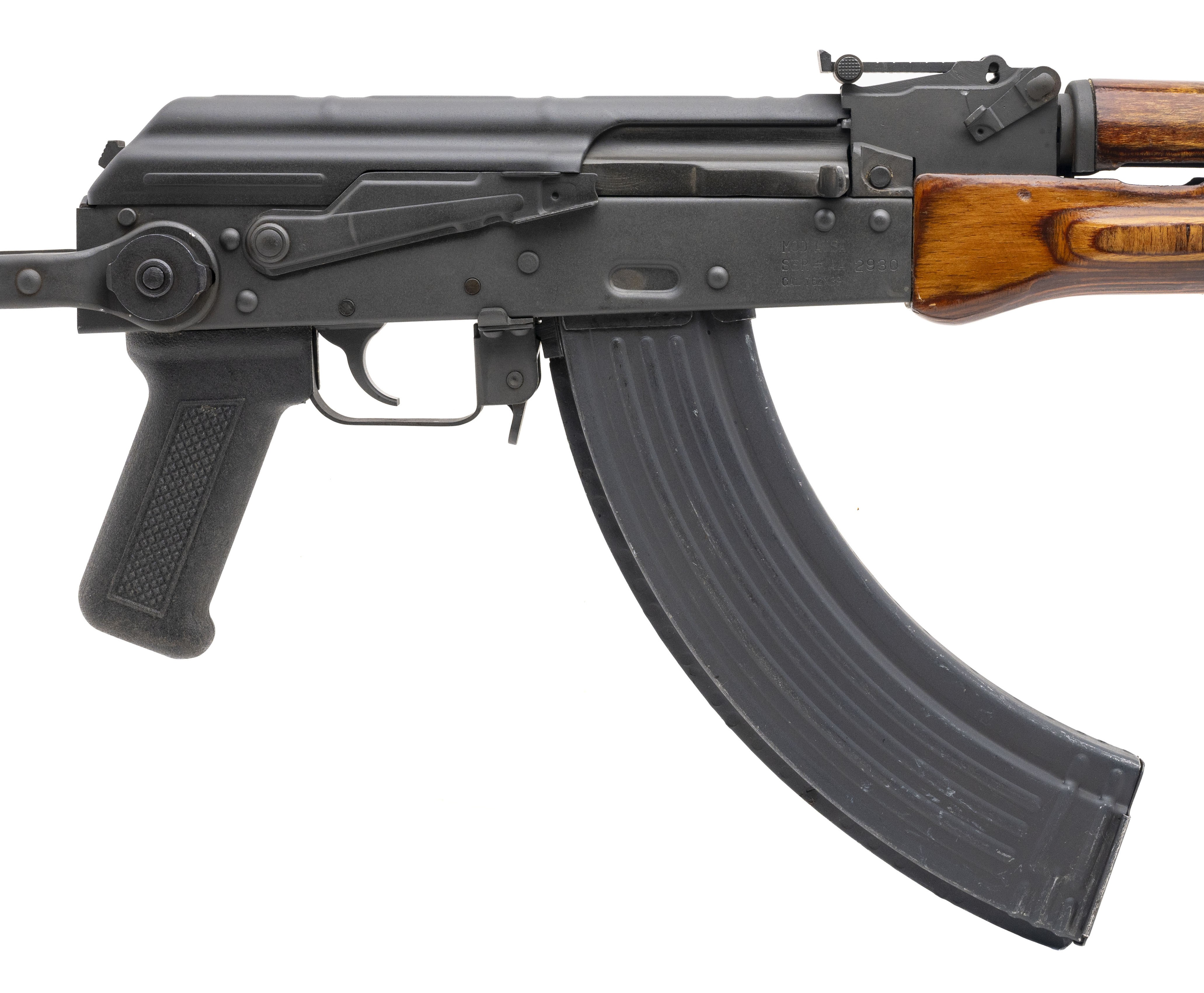 SN: AA2930. Made by armory USA of Houston, Texas with a 16-inch barrel chambered for the 7.62x39mm cartridge. This Arsenal AMD-63-2UF was assembled using a 1981-dated Polish circle 11 trunnion, a Polish military surplus chrome-lined barrel, a Polish bolt, & a US made 922(r) compliant black polymer pistol grip. Overall condition is reconditioned but very good nevertheless with a dull gray phosphate across all metal parts & a bright bore. Consignment