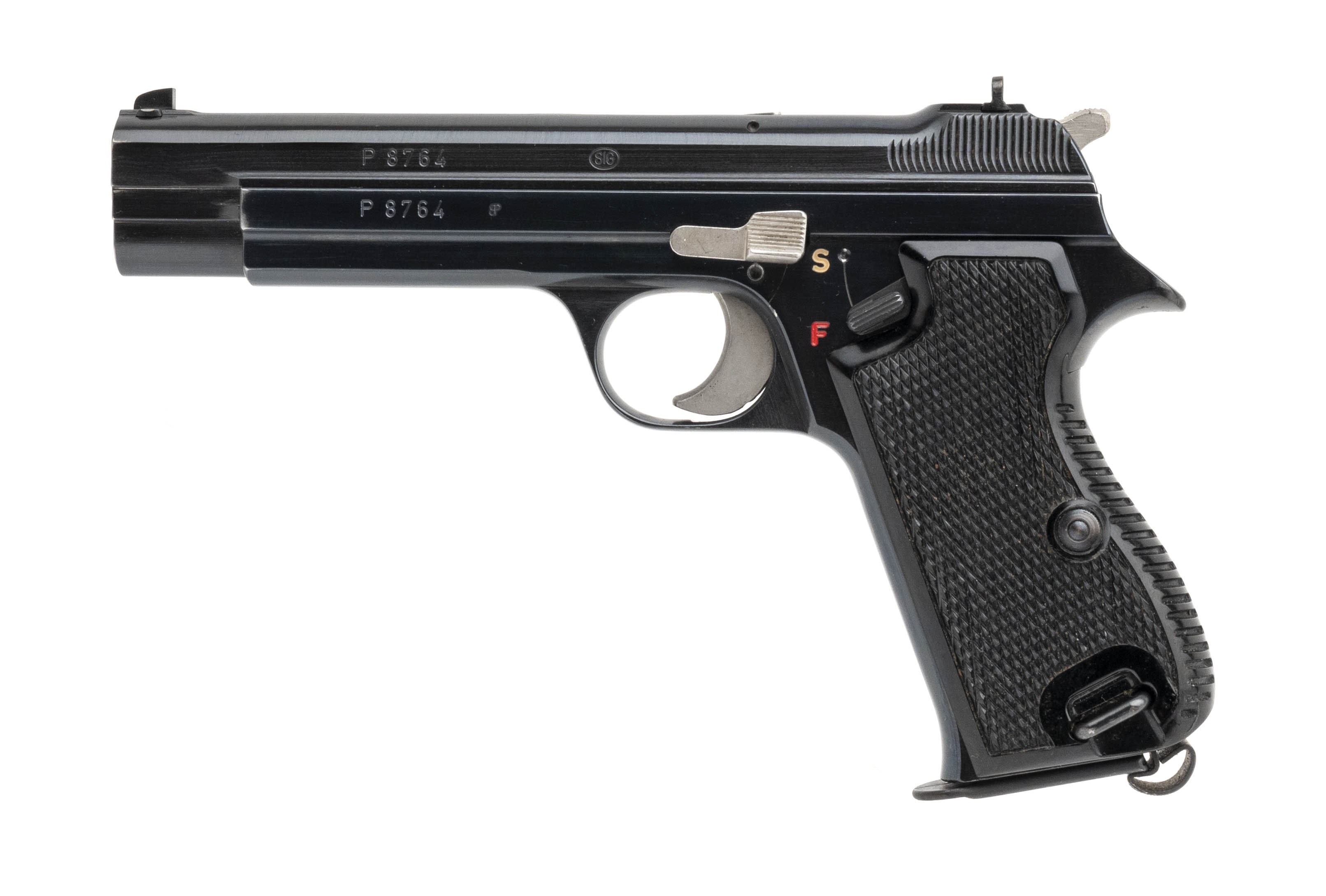 SN: P8764. 1950's vintage 9mm with a 4.7" barrel. Bore is excellent. Rare Police model pistol with loaded chamber indicator. Has 98% original finish. The grips are excellent. A very rare SIG P210 pistol. (CONSIGNMENT)