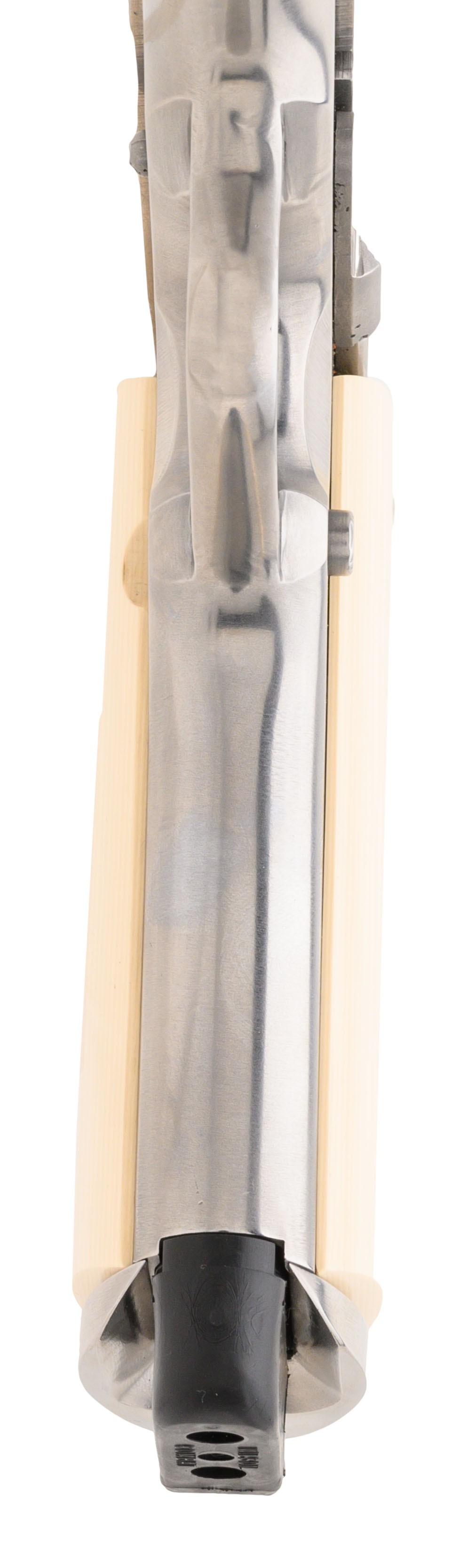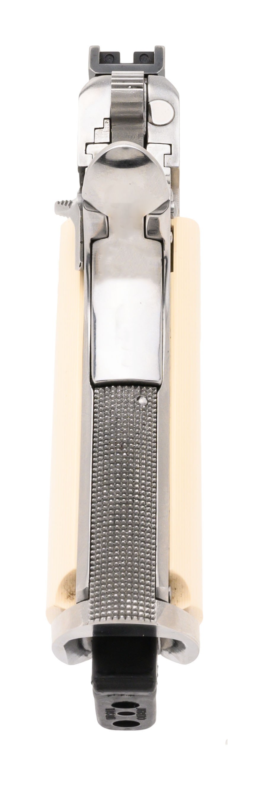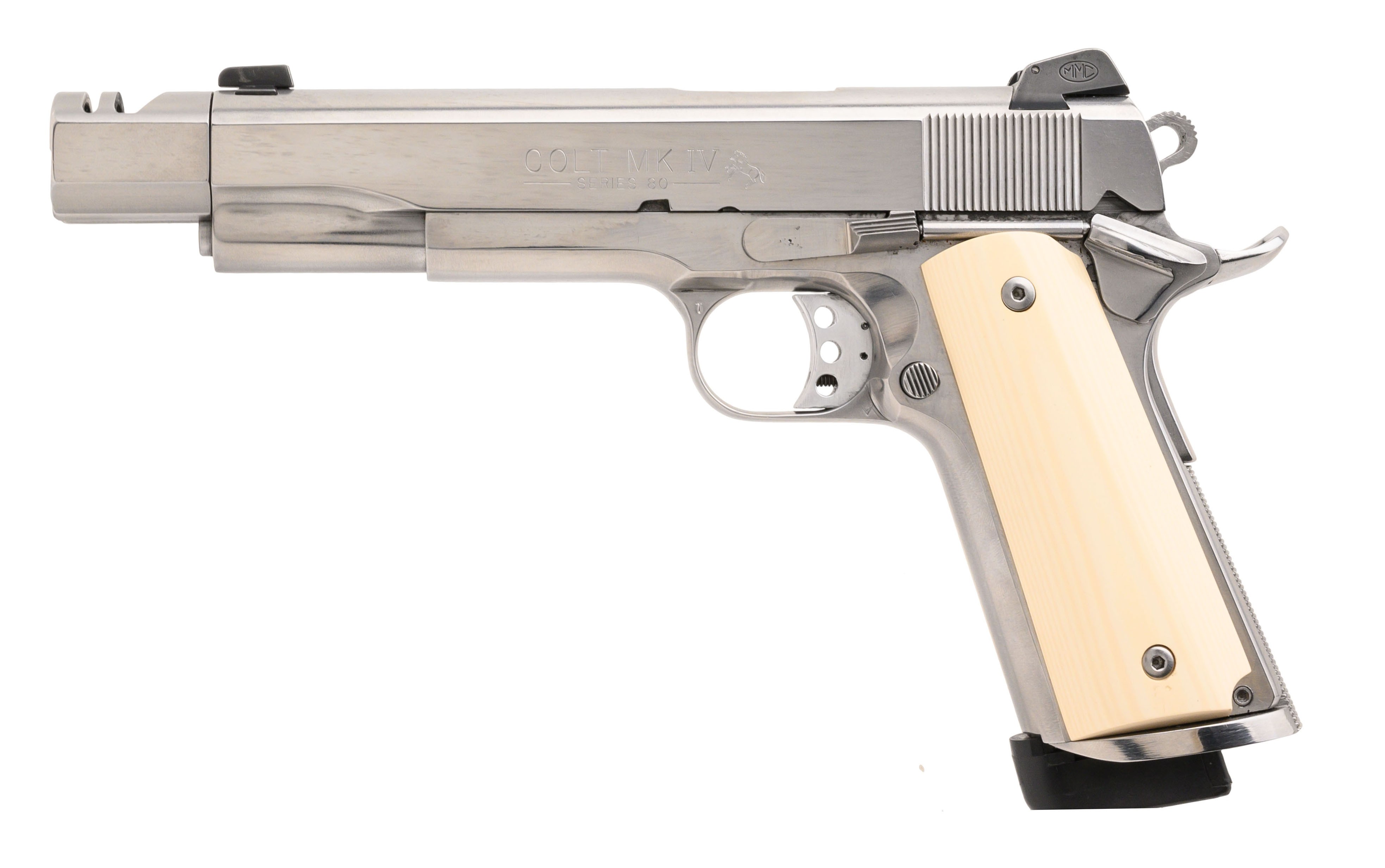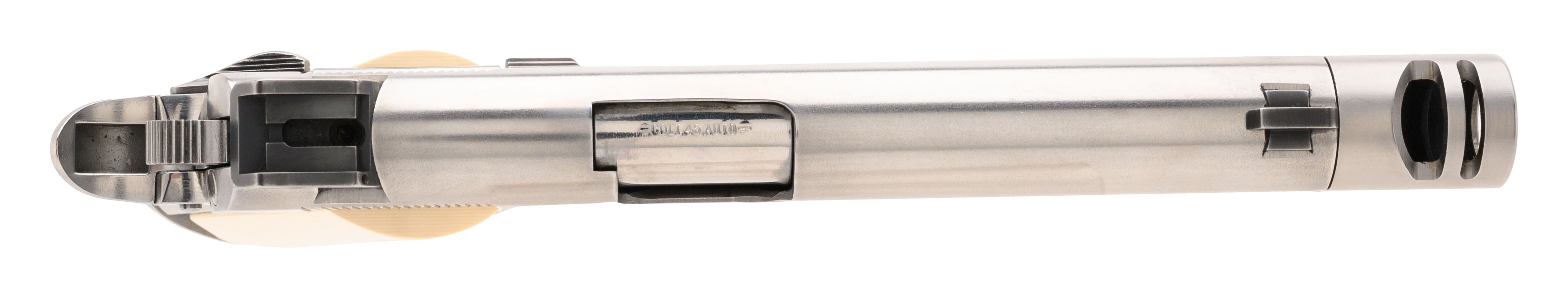 SN: SS07020. Made in 1985. .45 ACP with a 5" barrel. Bore is in very good condition. Polished stainless steel Series '80 Government Model with a Compensated barrel, custom sights and magwell. Metal is in very good condition with light wear noted. Has fancy Tru-Ivory grips. Overall very good condition with box.