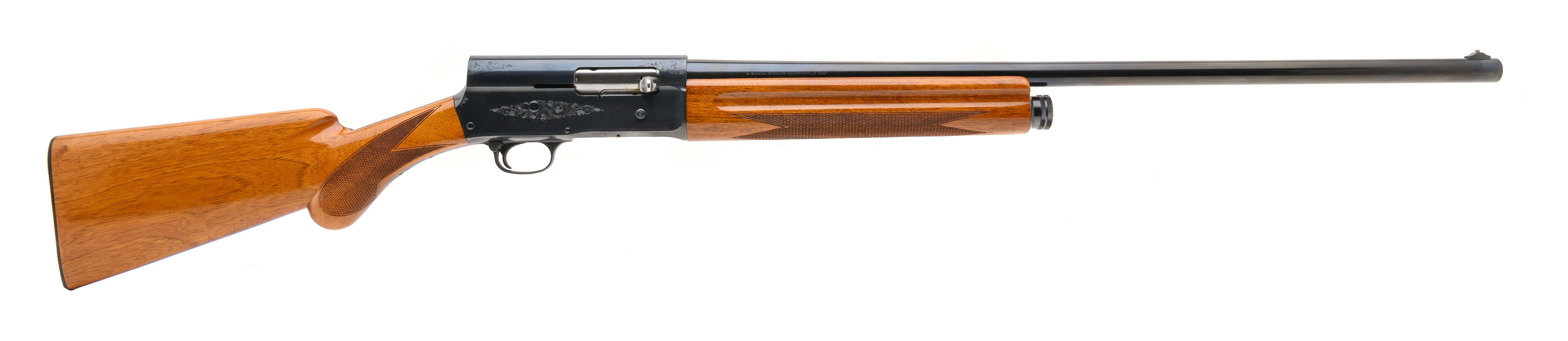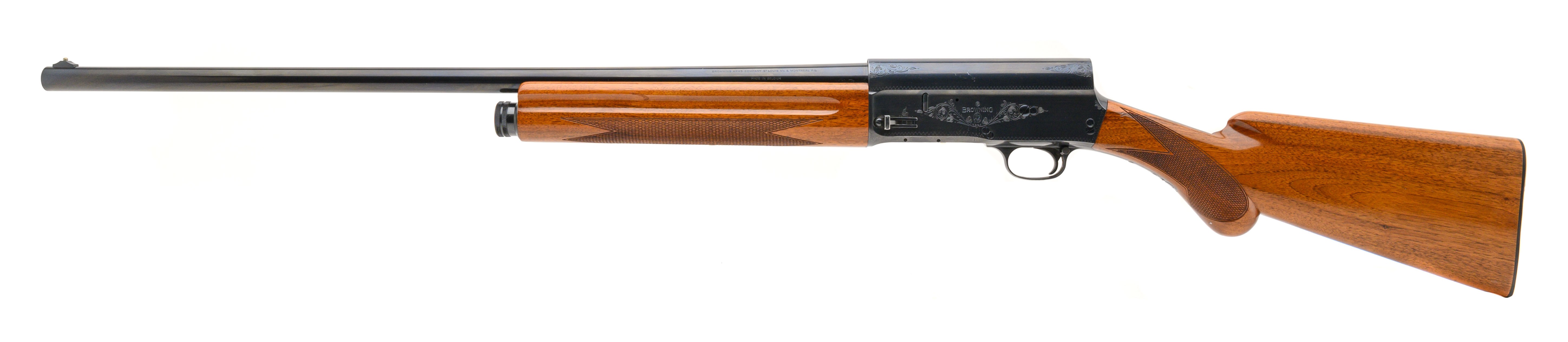 SN: 6M55535. Made in 1966. 12 Gauge with a 27.5" full choke barrel. Bore is near excellent. Semi-automatic Belgian made Browning field gun. Finish is in very good condition with lightly peppered patina on the receiver. Stock shows very light handling wear with sharp checkering. Overall very good condition.