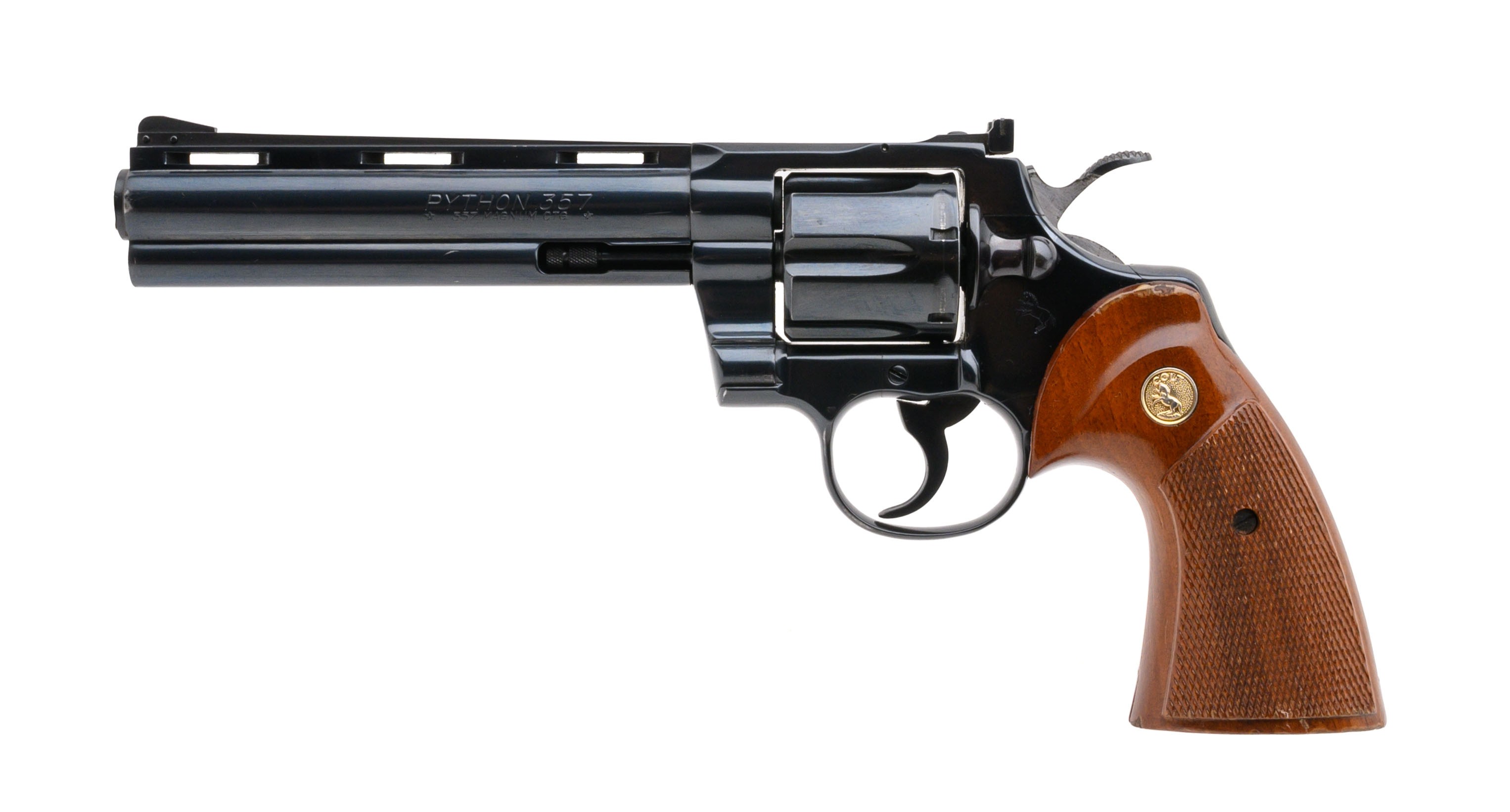 SN: K75993. Made in 1982. .357 Magnum with a 6" barrel. Bore is bright with strong rifling. Colt double action snake gun. Royal blue finish is in good condition with thinning noted near the muzzle. Grips show handling wear with strong checkering. Overall very good condition.