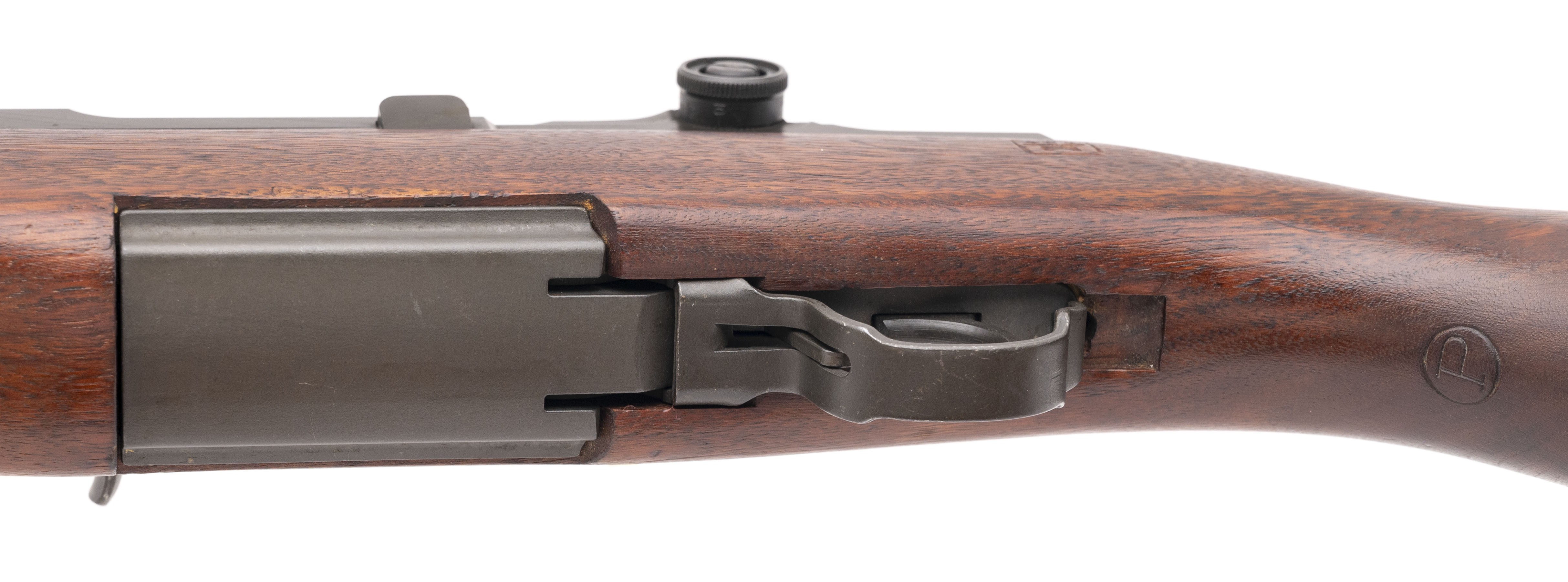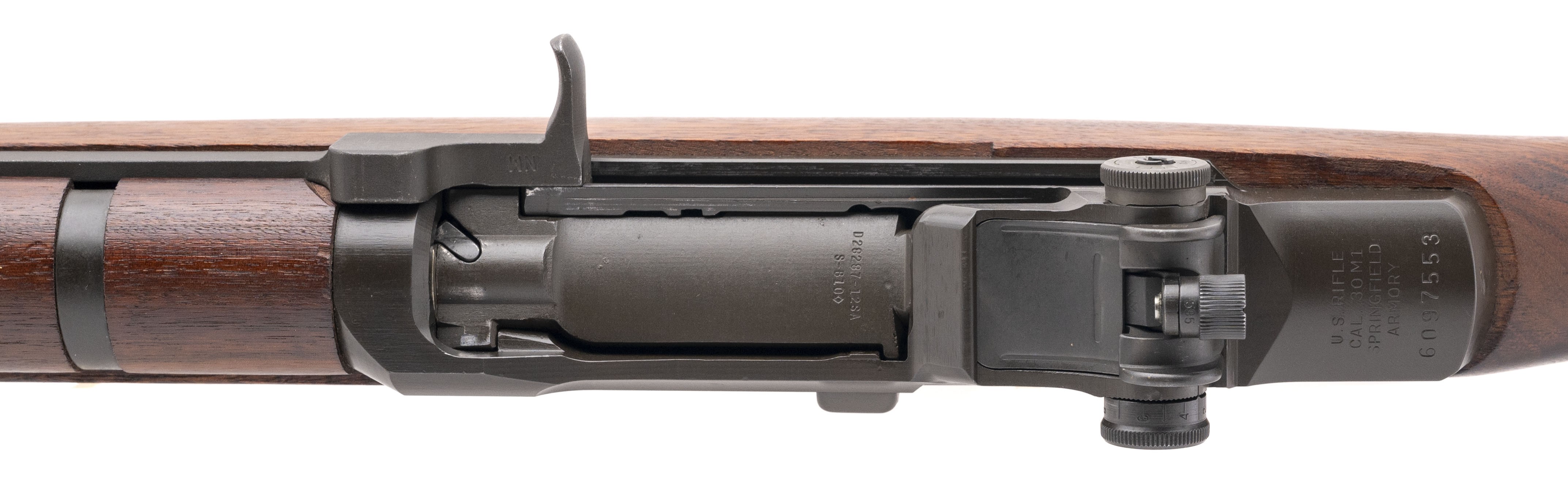 SN: 6097553. Made in 1957 at Springfield Armory in 30.06 with a 24" dated National Match barrel. Bore has shiny and strong rifling. Springfield M1 Garand converted to a National Match rifle through the use of a National Match Op-Rod, barrel, rear sight, and glass bedded stock. Rifle has S-B10 bolt, "P O" marked Poppet valve gas cylinder lock screw. Stock is in near perfect condition with the DOD eagle stamp present. Overall near perfect condition National Match M1 Garand with an excellent finish. Rifle comes with reproduction 1907 sling.