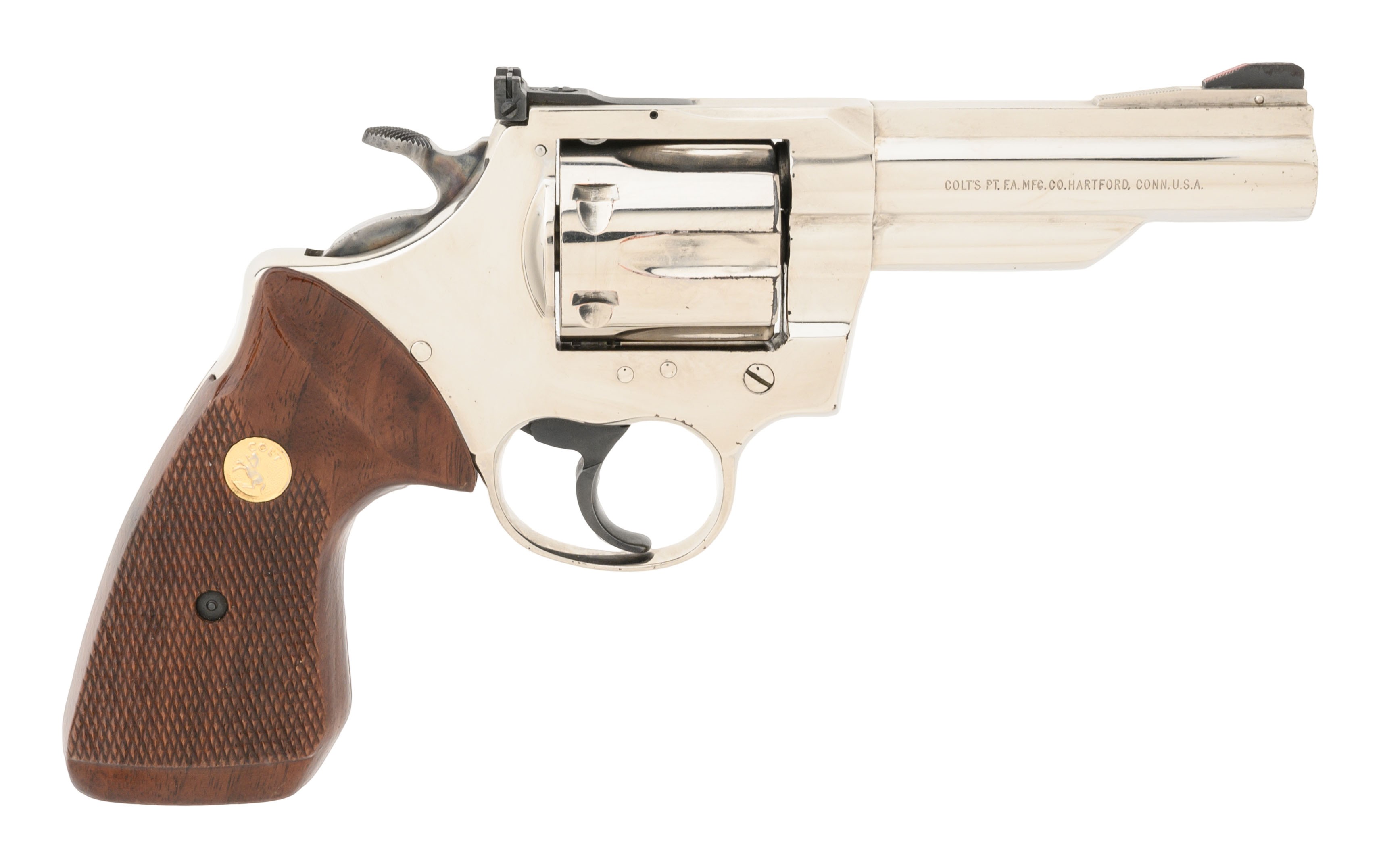 SN: 34037U. Made in 1982. .357 magnum with a 4" barrel. Bore is in very good condition. Colt double action revolver. Nickeled finish and grips are in very good condition with handling wear. Overall condition is very good.