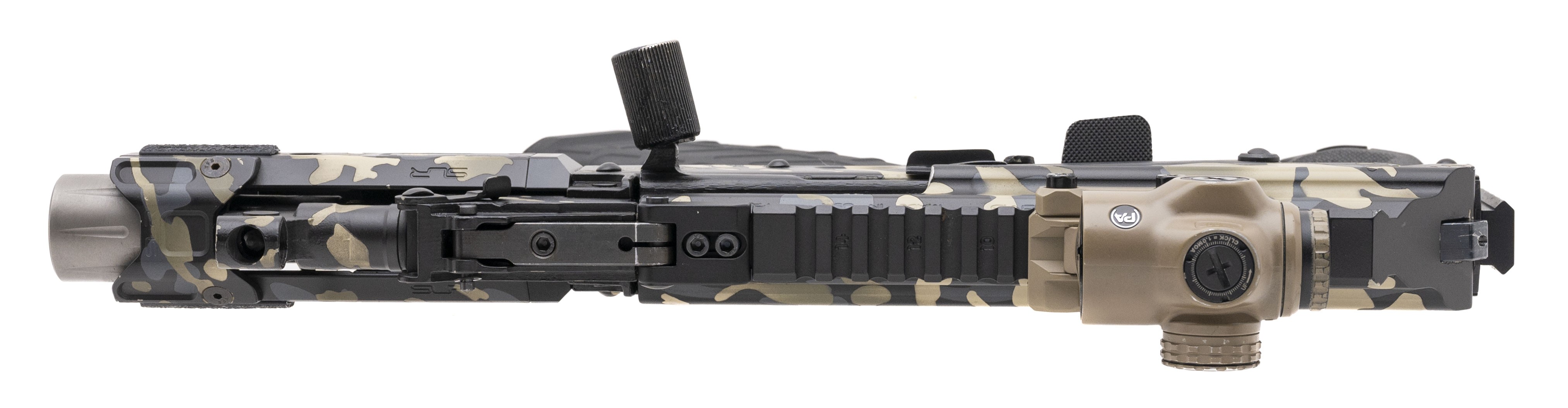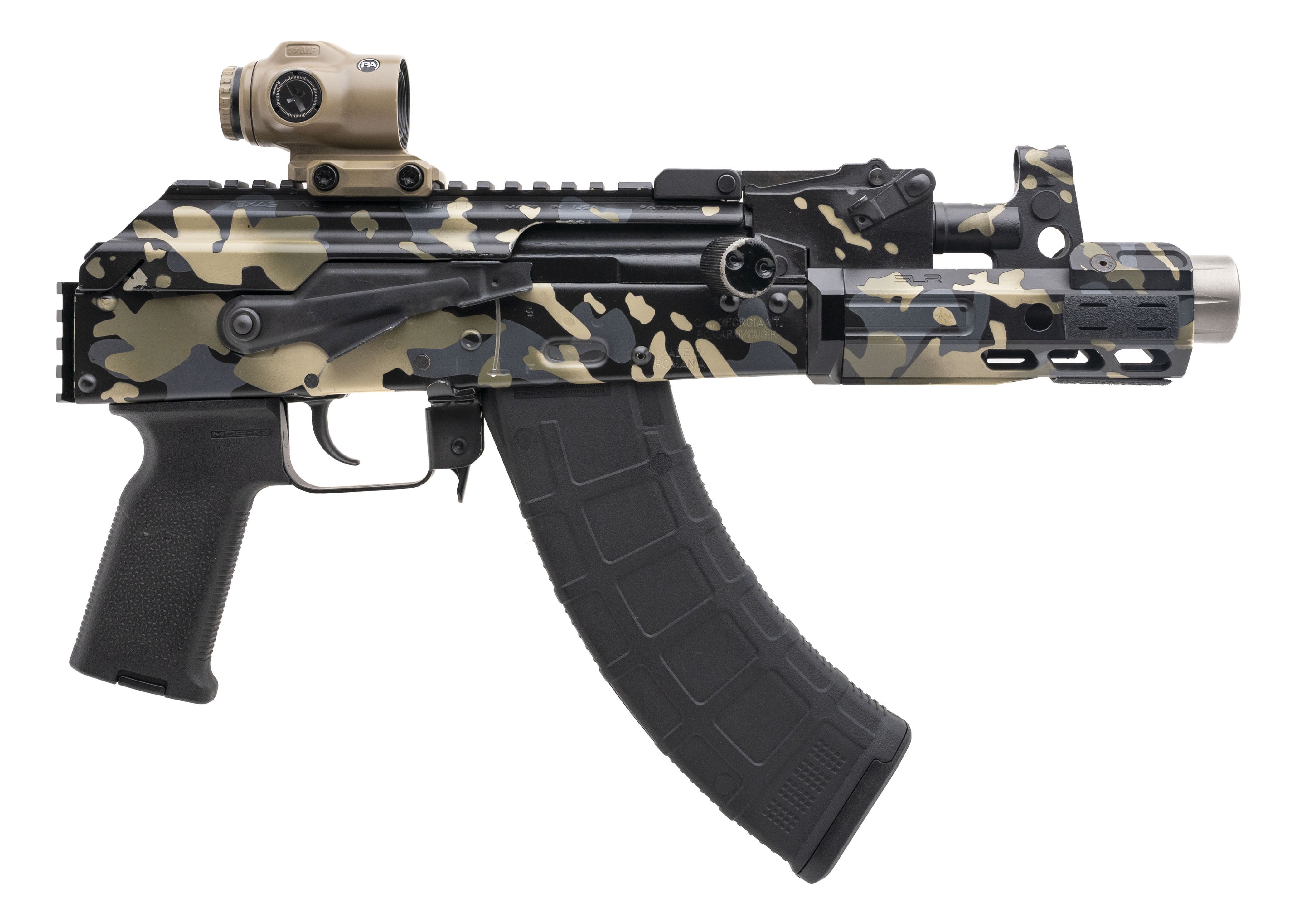 SN: PMD-21317-20ROA. Modern production. 7.62x39 with a 6.25" barrel. Bore is excellent. Romanian made AK Pistol. Camo finish is in very good condition with light handling wear. Pistol comes with a Texas Weapon Systems dust cover, SLR handguard, and a Cyclops red dot sight. Overall very good condition. (Consignment)