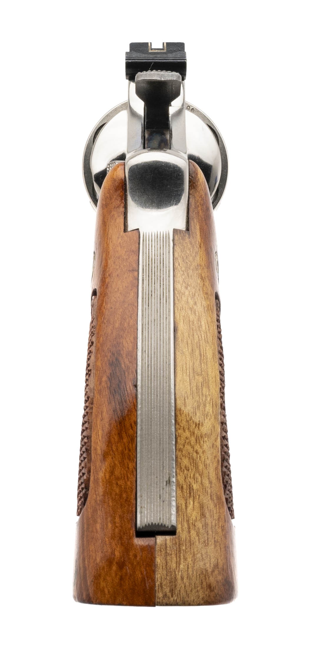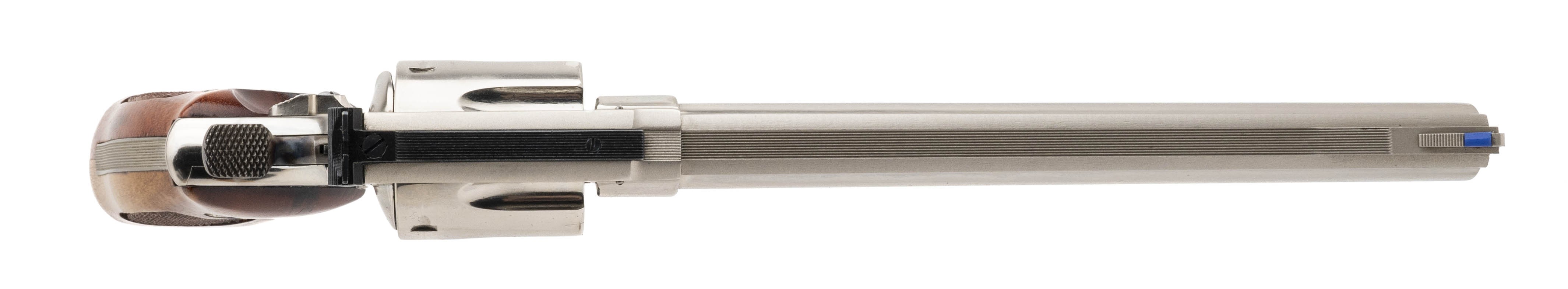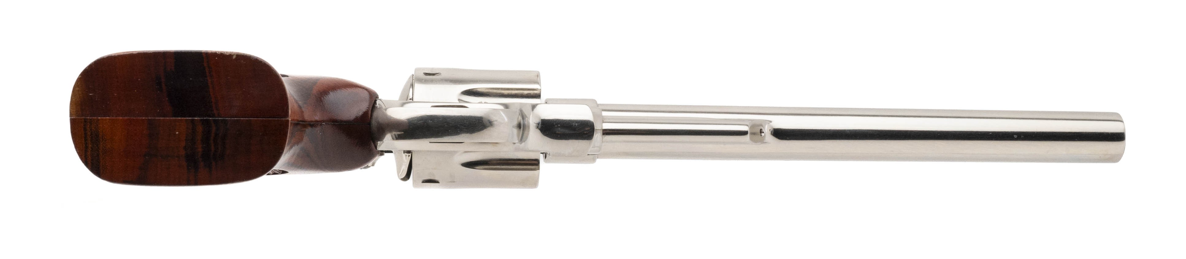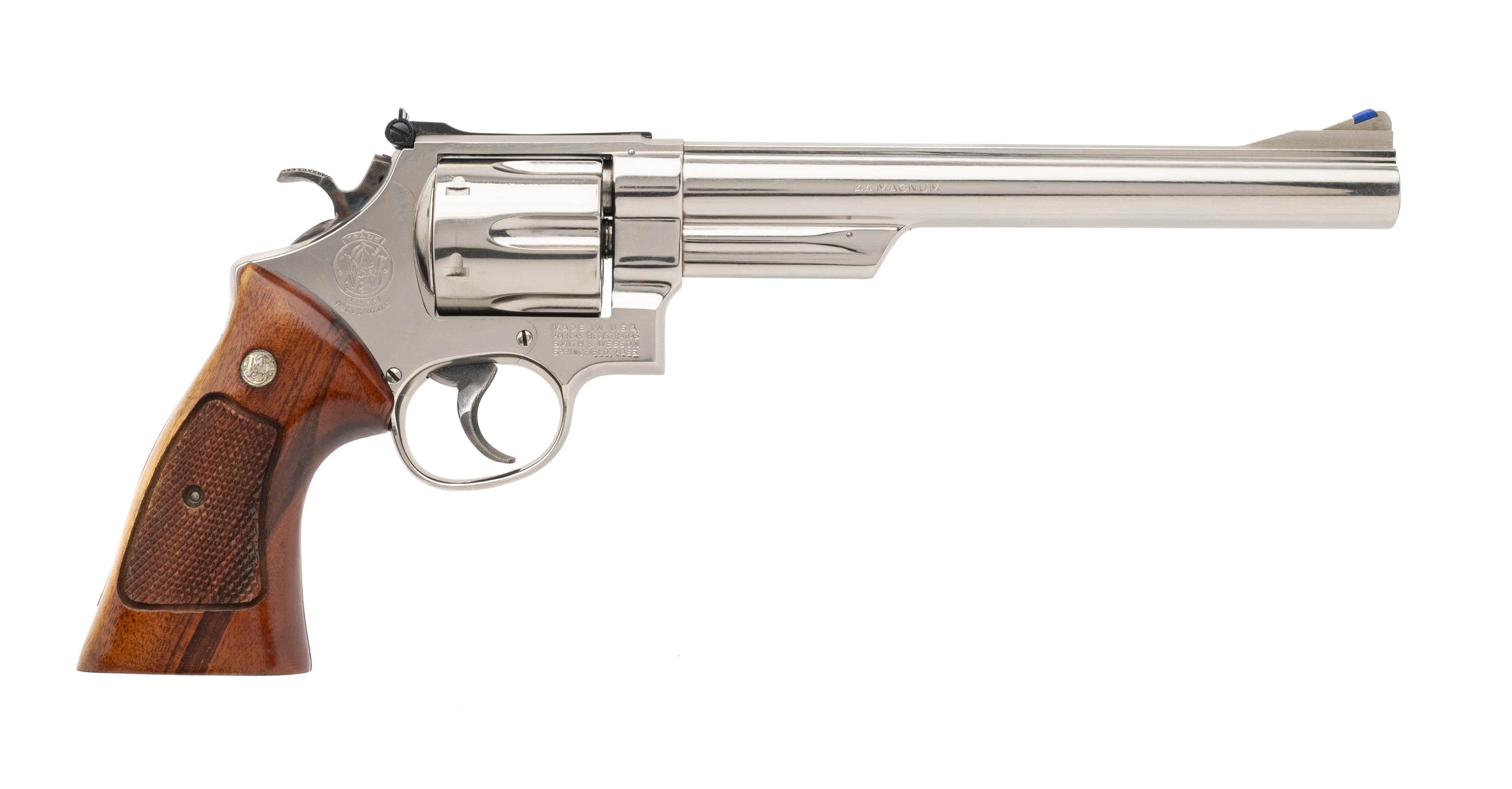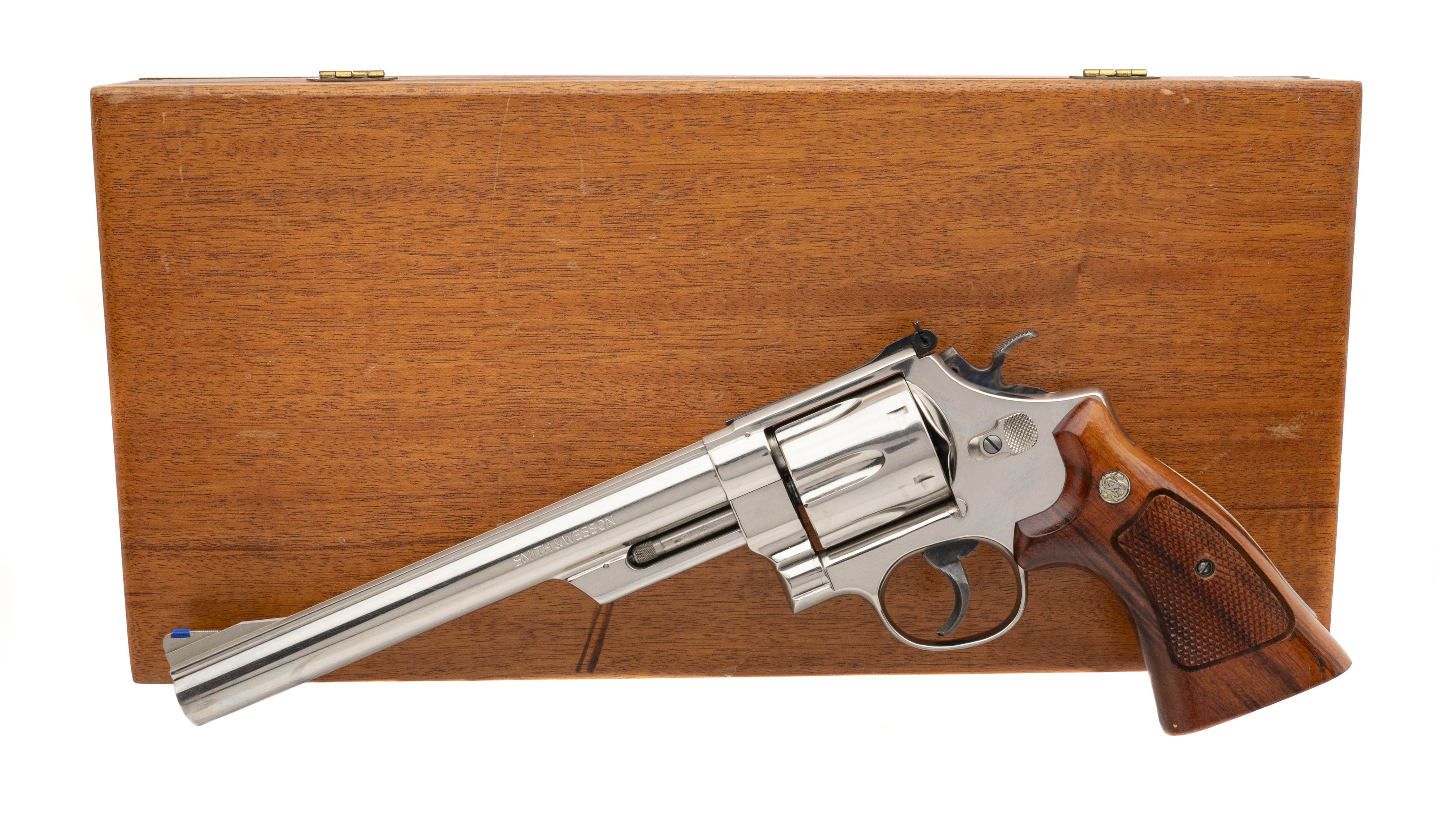 SN: N313268. Made circa 1970s vintage. 44 mag with a 8.375" pinned barrel. Bore is in excellent condition. S&W double action Nickel plated N frame revolver with recessed cylinder. Metal is in near excellent condition with minimal wear. Wood grips are in near excellent condition with minimal handling wear. Overall condition is near excellent. Comes with presentation case. (Consignment)