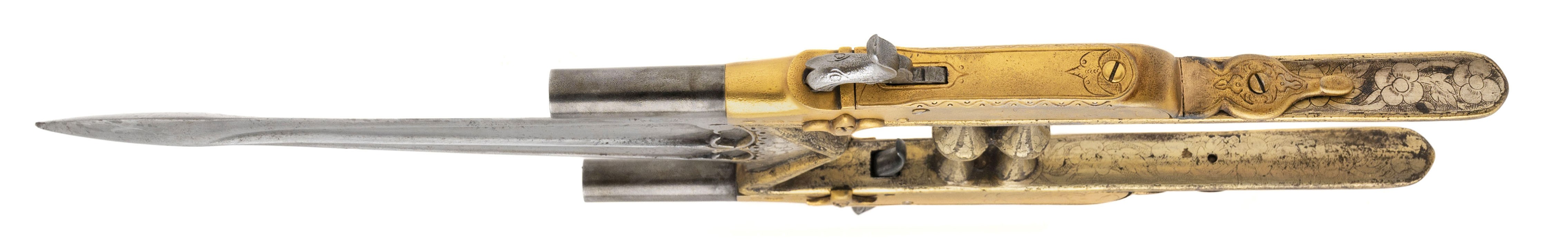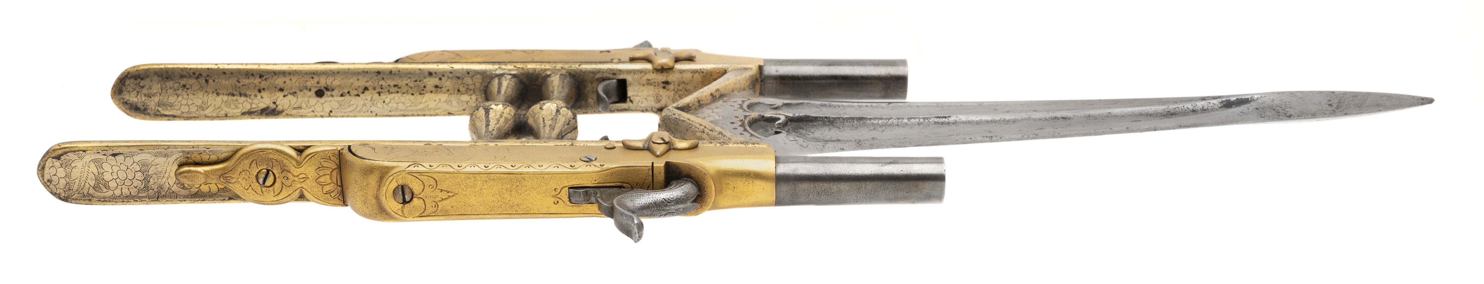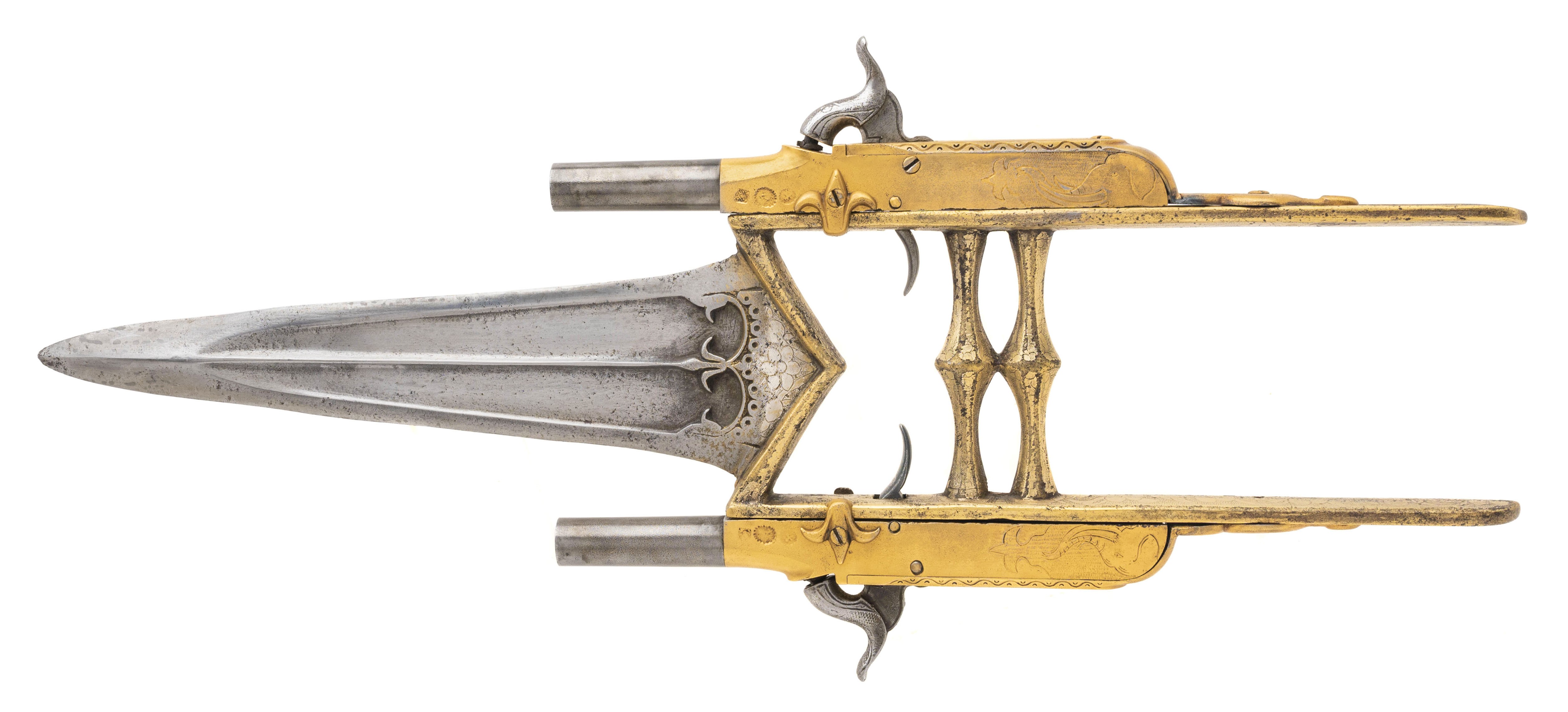 NSN. Blade made late 18th Century and Guns added in 1840s-1850s. Very rare combo weapon. Most of the one you see are 20th century fabrications. This one is original. The Katar is 17” in total length. Each gun is 44 caliber.