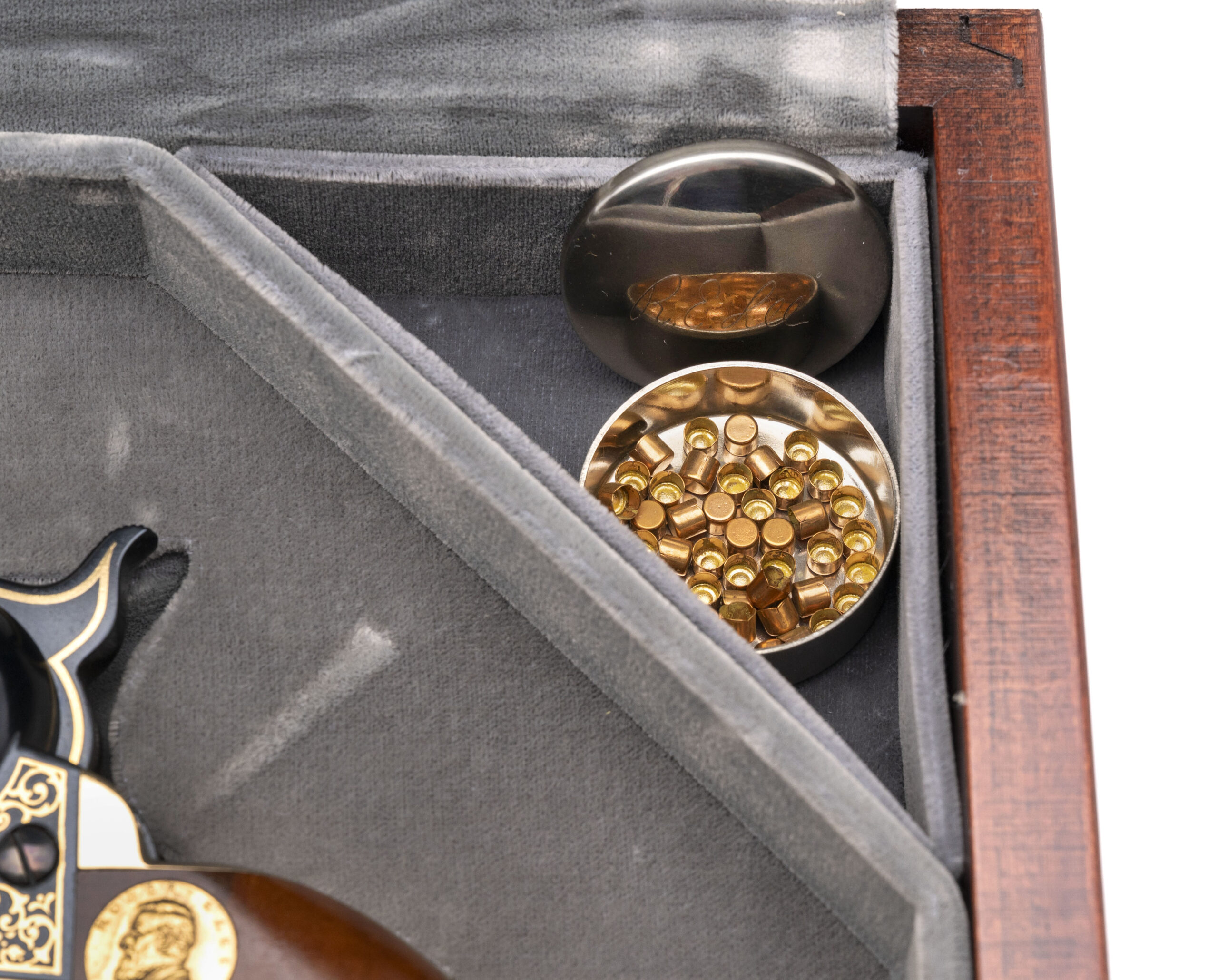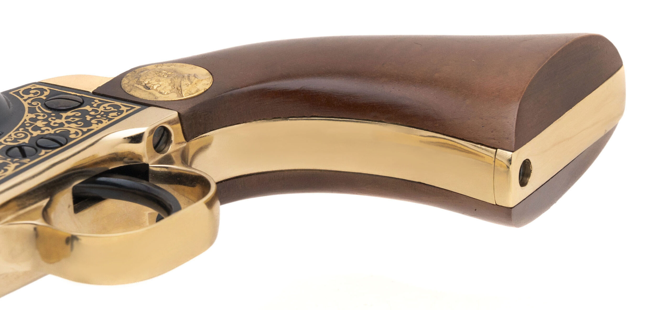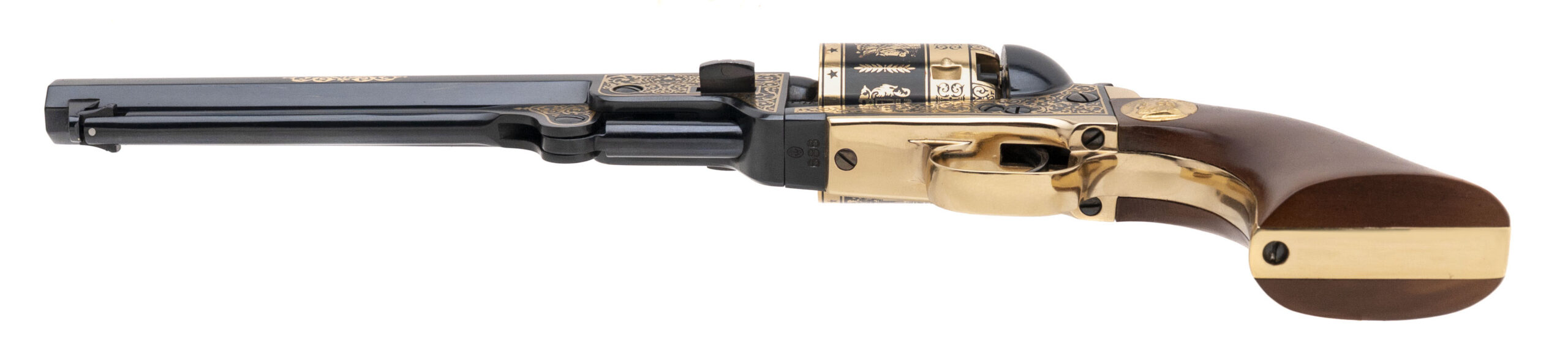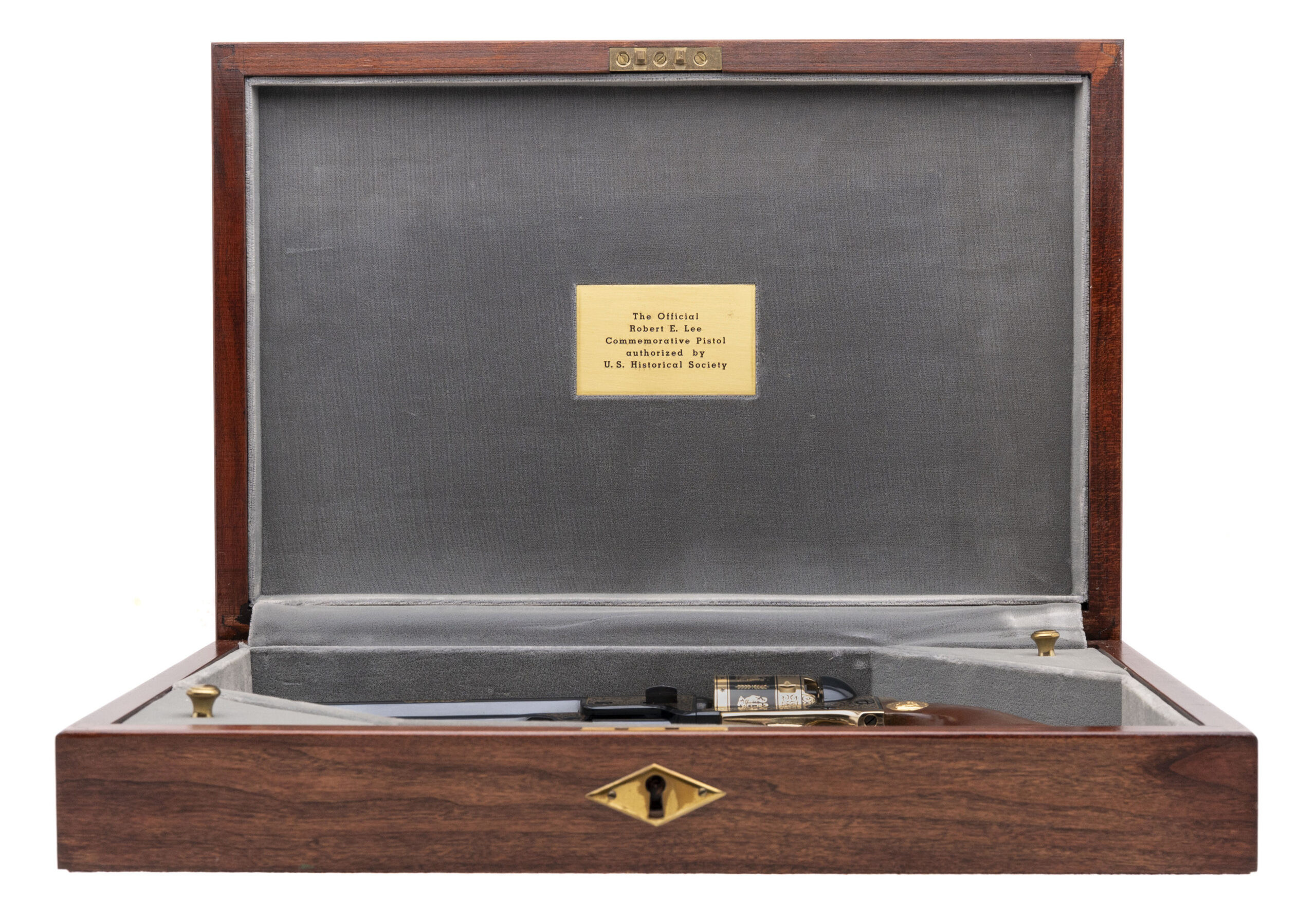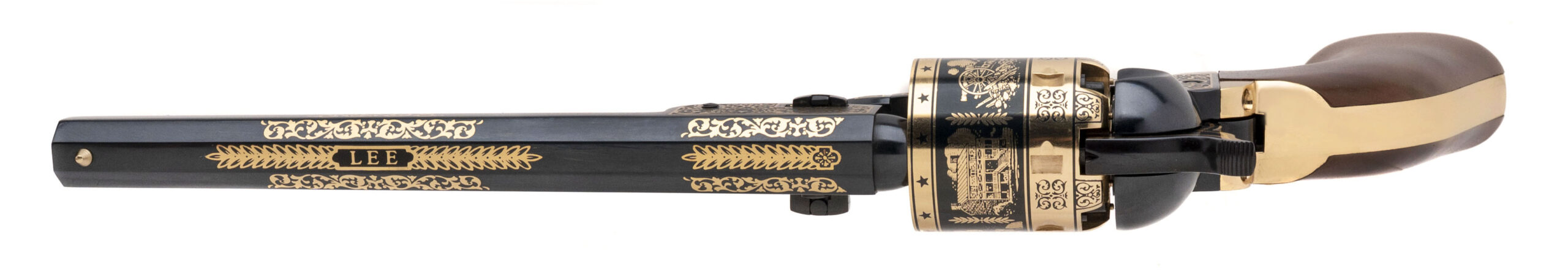 Made circa 1980's. Robert E. Lee Commemorative black powder 1851 Navy revolver embellished with gold scroll and scenes. Excellent condition with presentation case, accessories and papers.