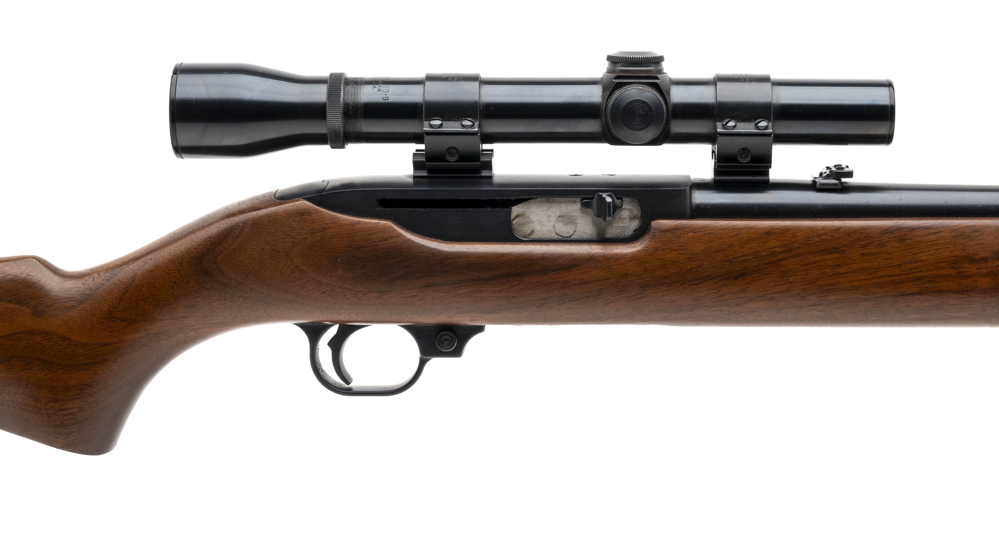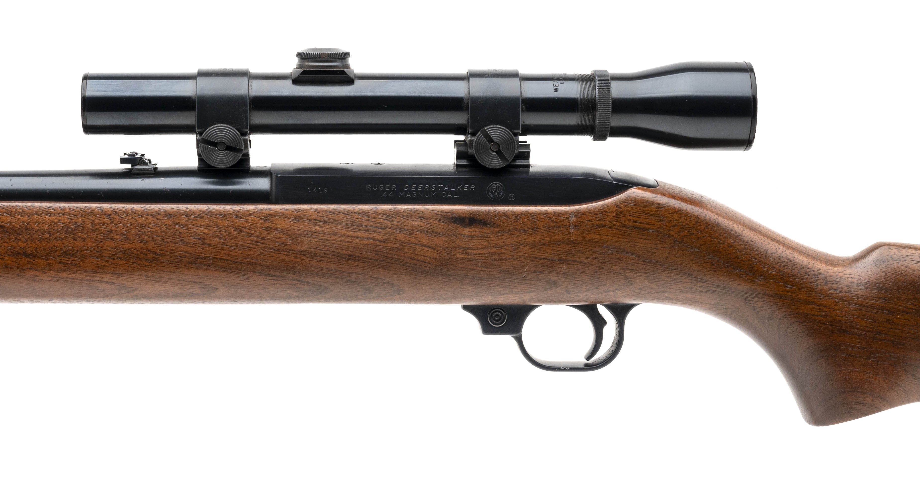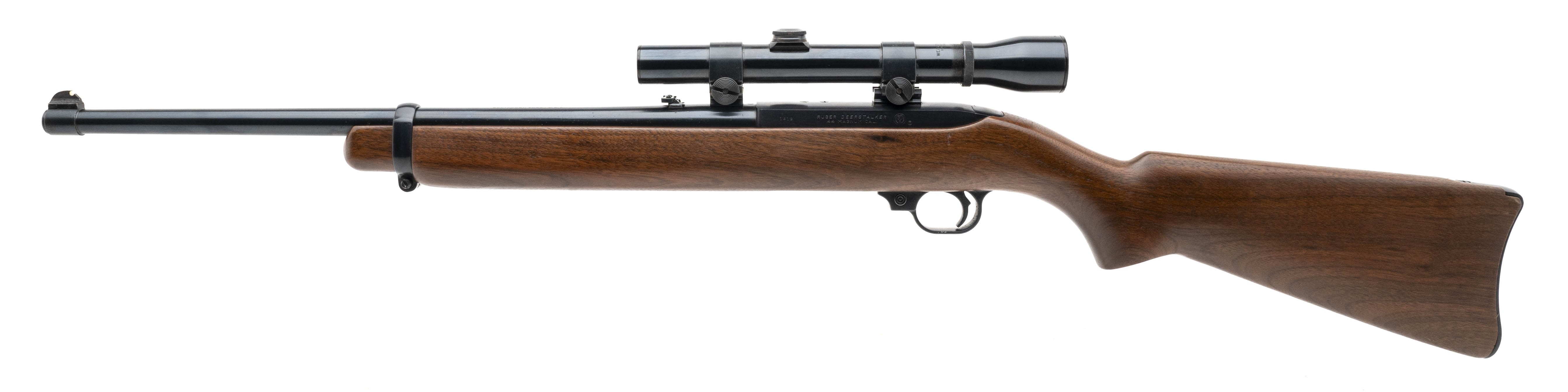 SN: 1419. Made in 1962. .44 Magnum with a 18.5" barrel. Bore is excellent. Rare Ruger semi-auto carbine with "Deerstalker" marked frame. Only 3750 were made. Finish is in near excellent condition with speckling wear near muzzle. Wood stock is in excellent condition. Comes with Weaver K3 scope. A fine example.