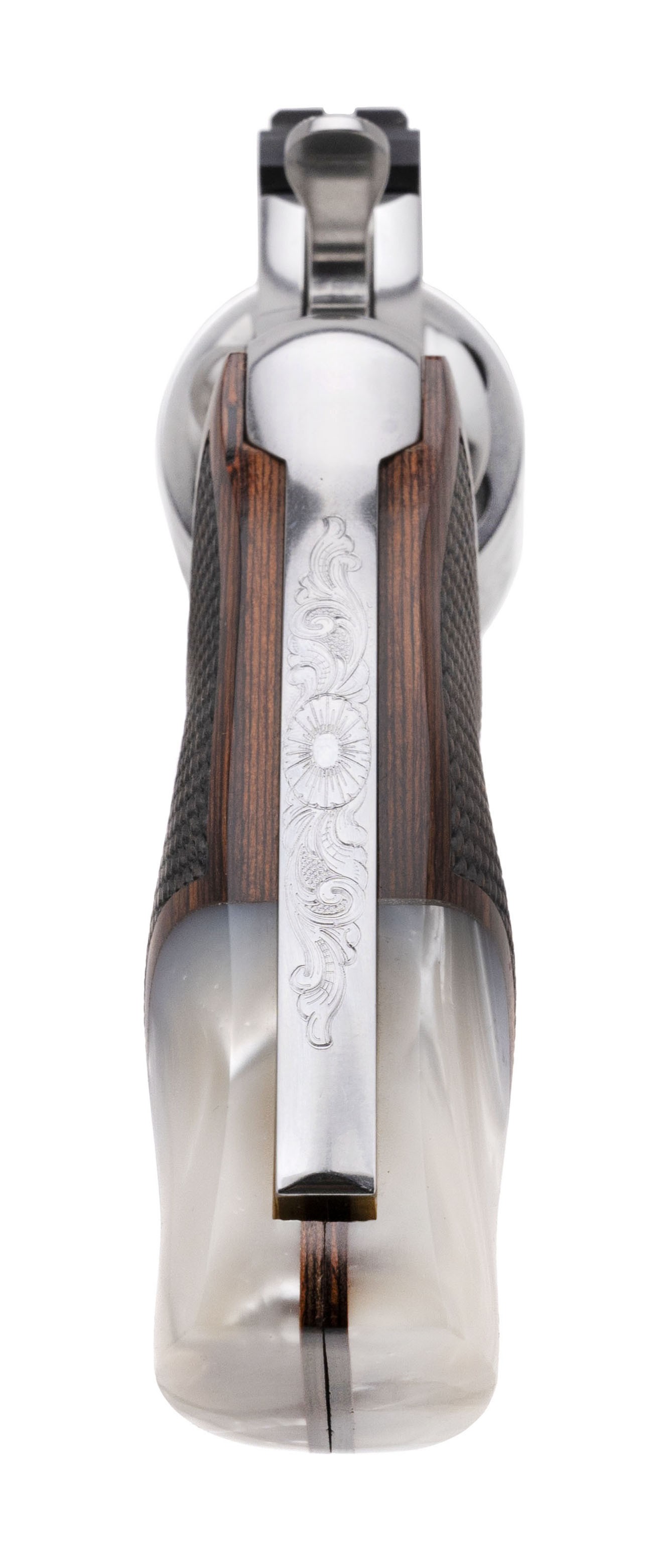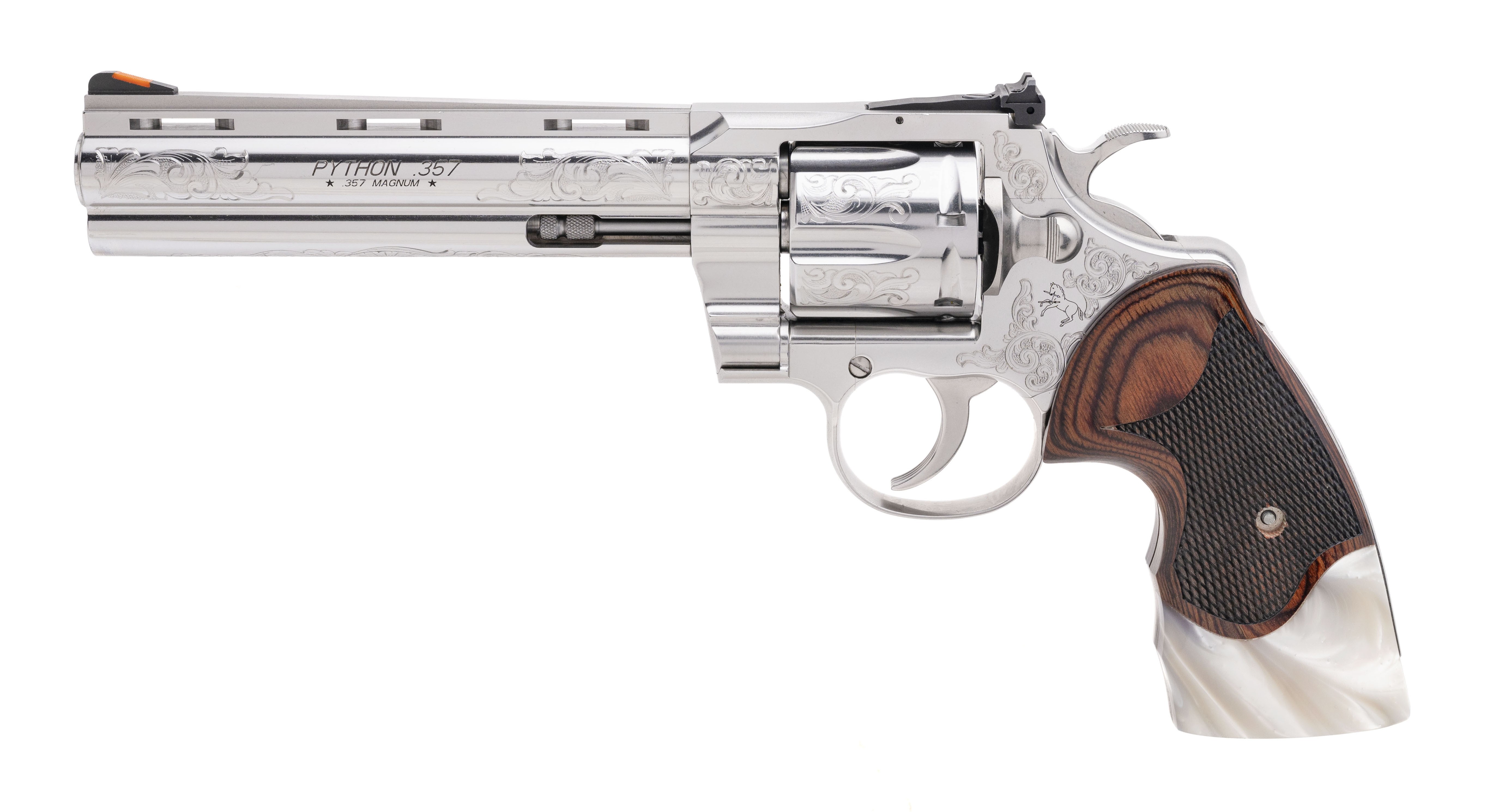SN: PY332471. Modern production .357 Mag with a 6” barrel. Beautiful polished stainless steel engraved Python with fancy hybrid wood/pearl grips. Issued by Custom and Collectable. Excellent condition with box.