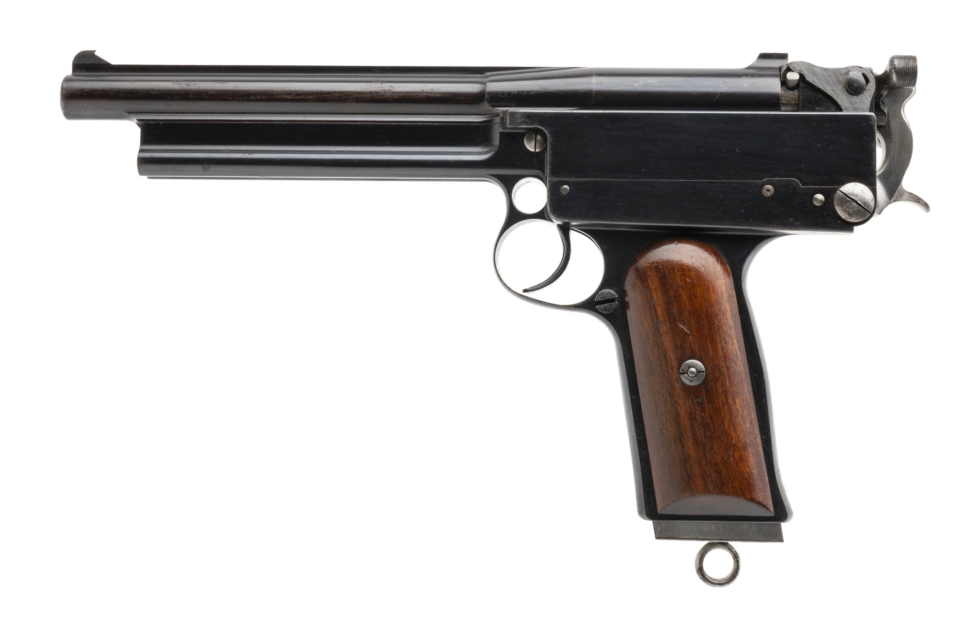 Serial number 46. Made Approximately 1900. 450 Caliber with a 8 ¾” barrel. This is an incredibly rare gun with only a handful surviving. One has not been offered to the market in close to decades in 450 Caliber. This gun is in near mint condition as professionally restored long ago. The Grips are excellent. This was one of the first automatic pistol and held the title of most powerful handgun for a number of years. This may be once in a lifetime opportunity to own a Mars!