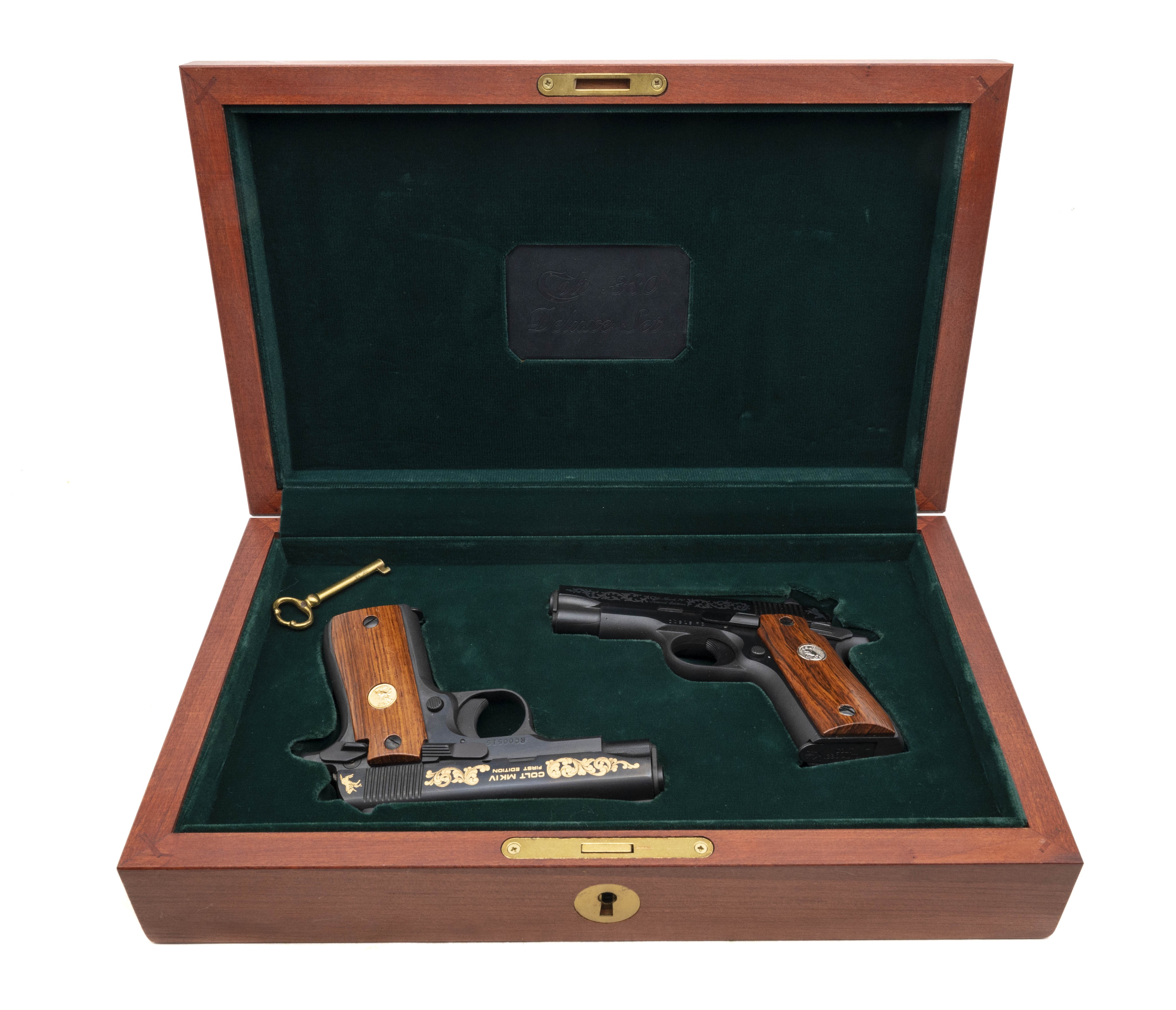 SN: RC00515/00515RC. Made in 1984, .380 ACPs with 3.75" barrels. Matched set of .380 Govt pistols, one marked "First Edition" and the other "Second Edition". Both guns are numbered 515. The set comes in a wooden presentation case. Overall excellent condition.