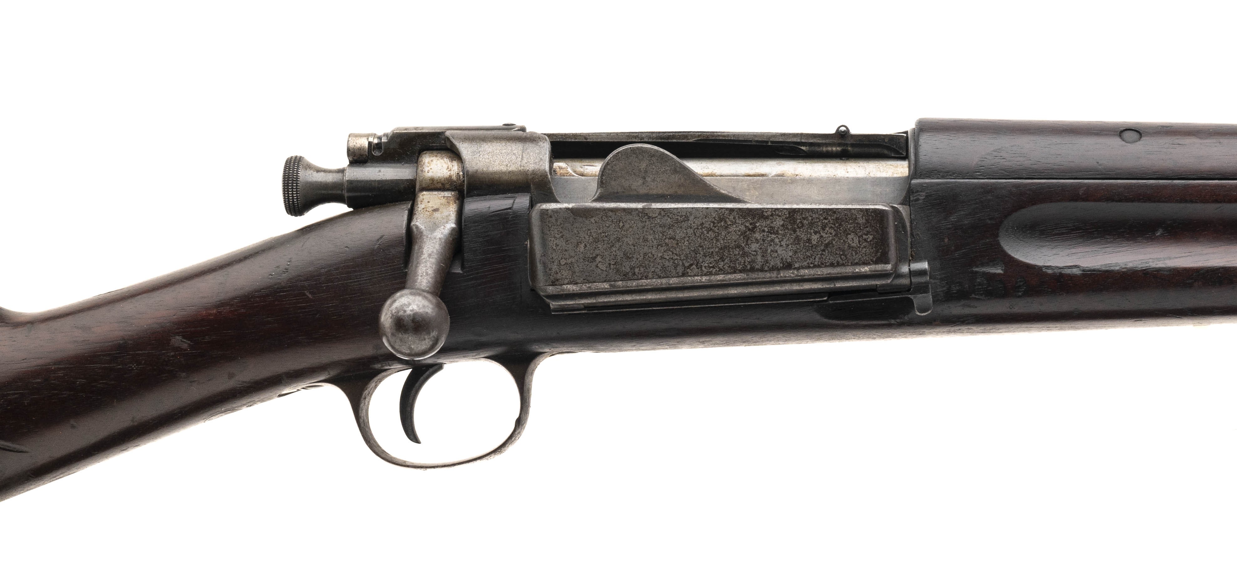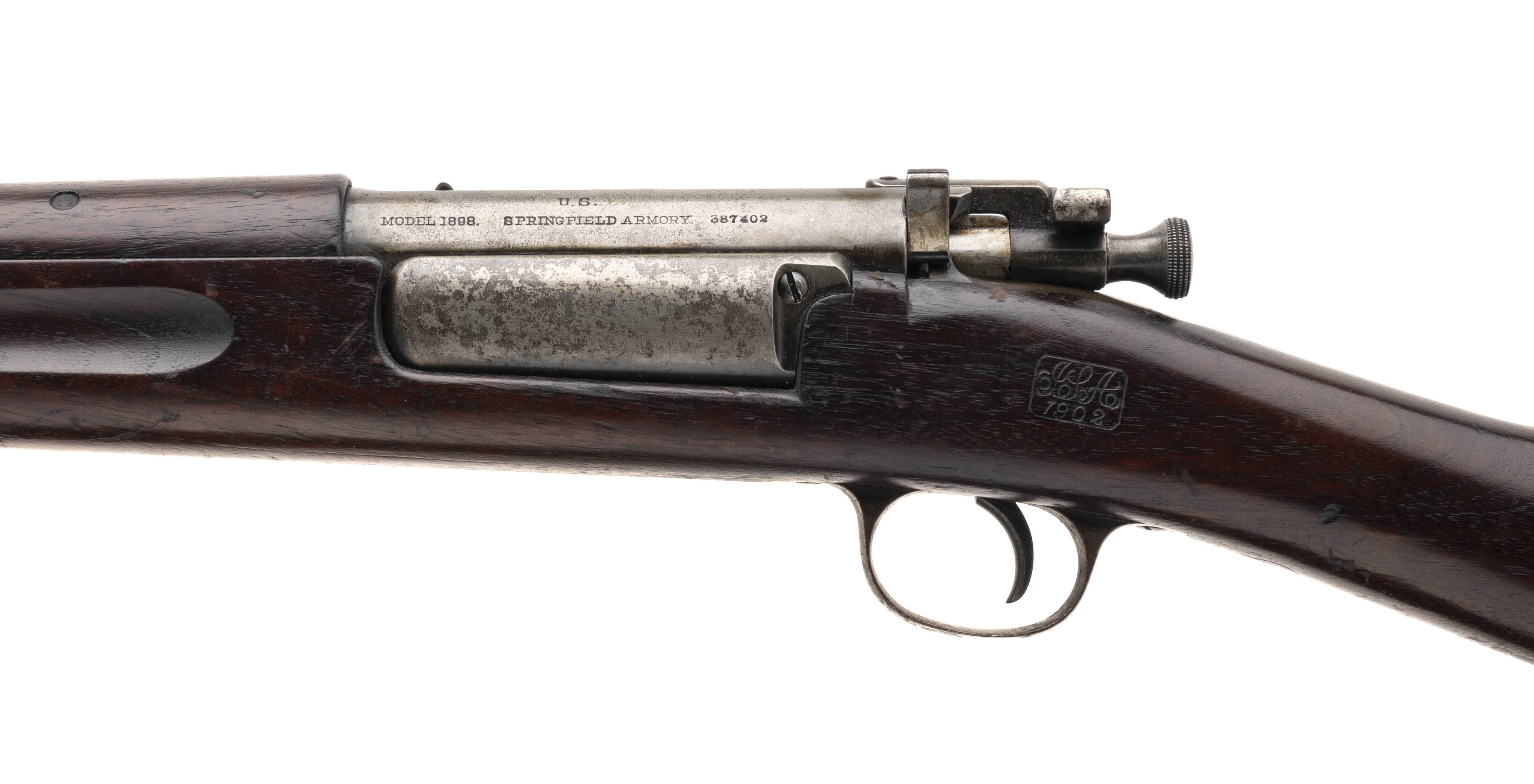 Serial No. 387402, made in 1902, .30-40 Krag, 30 ¼” round barrel. Bore is very good with strong rifling noted. Barrel, receiver and other metal parts are a grey patina with some areas of mottled discoloration noted on the gate. Stock has expected nicks, dings and scratches visible, handsome 1902 dated cartouche is visible left side. Action is smooth and functions correctly. Comes with a period correct leather sling that is starting to show flaking in some areas.