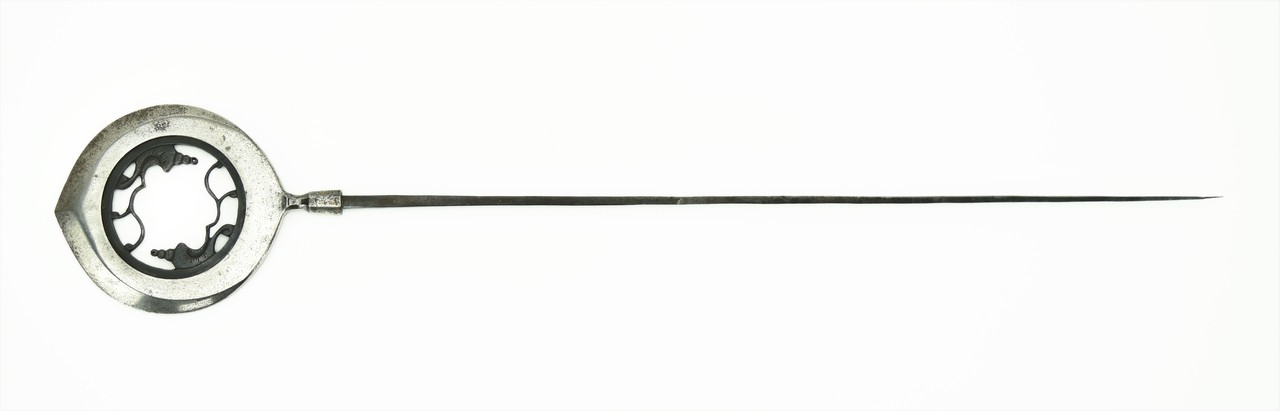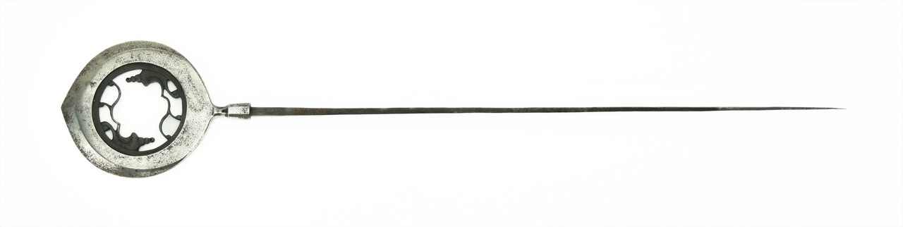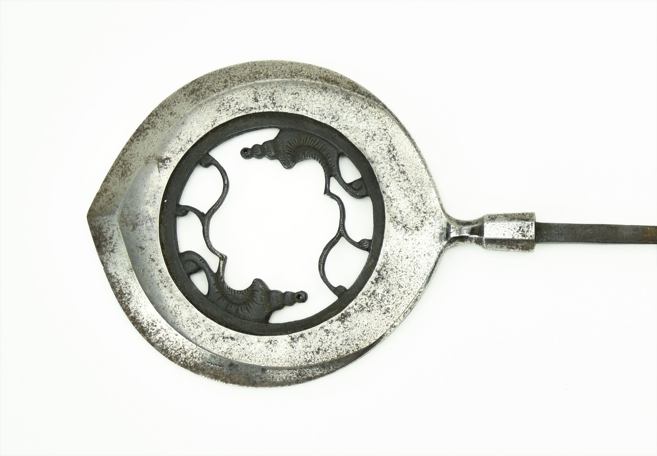 Large Presentation Arrowhead (Yanone) by Nobu Kuni Edo Period pierced with circular opening with design of conch shells and stylized waves signed: Nobu Kuni in Shirasaya 6 ½” (16.5 cm) long, 4 7/8” (12.3 cm) wide, 27 ¾” (70.5 cm) long overall.