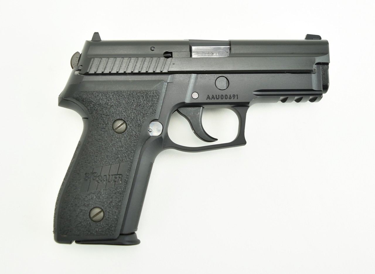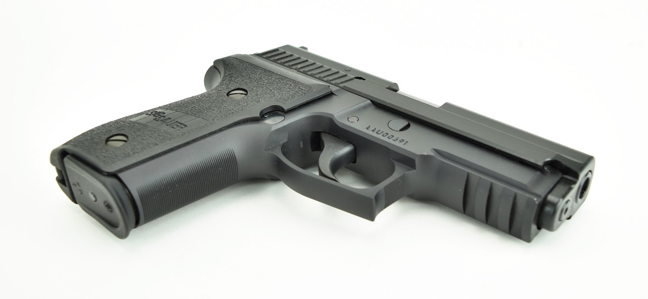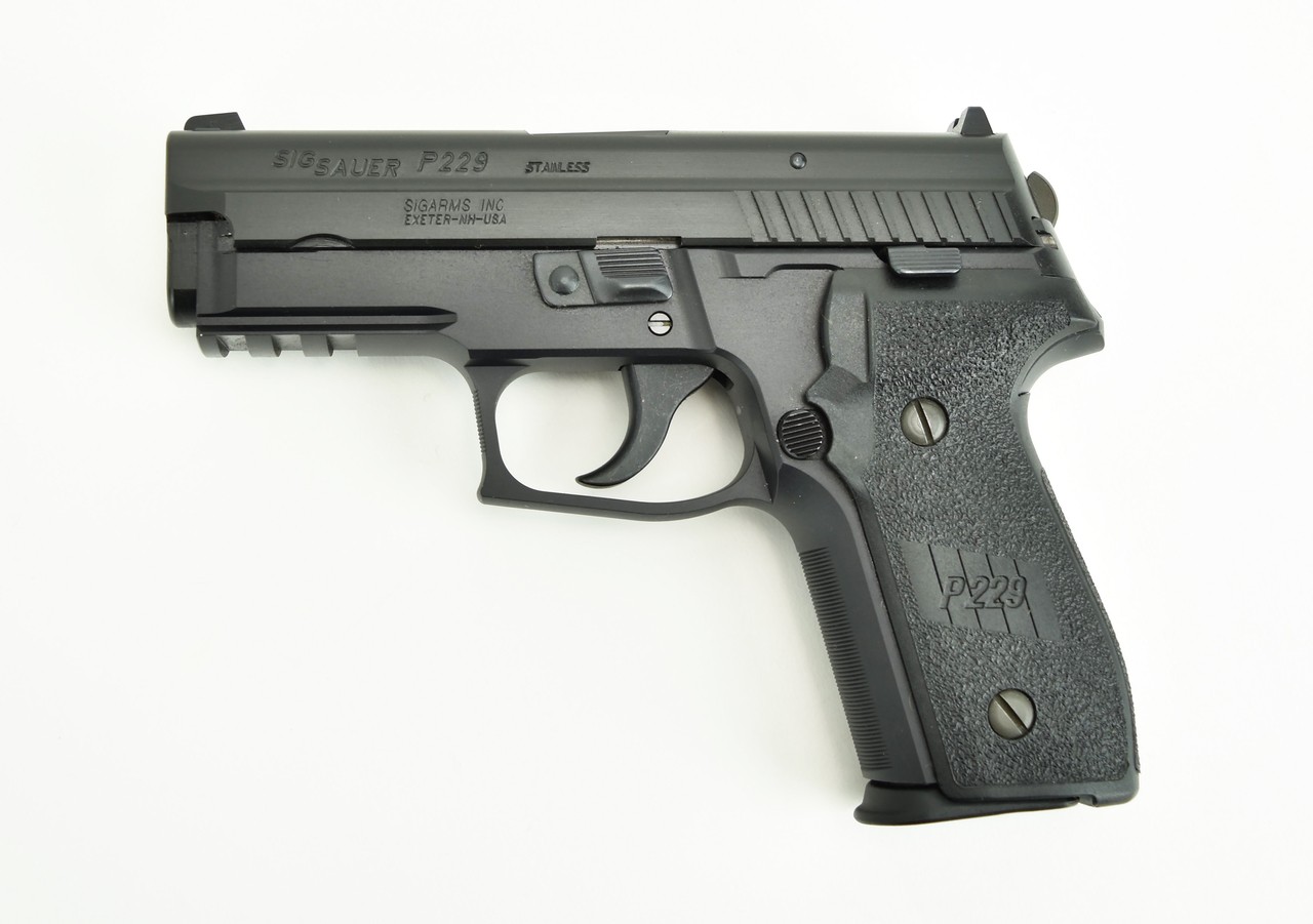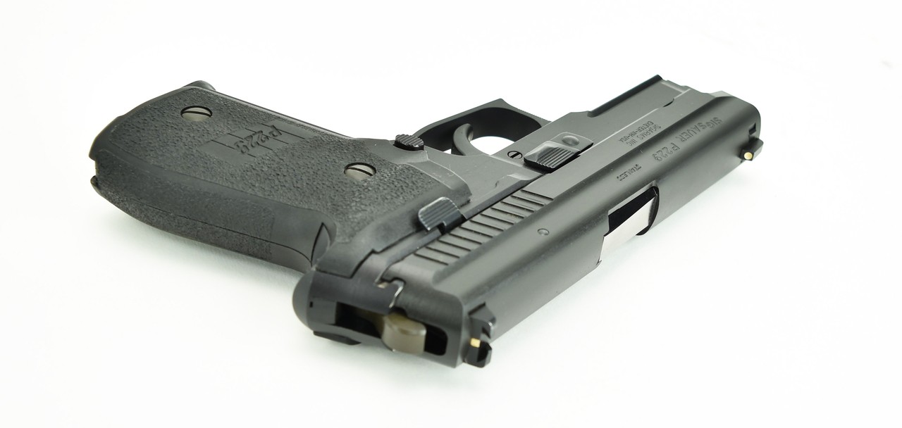 Sig Sauer P229 9mm caliber pistol. Compact model with dark trigger in excellent condition.