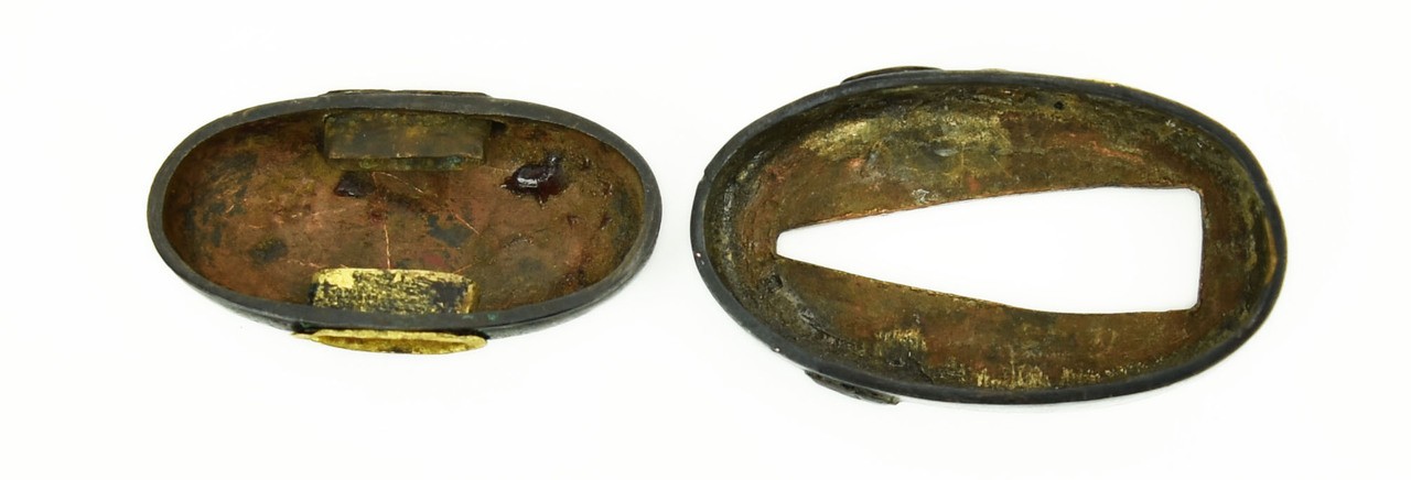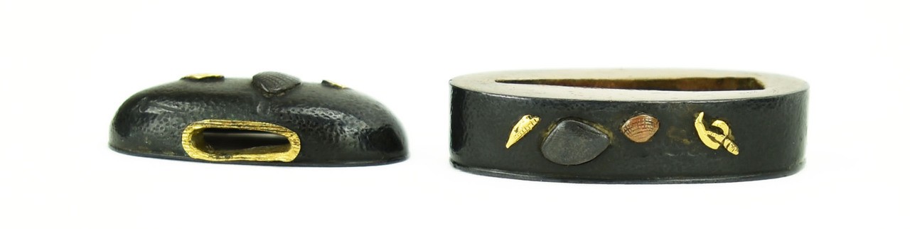 Fuchi Kashira Shakudo Ishime Seashell Motif in gold and copper. Very good condition.