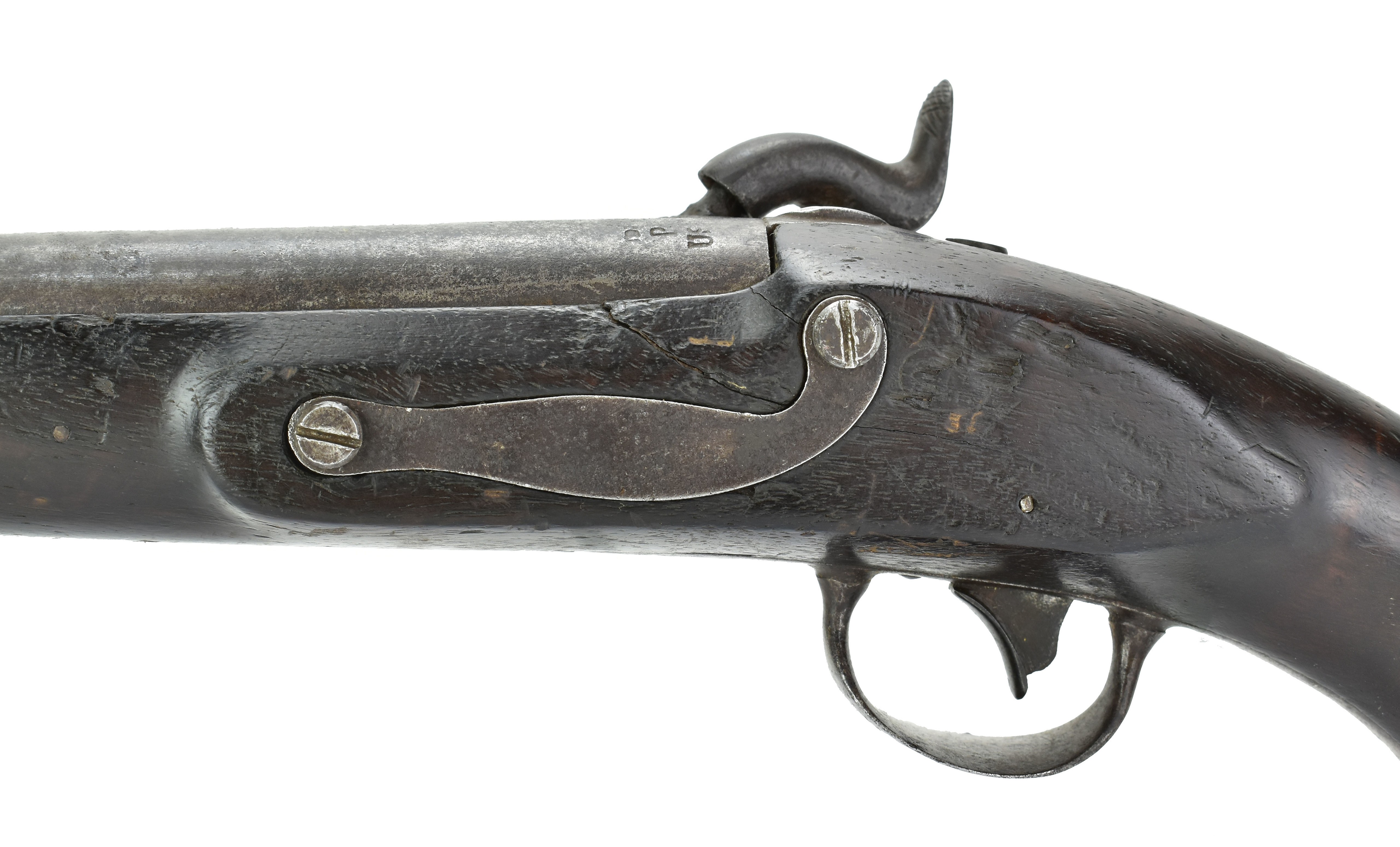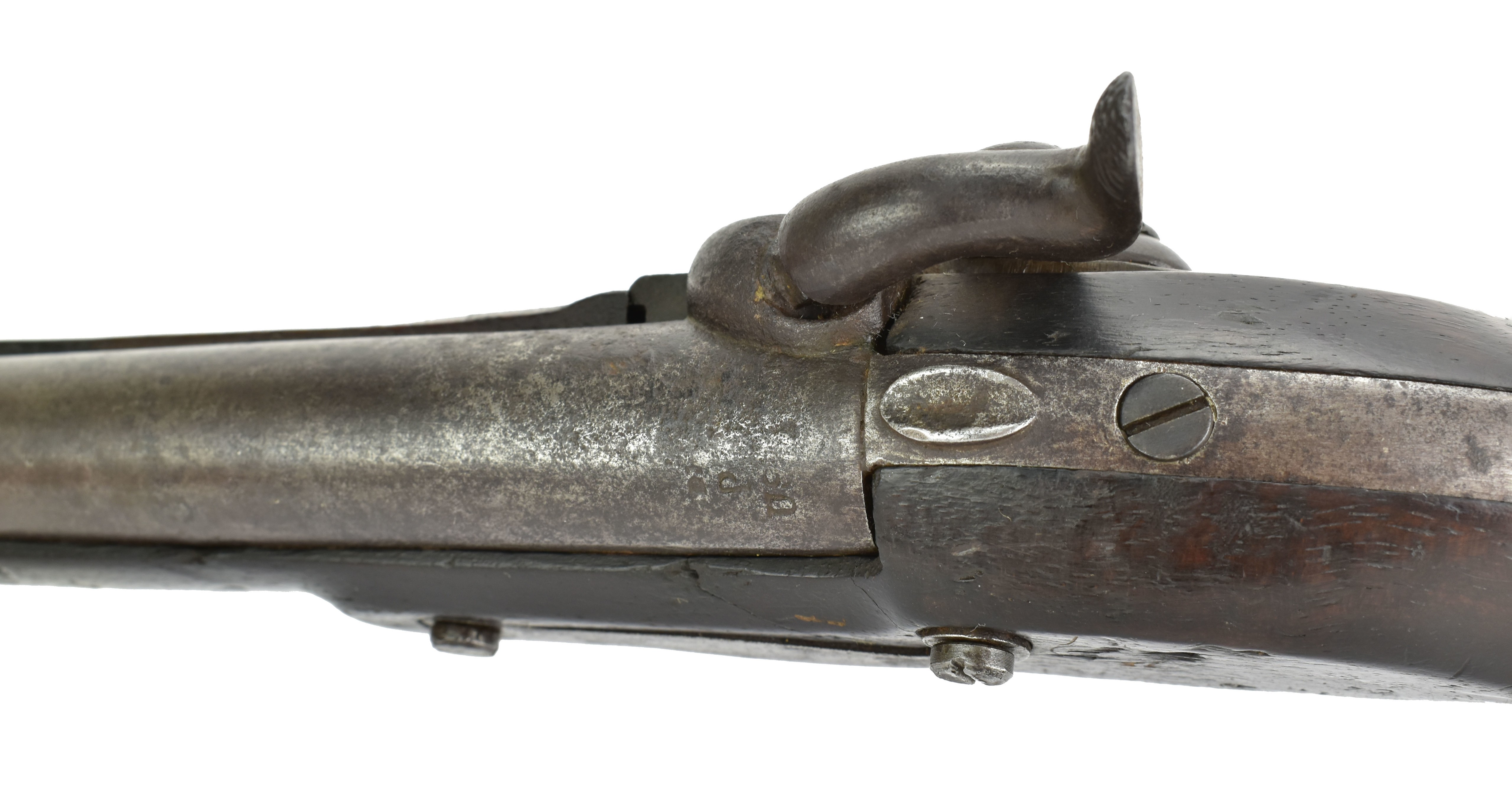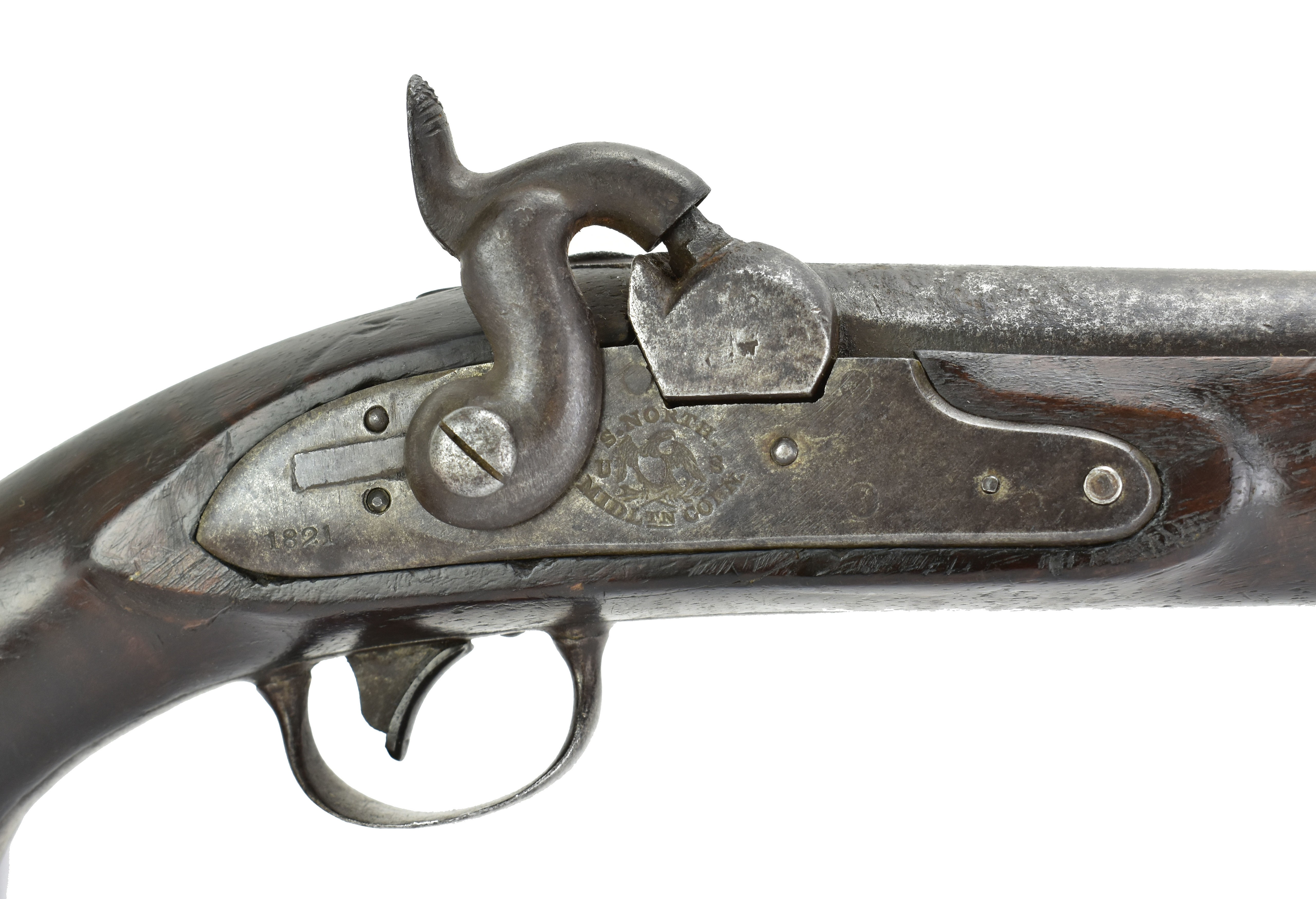 Simeon North Model 1819 Flintlock Pistol Converted to Percussion. Dated 1821 .54 Caliber smooth bore. Inspectors mark “W” on bolster. Also “JDJ US” on barrel at breech. Sliding hammer safety filled in, probably at time of conversion. Very well stamped lock markings with excellent eagle, shield and North Middleton, Connecticut marking. Action works perfectly. Left side of stock just behind the side plate is a partial inspector’s cartouche. Overall good plus condition.