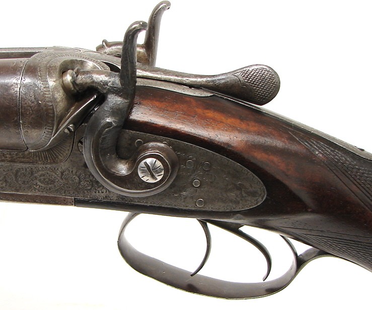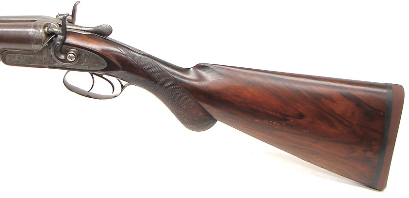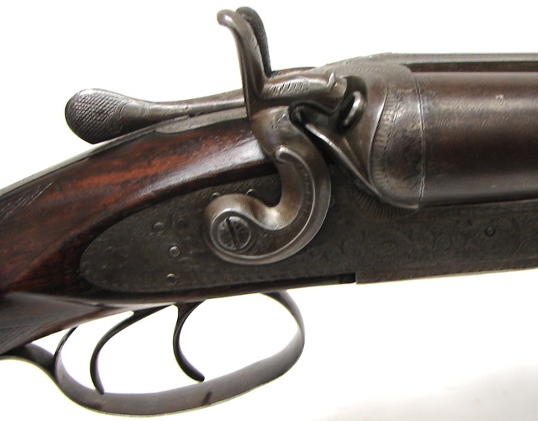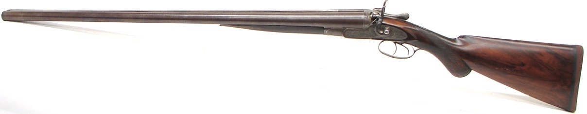 J.P. Clabrough & Bros. 10 gauge damascus barrel shotgun. Bores are rough in both barrels but could be honed to a better appearances. Frame is scroll and game scene engraved. Wood is sound with no cracks and is in very good condition pull is 14" barrels are 29 7/8" and measure full and improved modified. Note: This is black powder shotgun with Damascus barrels.