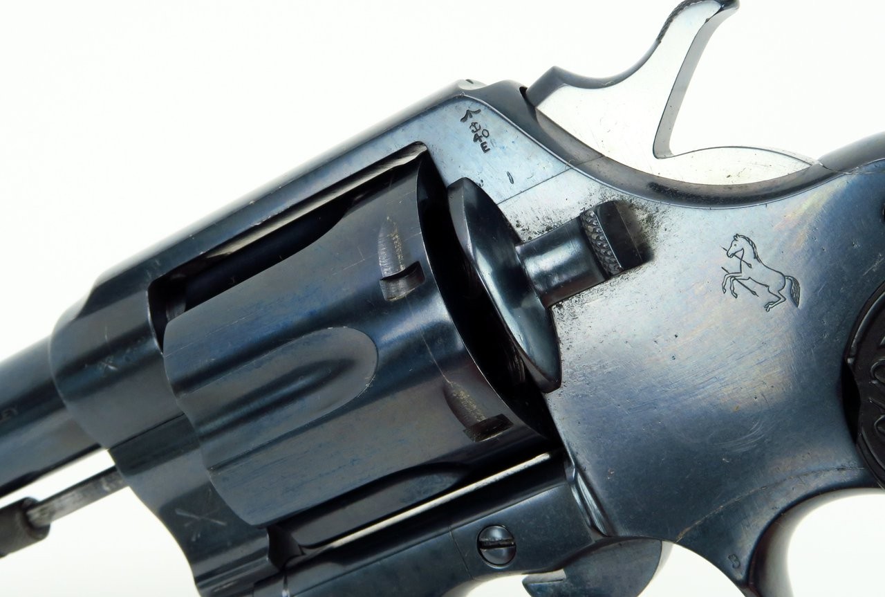 Colt New Service .455 Eley caliber revolver. British Military issue. Excellent bore, action works perfectly. Grips are about good to very good with some chips at the bottom edge. The British often refinished Colt and other guns when they were put into military service. This is a very nice English re-blue.