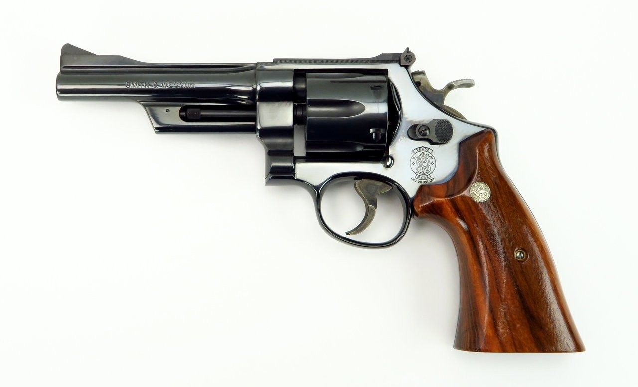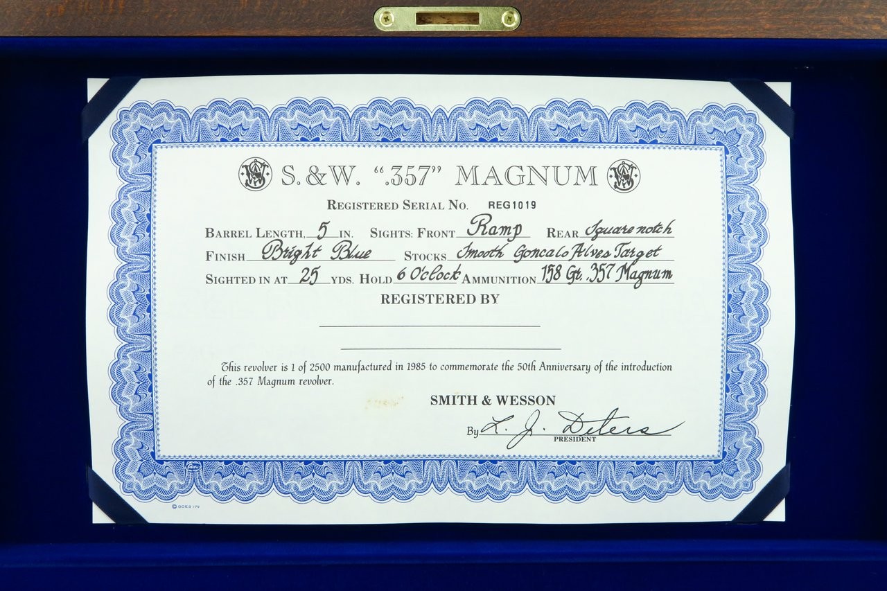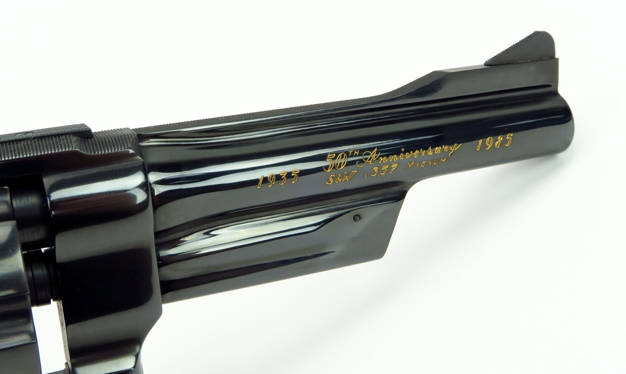 Smith & Wesson 27-3 .357 Magnum caliber revolver. 50th Anniversary Commemorative beautiful 5” blue model with smooth presentation grips. Has special anniversary markings. Only 2500 made in 1985. A beautiful piece presentation case, certificate, box and shipping carton.