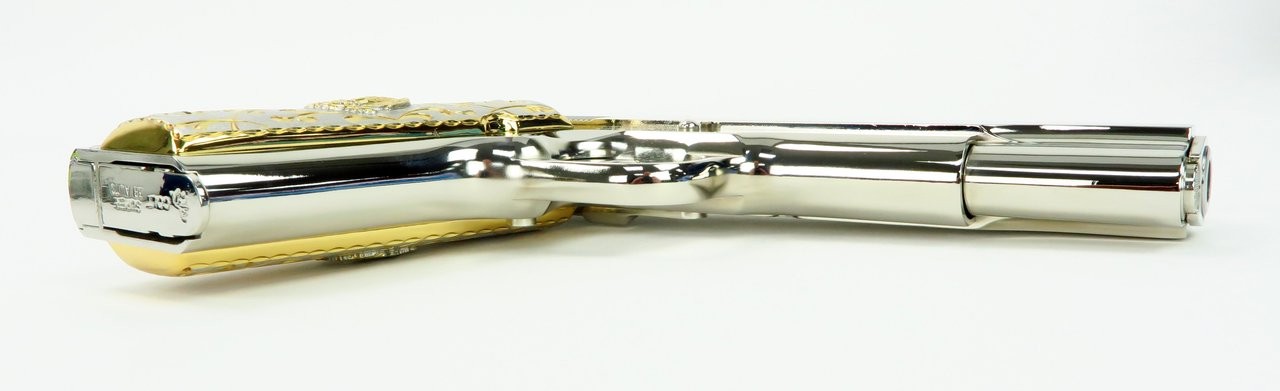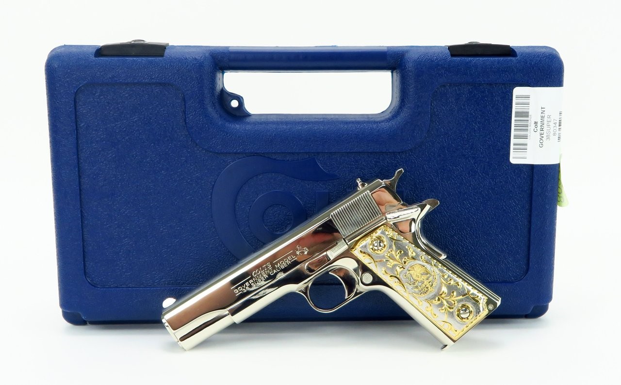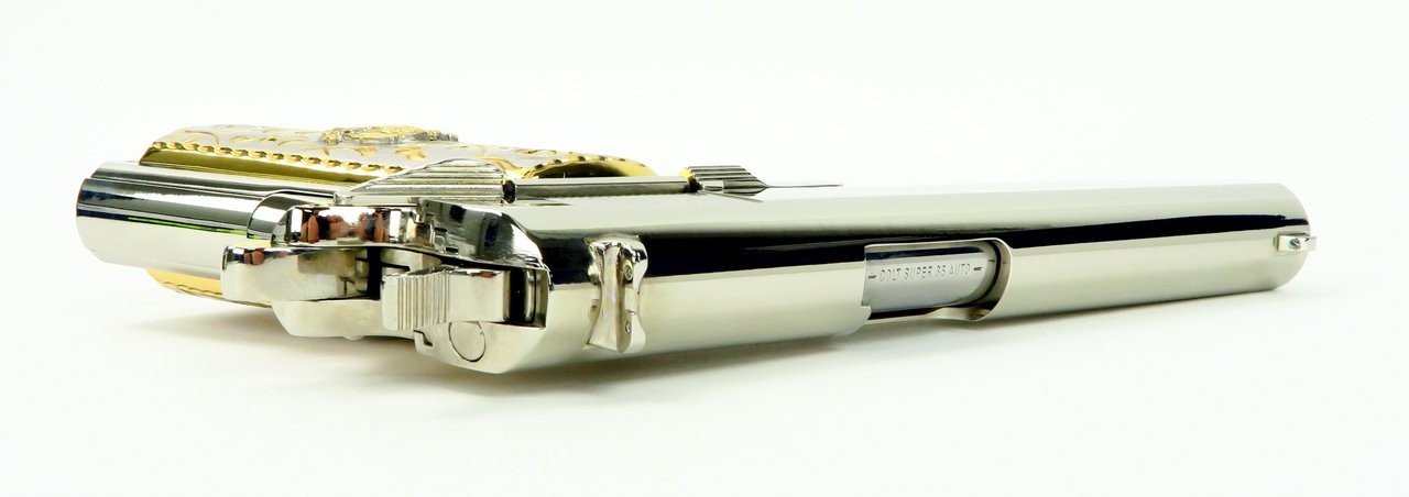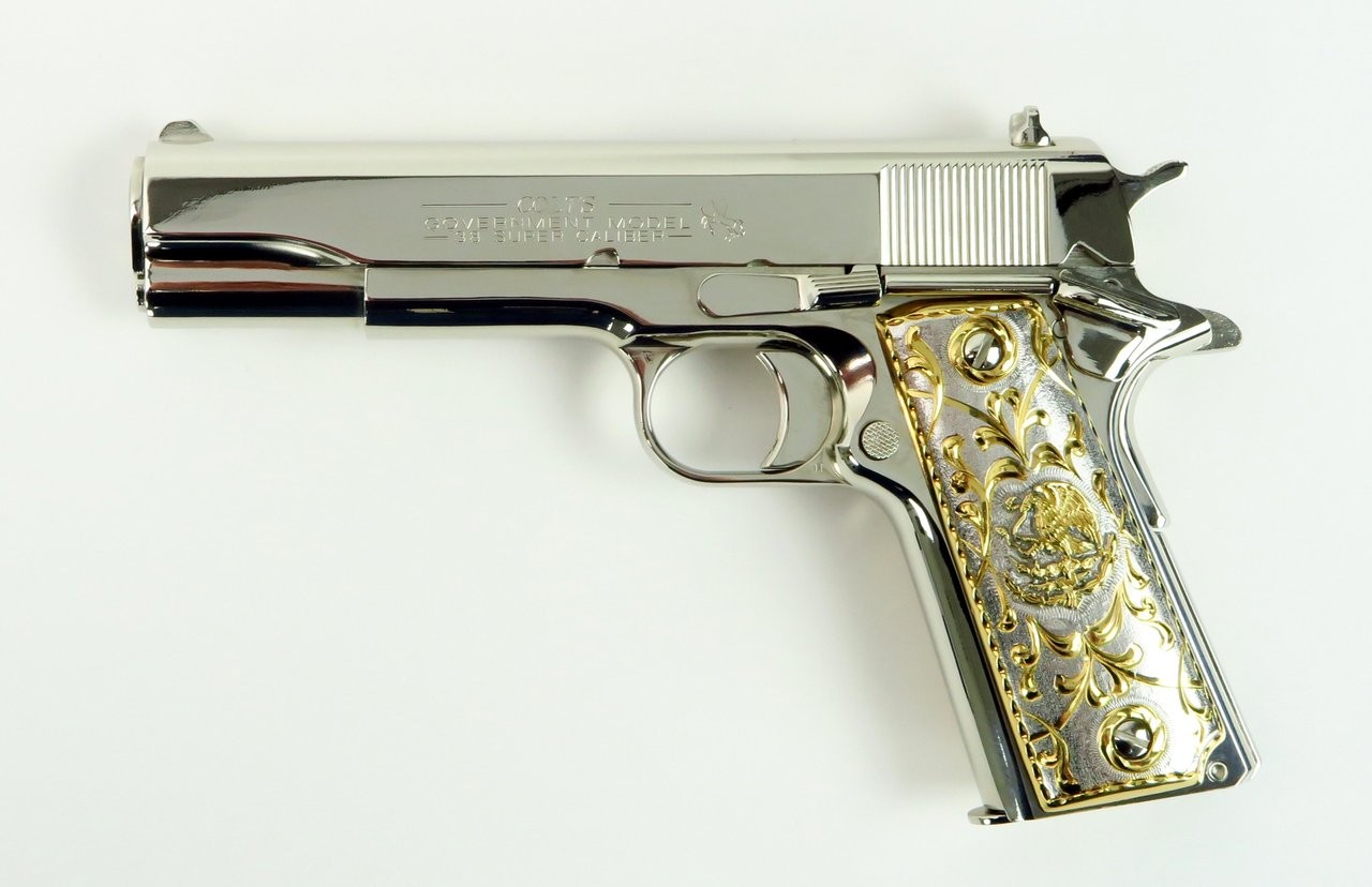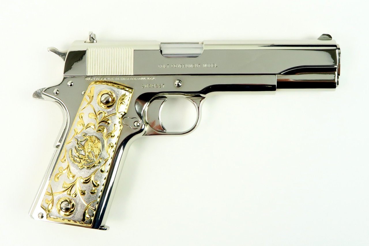 Colt Government .38 Super caliber pistol. Customized with bright nickel finish and Mexican eagle silver and gold plated engraved grips. A beautiful “carne asada” gun. New