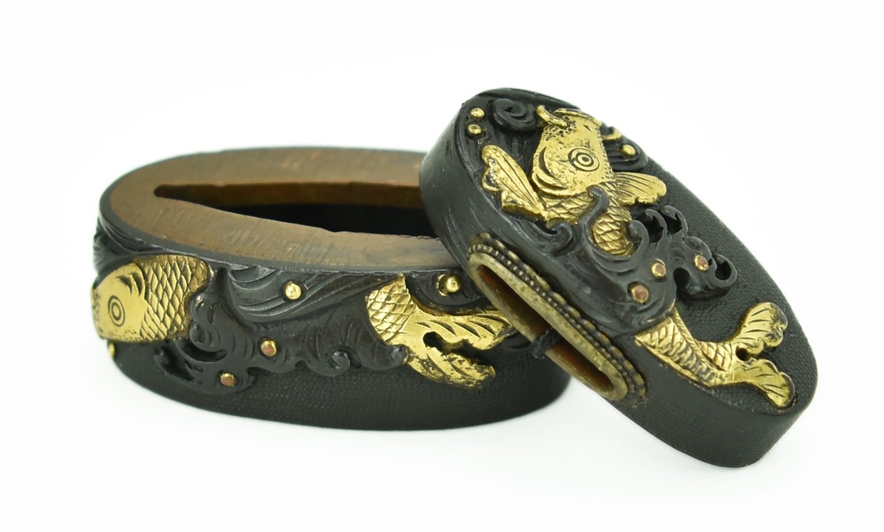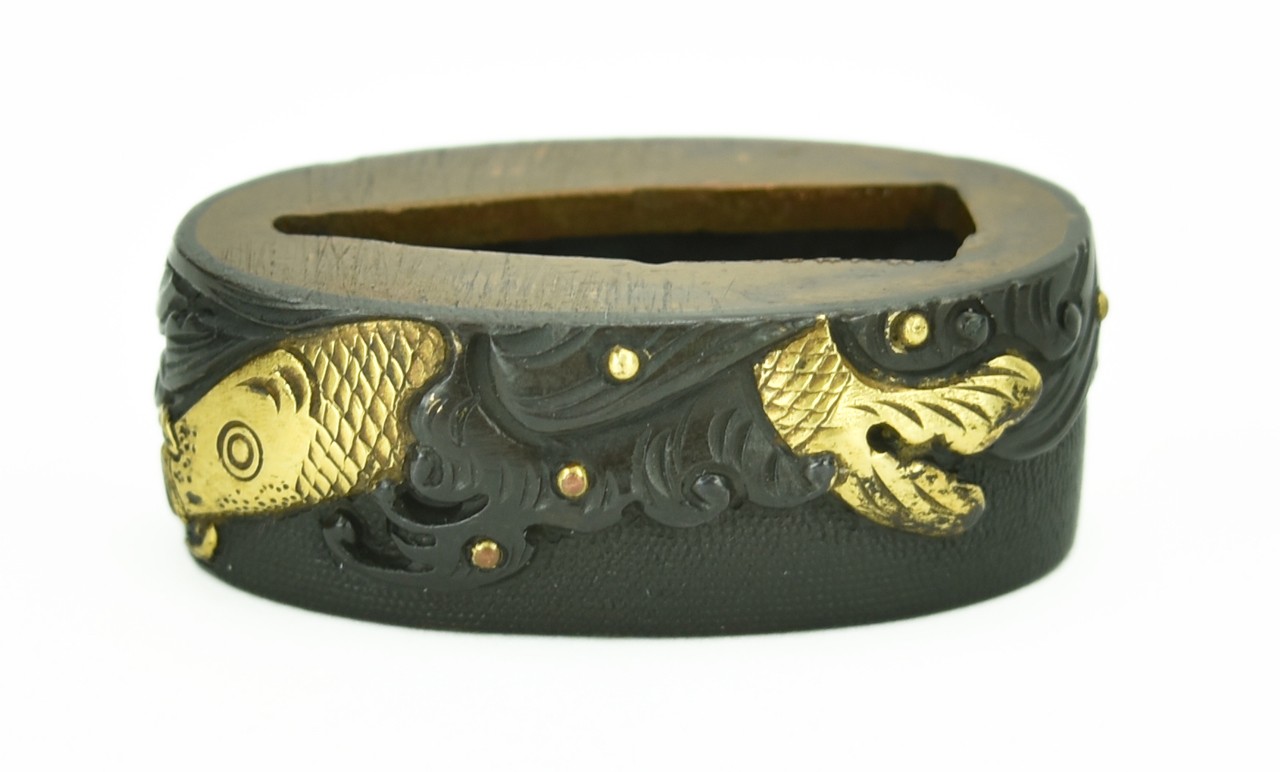 Fuchi Kashira gold Koi swimming in gold flecked waves. Unsigned. Shakudo Nanako ground. Excellent condition.